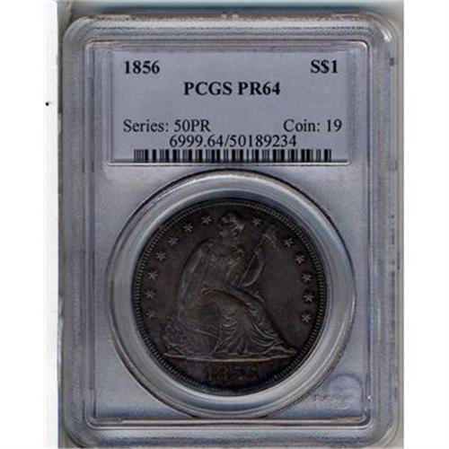 It is understood that the original mintage of the Proof 1856 Seated Dollar is somewhere on the order of 60-125 pieces. Of this total, no more than 40 coins are believed extant. The question remains whether or not Proof Silver Dollars of this date were restruck at a later time. Housed in PCGS holder 50189234. (#6999)