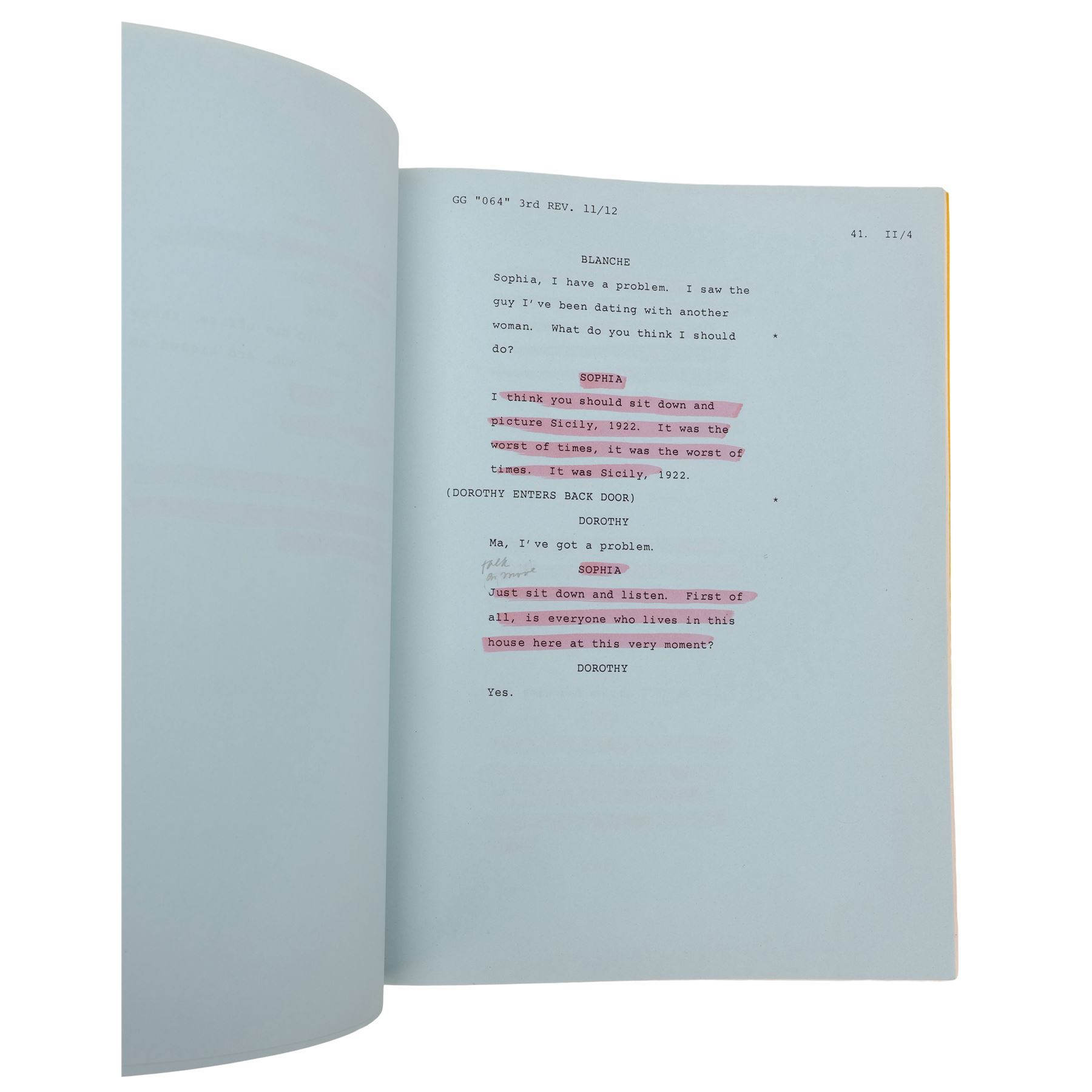 This lot comes from the collection of Estelle Getty's personal assistant and friend, Rich Weaver. It consists of one final draft script for Season 3's "Three on a Couch" signed "Estelle"; and seven final draft scripts including "The President's Coming! The President's Coming! Part One," "The President's Coming! The President's Coming! Part Two," and "Once, in St. Olaf." The scripts are labeled and marked for Getty with highlighting. This lot exhibits minor creases from handling and minor stains. Dimensions: (each) 8.5" x 11" x 0.25" (21.75 cm x 28 cm x 0.75 cm)