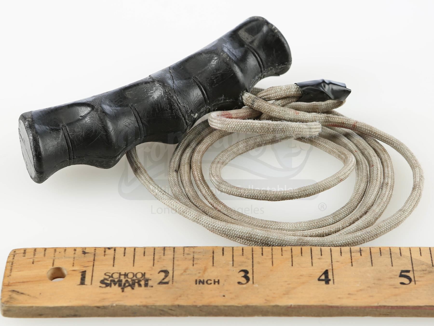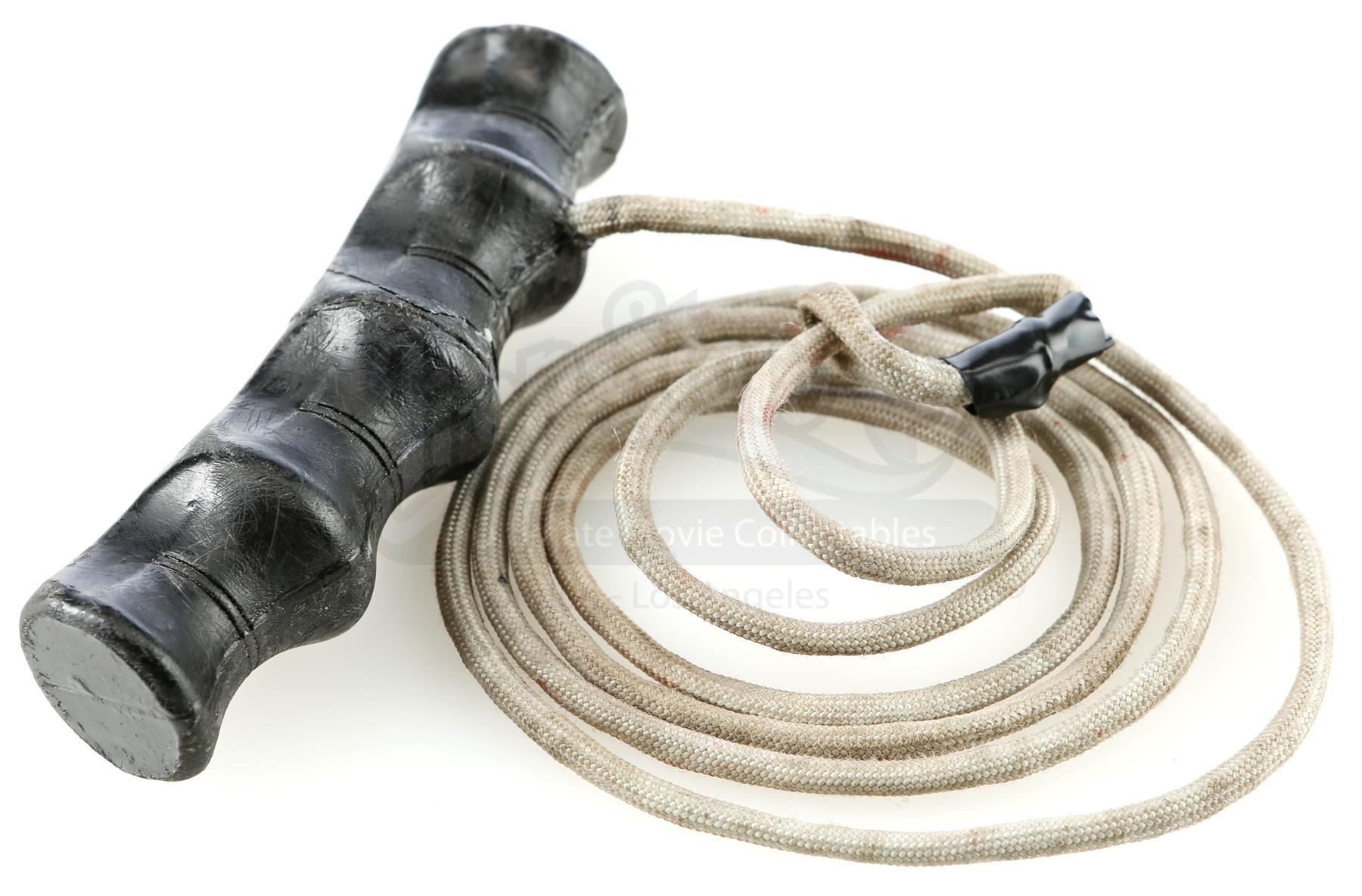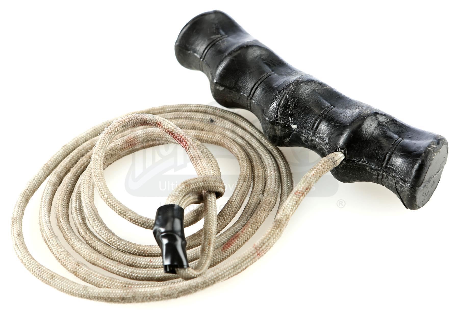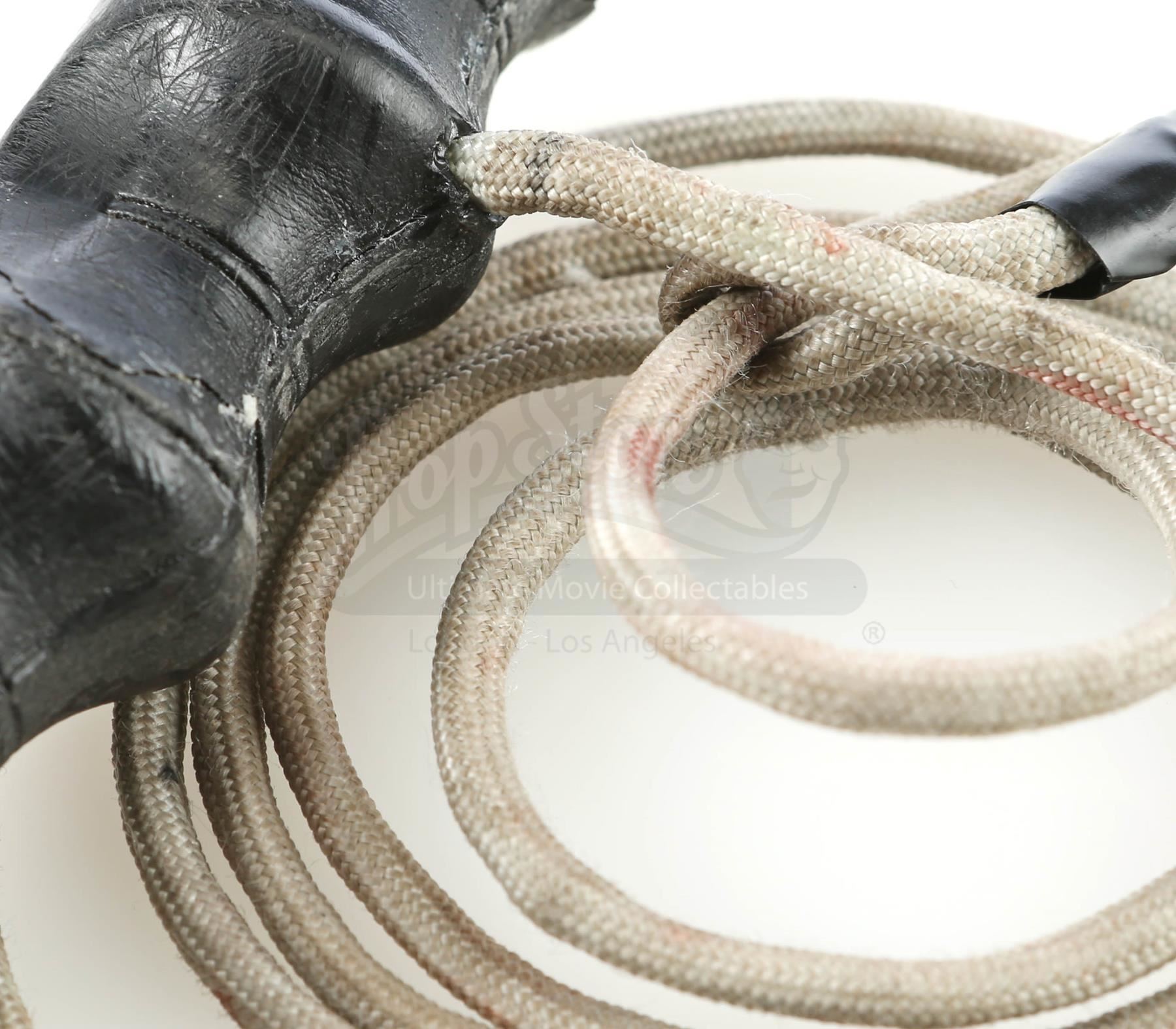Mary Walker’s rope snare from the episode ‘Target: Iron Fist’ (204) of Marvel’s Iron Fist. In the episode, Walker ensnares Danny Rand with rope during their battle on the subway. This lot consists of a black plastic grip attached to a gray nylon rope with black tape used to create a loop. It is in good overall condition with some signs of wear from production, including faux blood stains on the rope.