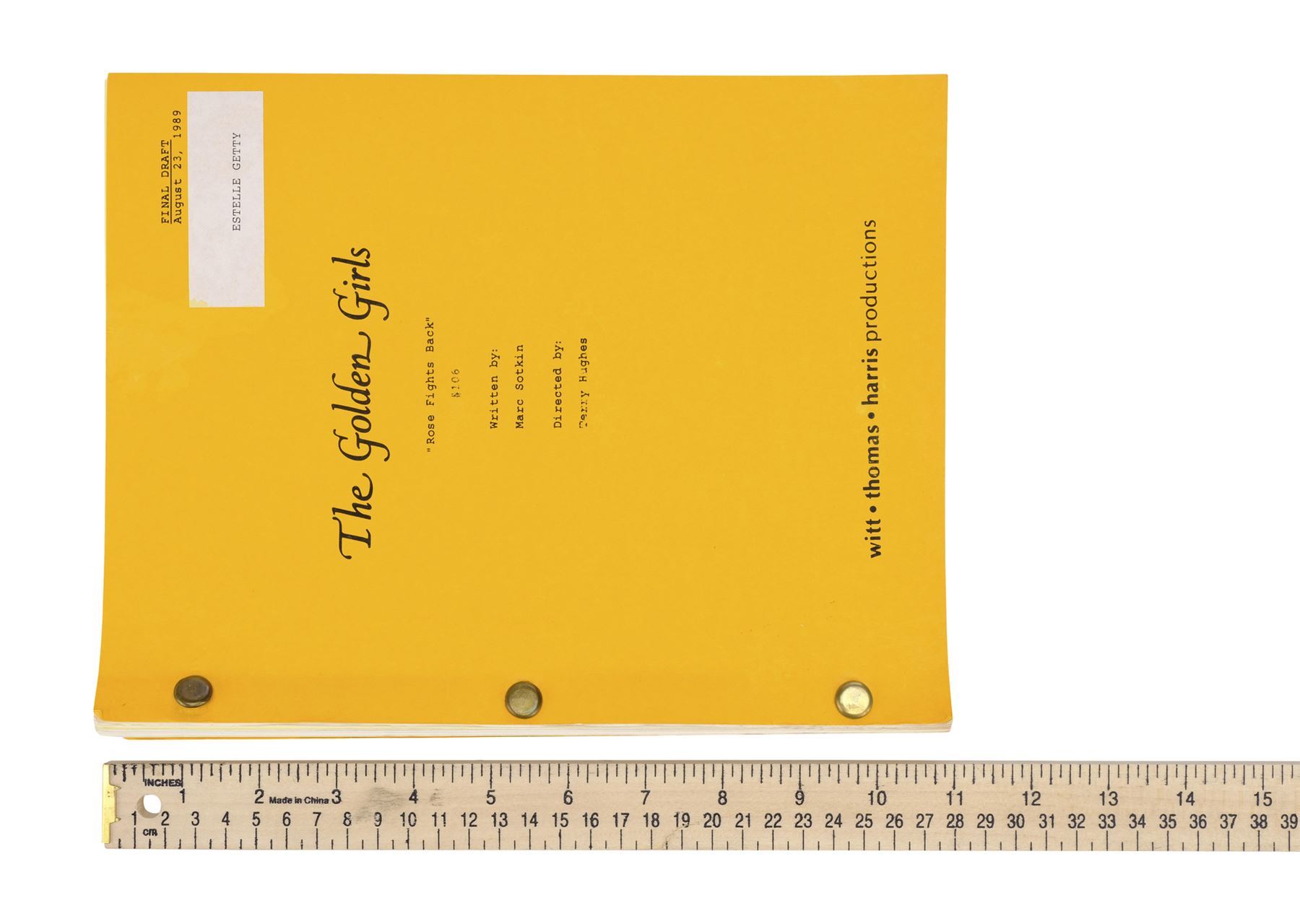 This lot comes from the collection of Estelle Getty's personal assistant and friend, Rich Weaver. It consists of one final draft script for Season 2's "Son-In-Law Dearest" signed "Estelle"; and seven final draft scripts for the episodes "Love Under the Big Top," "Love, Rose," "Family Affair," "Rose Fights Back," "Not Another Monday," "That Old Feeling," and "Dancing in the Dark." The scripts are labeled and marked for Getty with highlighting. This lot exhibits minor creases from handling and minor stains. Dimensions: (each) 8.5" x 11" x 0.5" (21.75 cm x 28 cm x 1.5 cm)