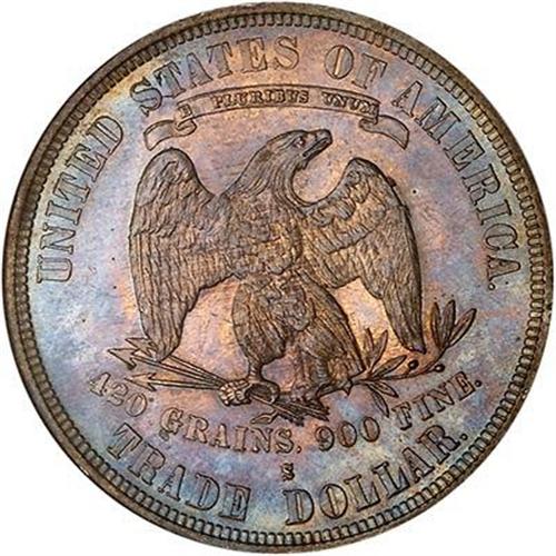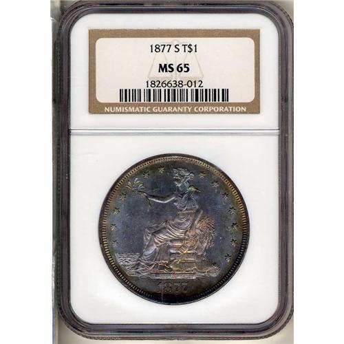 1877-S Trade Dollar. Silver Dollars had never been popular with Easterners, who had stubbornly refused to lug such bulky coins around with them in their pockets and change purses. And yet, the Mint kept right on striking them. That is, they were made annually until 1873, when Congress passed the Act of 1873 demonetizing Silver Dollars (at the time, Seated Dollars). Instead, a new Trade Dollar was substituted. The Trade Dollar was meant to circulate in the Far East, specifically in the China trade, which then was burgeoning.