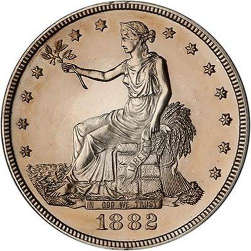 1882 Trade Dollar. A burnished pale brown toned Proof whose crisp strike is finely detailed on Liberty and the eagle, with only a coupule of the upper stars showing rounded feathers. The obverse is extensively hairlined. The proofs of 1879-83 are well-liked because they are Proof-only issues struck in a period when Congress was slowly getting around to abolishing the series (which didn't occur until 1887 even though the last so-called business strikes were minted in 1878). (#7062)