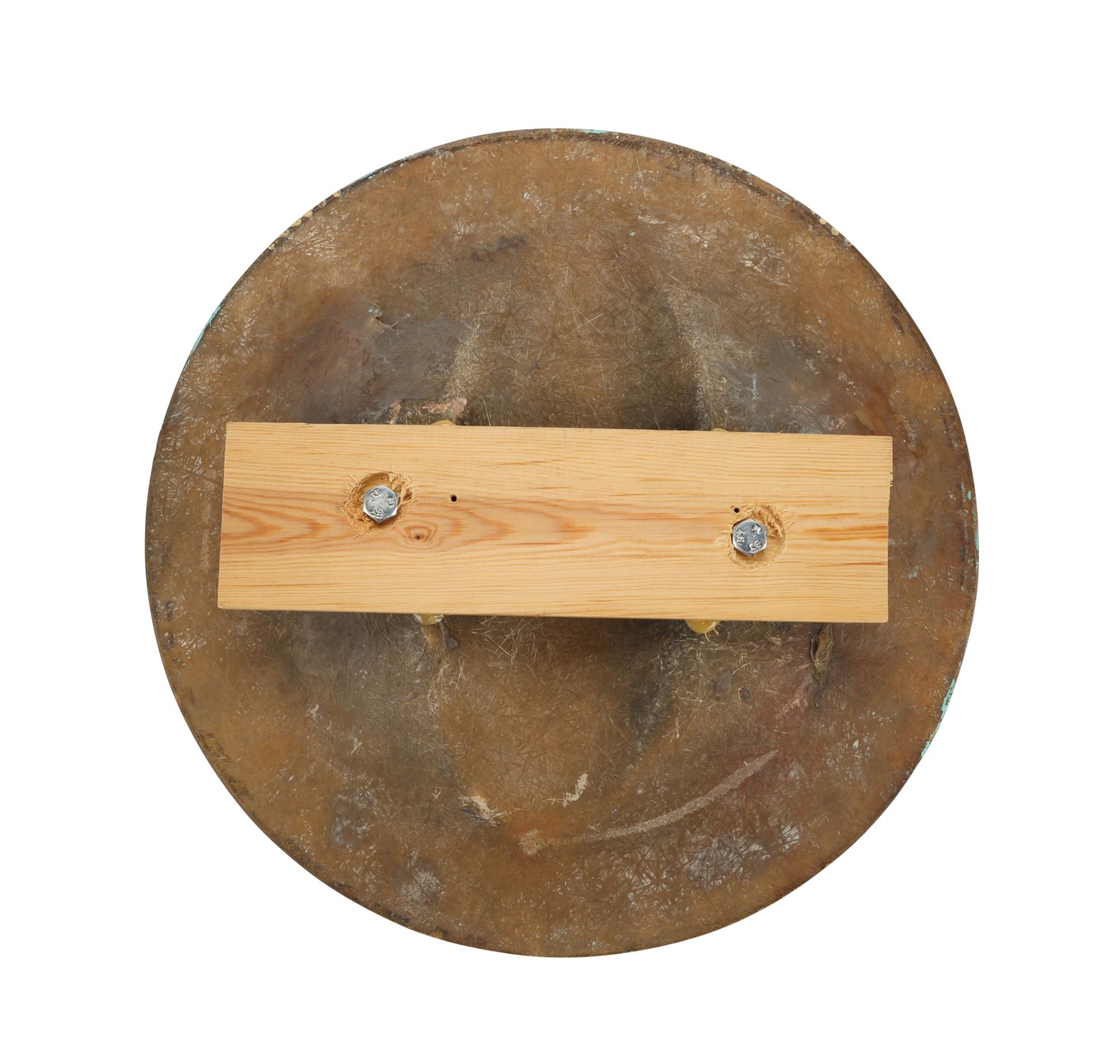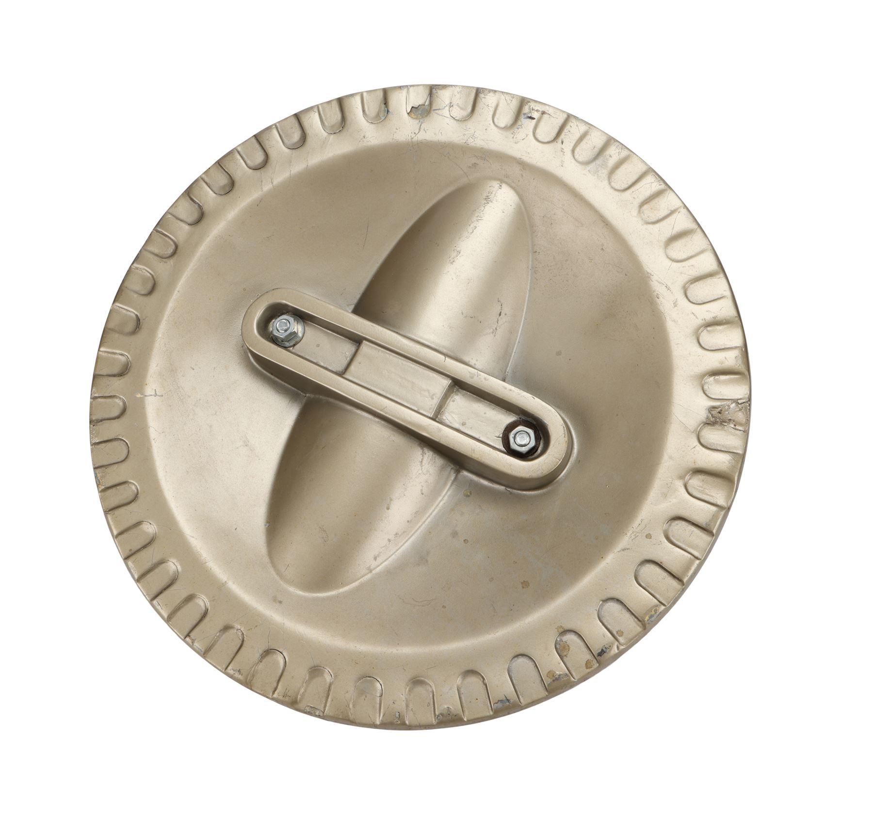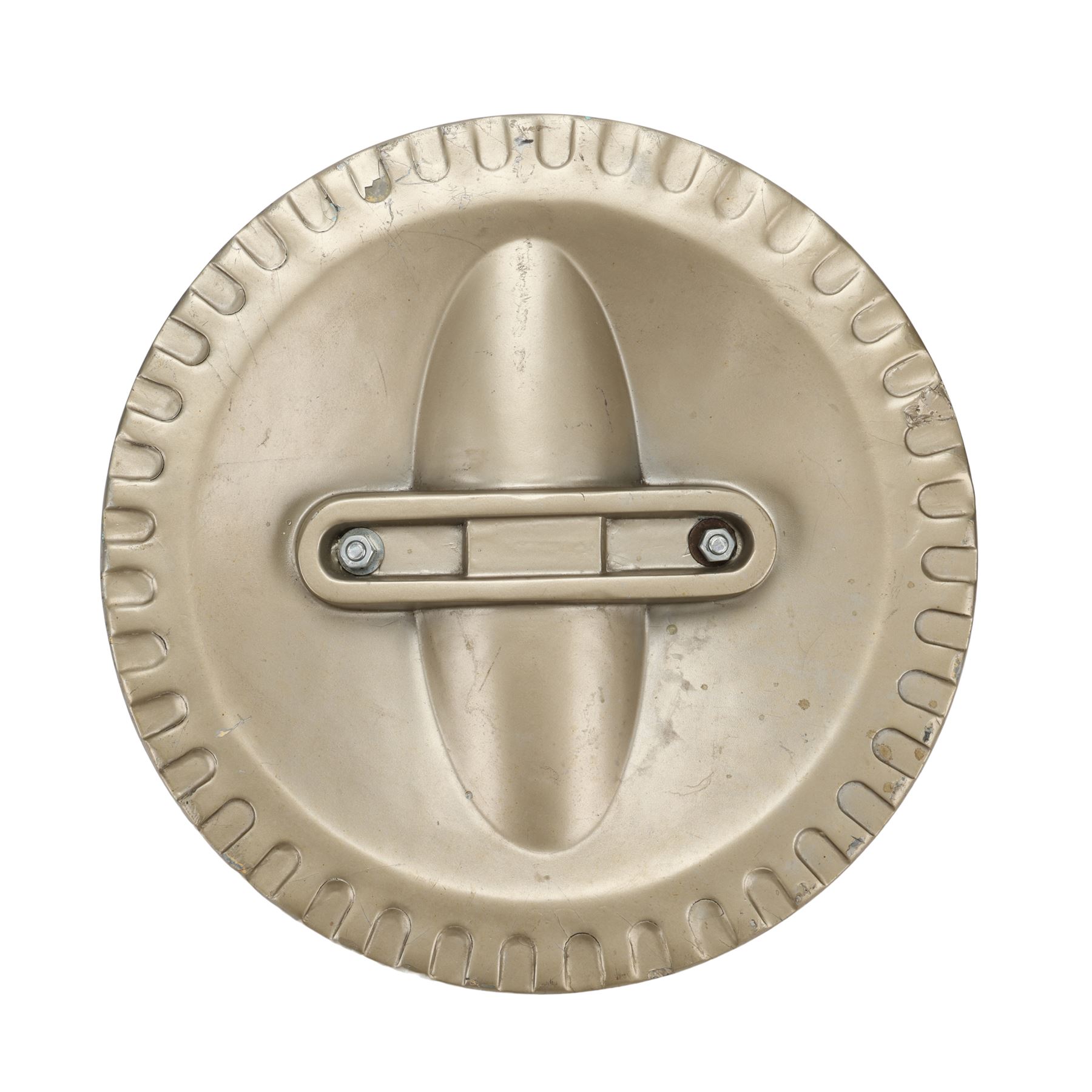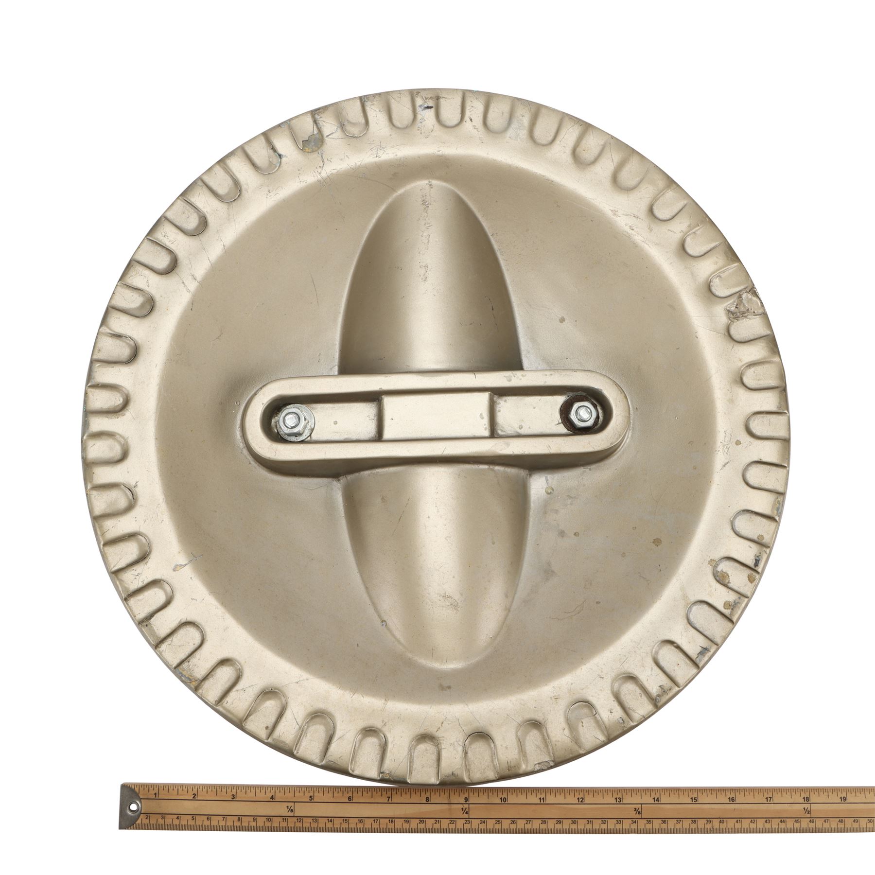 Made of resin, the disc-shaped concavo-convex hubcap is painted silver and features oval indentations around its edge. A ridged oblong protuberance at its centre has dual screws that were used by Winfield to connect the hubcap to the sedan. They now attach the piece to a wooden base on the reverse. The lot exhibits minor signs of wear from production use and age, including stains, scuffs and fissures, but it remains in good condition. It comes with a letter of authenticity from Winfield. Dimensions: 46 cm x 46 cm x 7 cm (18" x 18" x 2 3/4")