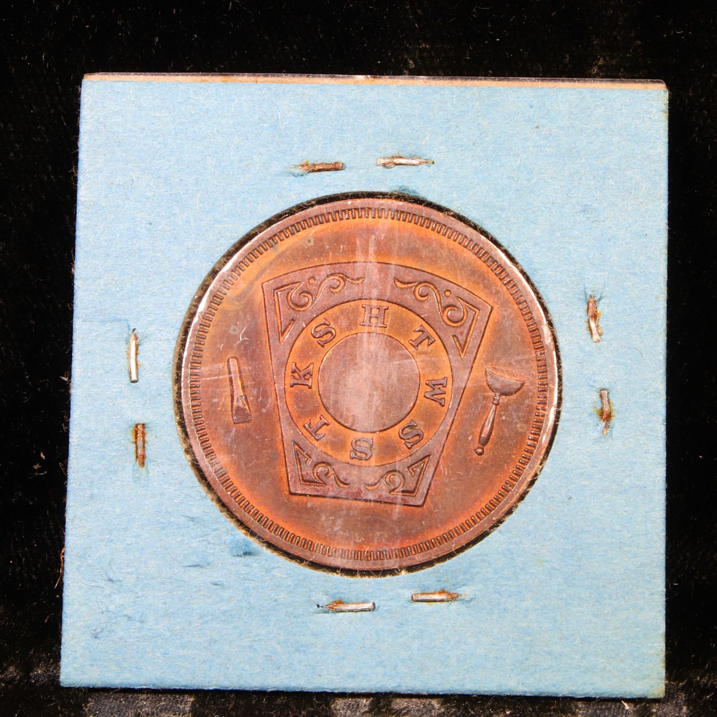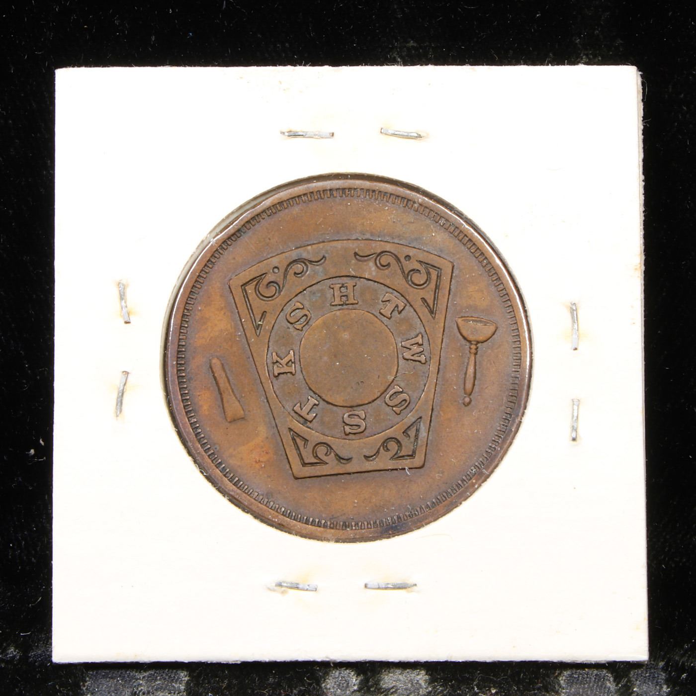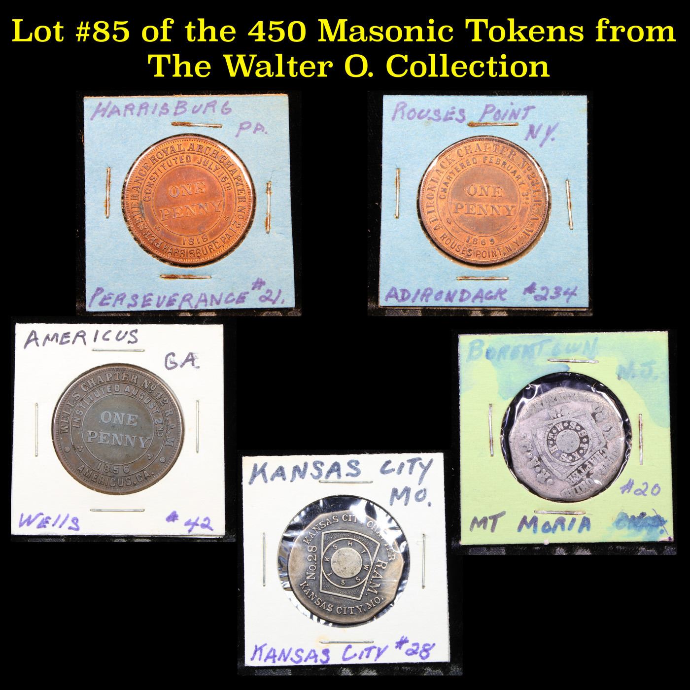Lot #85 of the 450 Masonic Tokens from The Walter O. Collection. We Recently received a very Large Collection of 450 Masonic Tokens and coins. This collection was one man’s hobby for over 40 years. He collected each and every one with care and attention to detail and variety. Some of them are amazing and incredibly rare and highly sought by collectors and Masons. Here is a Brief Overview : Masonic coins often raise many questions for those looking to better understand the significance of the coins themselves as well as the symbolism represented in their imagery. In fraternal culture as a whole, symbolism has always been a significant part of these organizations’ identity, especially in Freemasonry, as Masonic coins are rich with symbolism, reflecting different events and characteristics of Freemasonry that give them the priceless value they hold. There are several varieties of masonic coins and tokens, and all tokens will fall into one of the following categories: a token celebrating a particular mason, lodge or event; an initiation token showing when a Brother was initiated, passed and raised; and finally the mark mason token (or penny) which signifies a pivotal part of a Mason’s initiation. Because symbolism was so important to fraternal culture, these small coins are rife with meaning. The most ubiquitous representation of the Masons was the letter "G" surrounded by a compass and square, representing the holy geometry of God. Some tokens feature the letters "H.T.W.S.S.T.K.S.," which means "Hiram the Widow's Son Sent to King Solomon," the biblical story that must be acted out to reach the third, or Master's Degree, in Freemasonry. Additionally, many contain either Apron and gloves: These symbols stand for living with a pure heart and to keep one’s hands clean. All-seeing eye: This symbol is designed to remind Masons that God and others always see their thoughts and actions. Ashlars: You may see rough and smooth ashlars on Masonic coins. They are to remind Masons of the contrast between man’s natural state and perfection and the Level: This symbol found on some Masonic coins reminds Masons that everyone is equal before God. We have broken the set up into groups of 5 Tokens in each lot. We have put 5 Lots per night over the 18 Nights of the Spring Auctions.