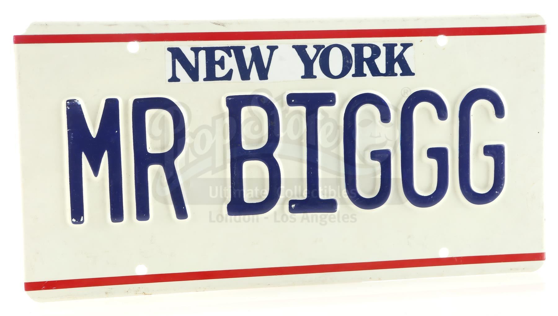 The white plastic New York license plate reads "MR BIGGG" and features four holes for affixing to a vehicle. It is in good overall condition with some scuffing from production.