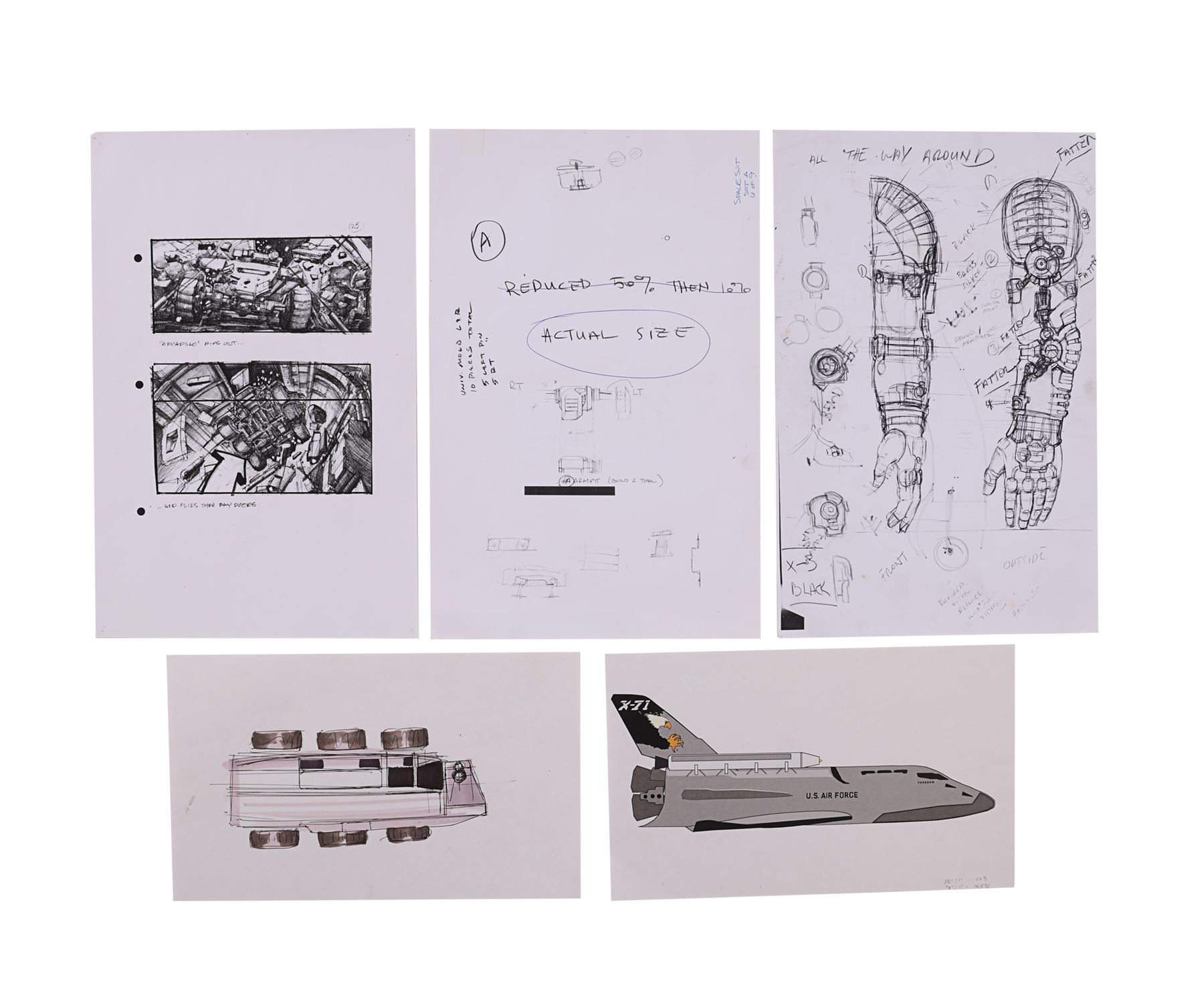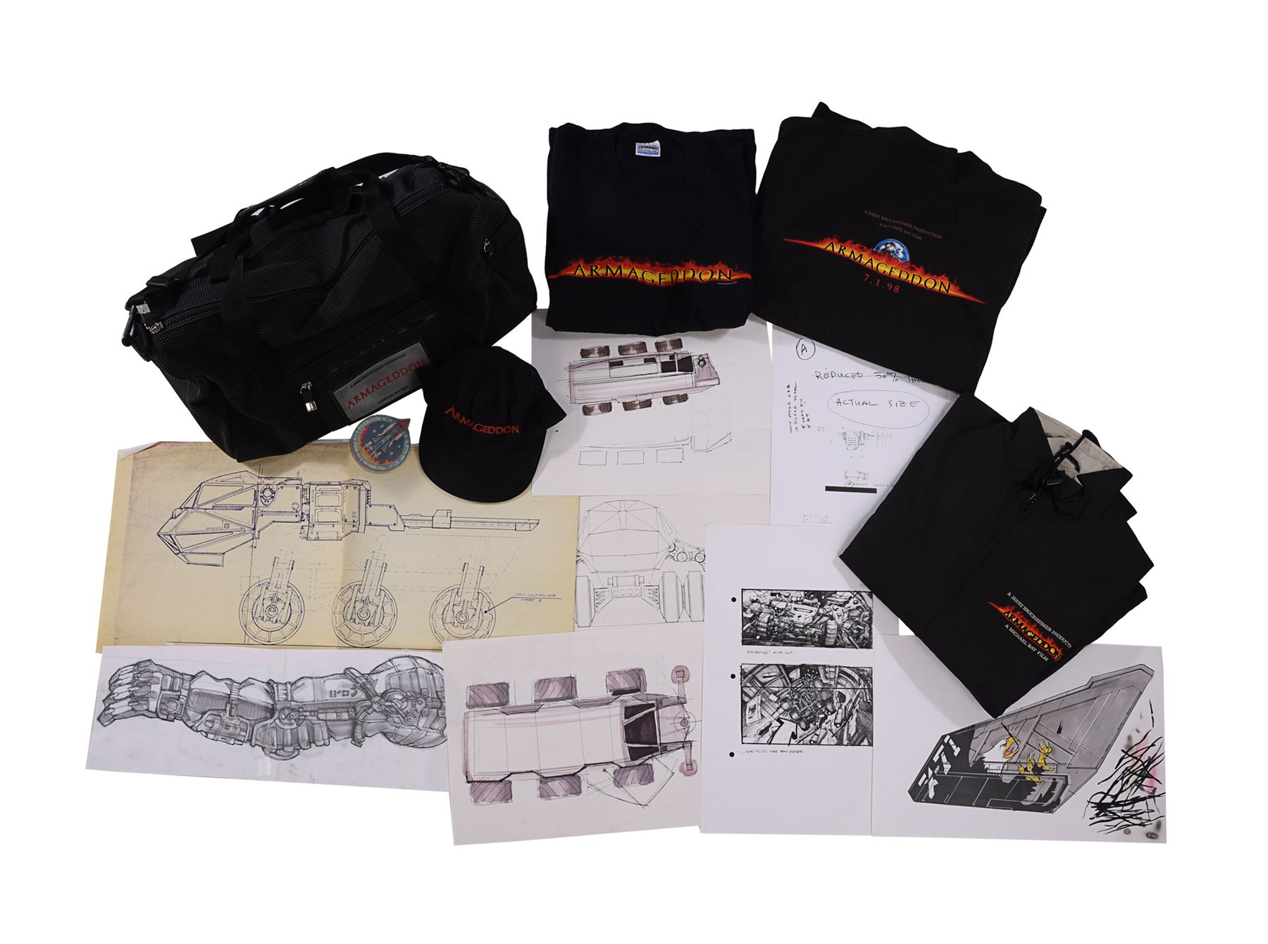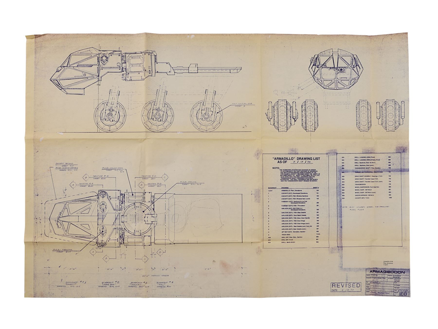 Artwork, a blueprint, crew items and Harry's (Bruce Willis) patch from the production of Michael Bay's sci-fi disaster film Armageddon. The artwork is a mix of hand-drawn and printed pieces, some of which are hand-annotated, featuring spacesuits, the shuttles and the Armadillo rover, for which there is also a large blueprint.