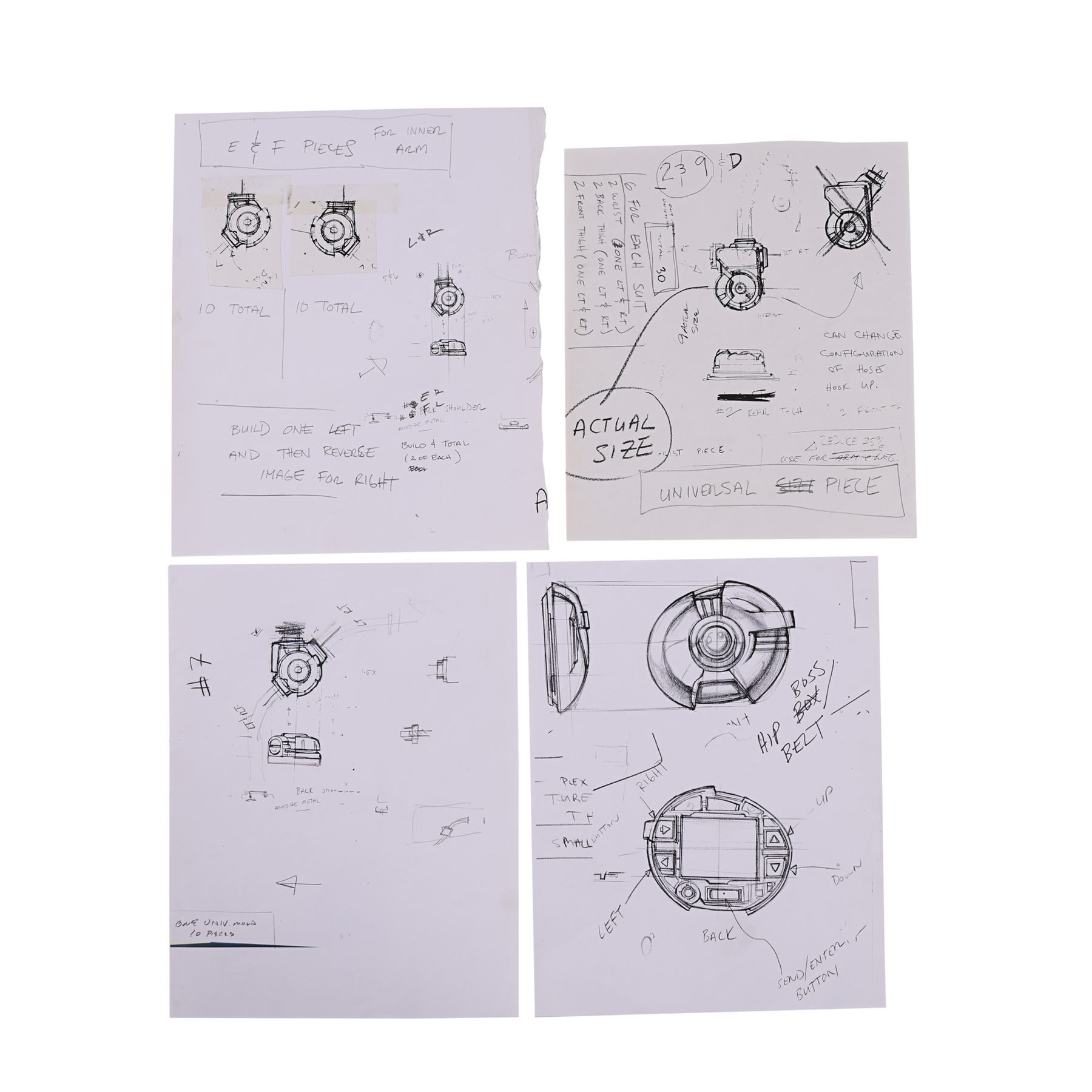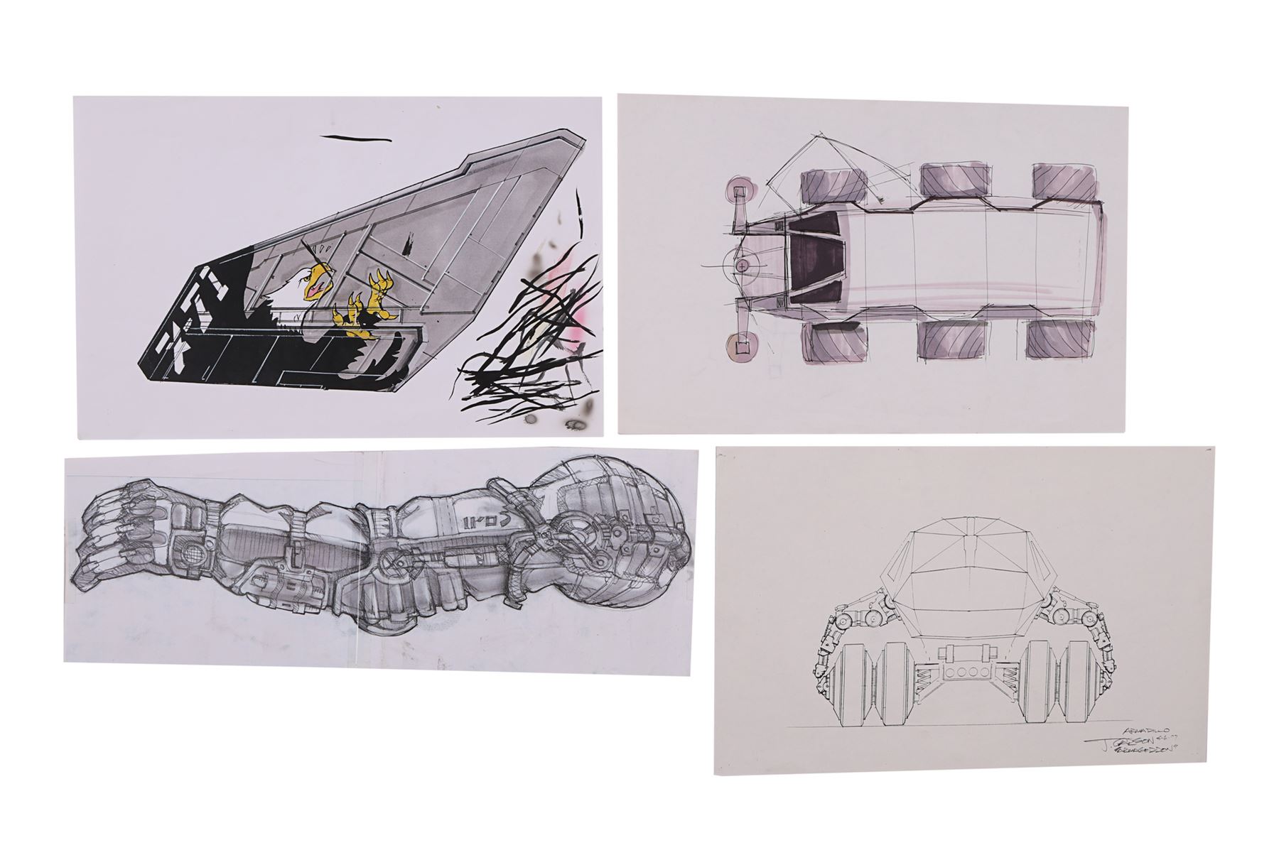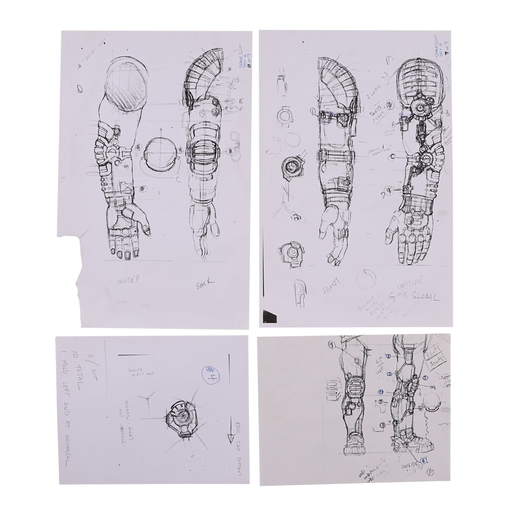 Artwork, a blueprint, crew items and Harry's (Bruce Willis) patch from the production of Michael Bay's sci-fi disaster film Armageddon. The artwork is a mix of hand-drawn and printed pieces, some of which are hand-annotated, featuring spacesuits, the shuttles and the Armadillo rover, for which there is also a large blueprint.