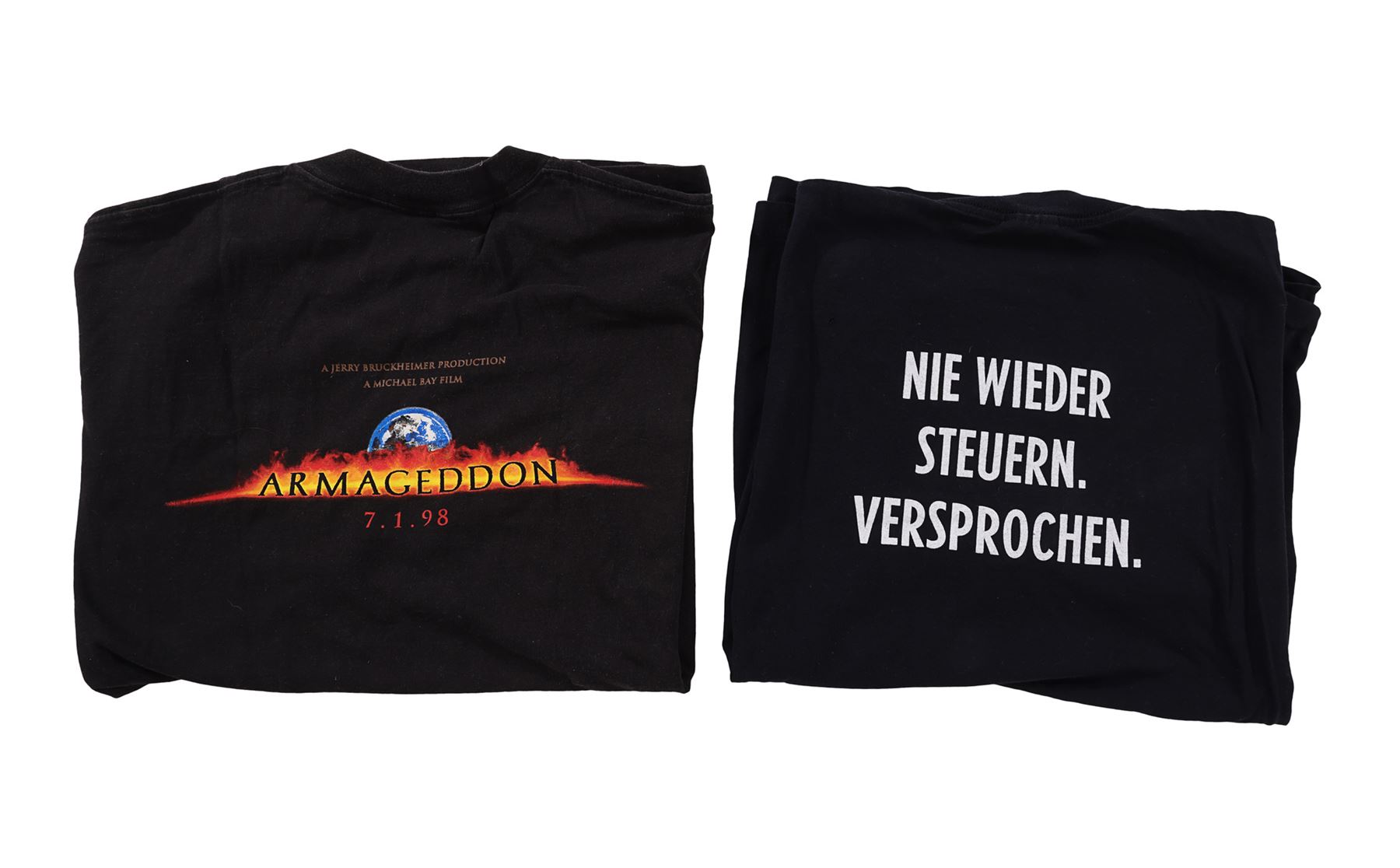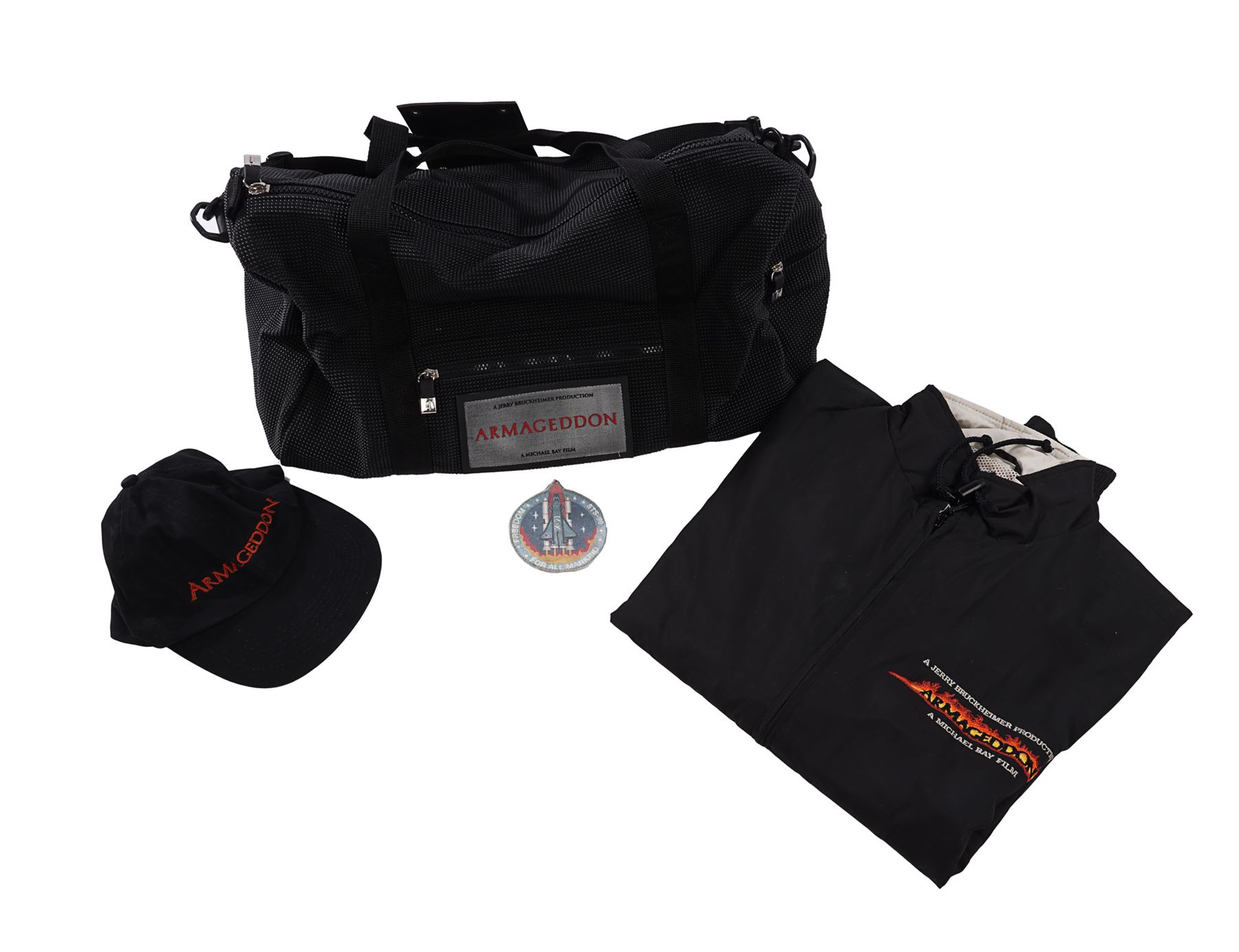 Also included is a crew bag, a crew jacket (size "L"), two crew T-shirts (both "XL"), a crew cap and Harry's "Freedom" shuttle patch. Harry ripped his patch off his spacesuit just before his sacrifice, and asked A.J. (Ben Affleck) to give it to Truman (Billy Bob Thornton). Some of the crew items have minor staining, and some of the production artwork has edge wear and minor tears.Dimensions (blueprint open): 76.5 cm x 109 cm (30" x 43")