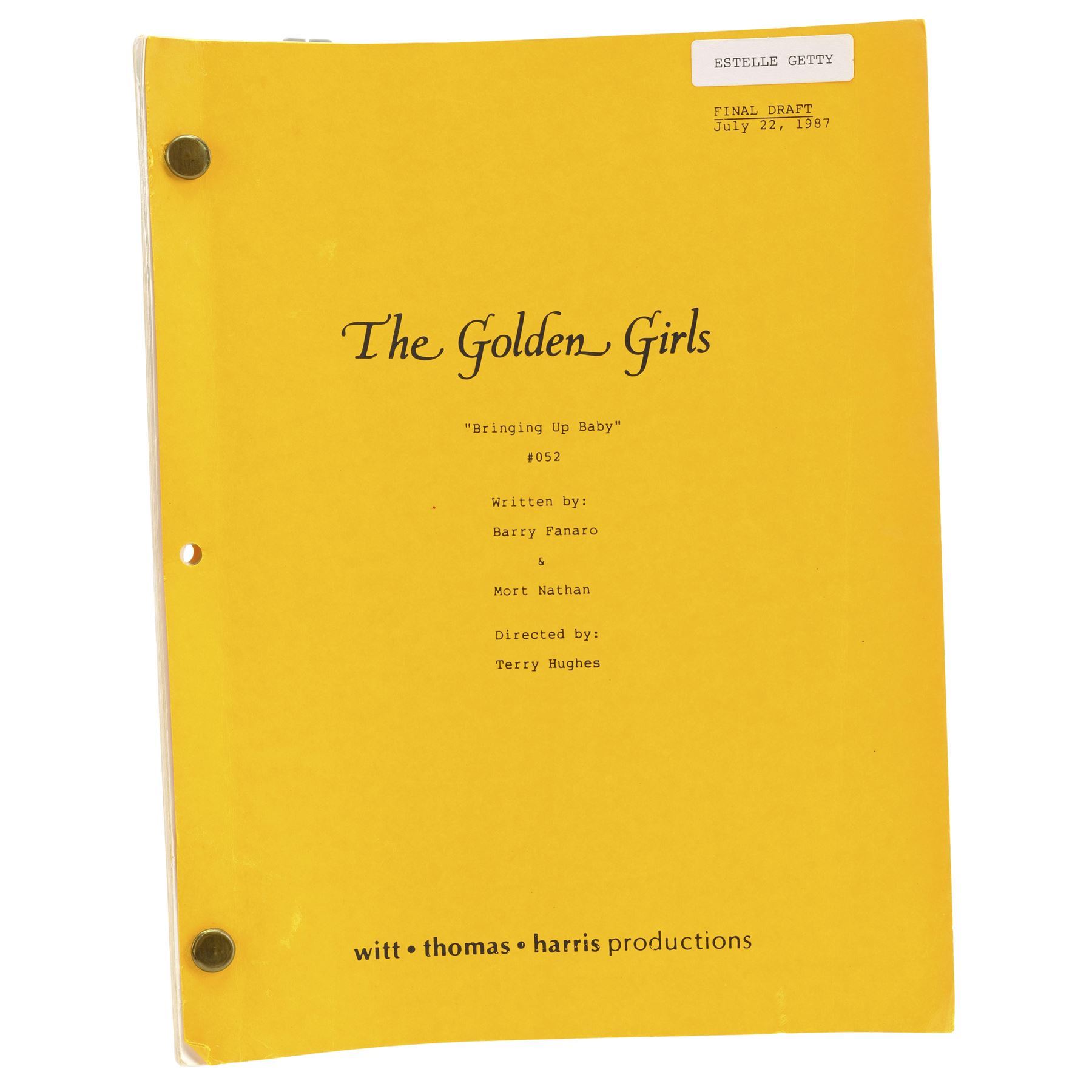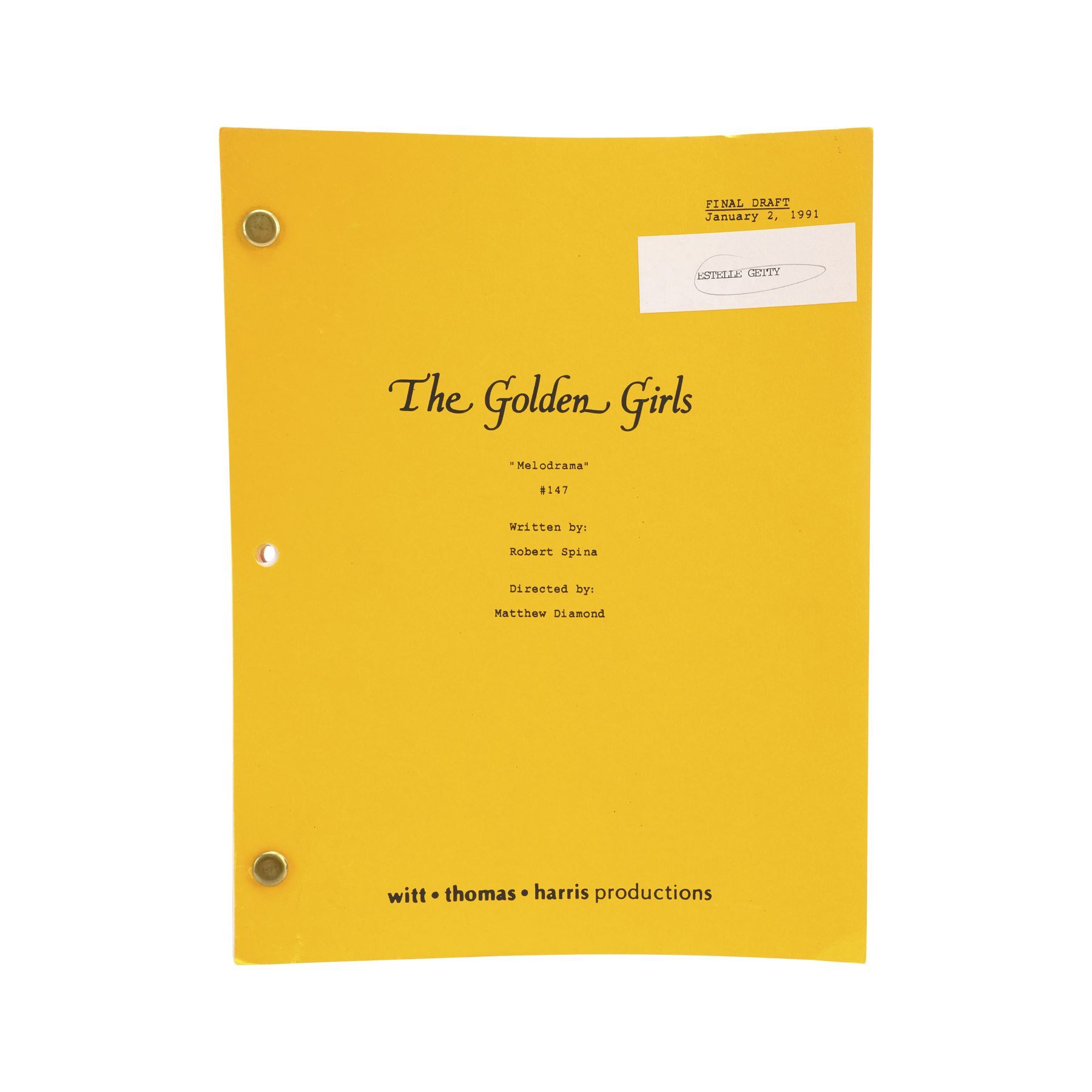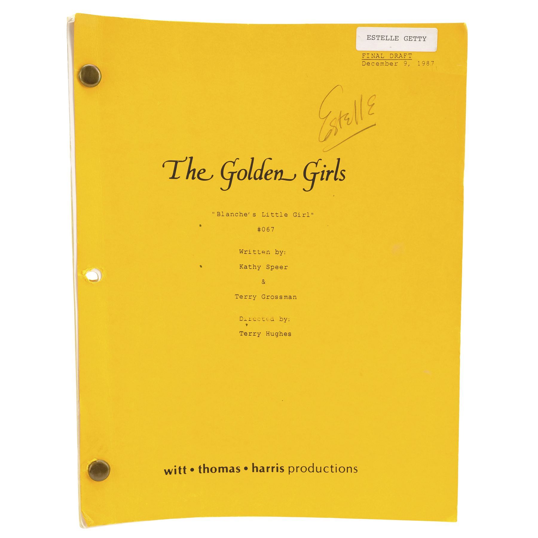 This lot comes from the collection of Estelle Getty's personal assistant and friend, Rich Weaver, and consists of two final draft scripts for the Season 3 episode "Blanche's Little Girl" (featuring highlighter annotations) and the Season 6 episode "Miles To Go," both labeled for Getty and signed "Estelle;" and six final draft scripts for the episodes "Melodrama," "Older and Wiser," "Bringing Up Baby," "Mister Terrific," "Rose's Big Adventure," and "Empty Nest," with five labeled for Getty and three featuring highlighted and handwritten annotations. This lot exhibits minor fold creases from handling and minor stains. Dimensions (each): 8.5" x 11" x 0.25" (21.75 cm x 28 cm x 0.75 cm)