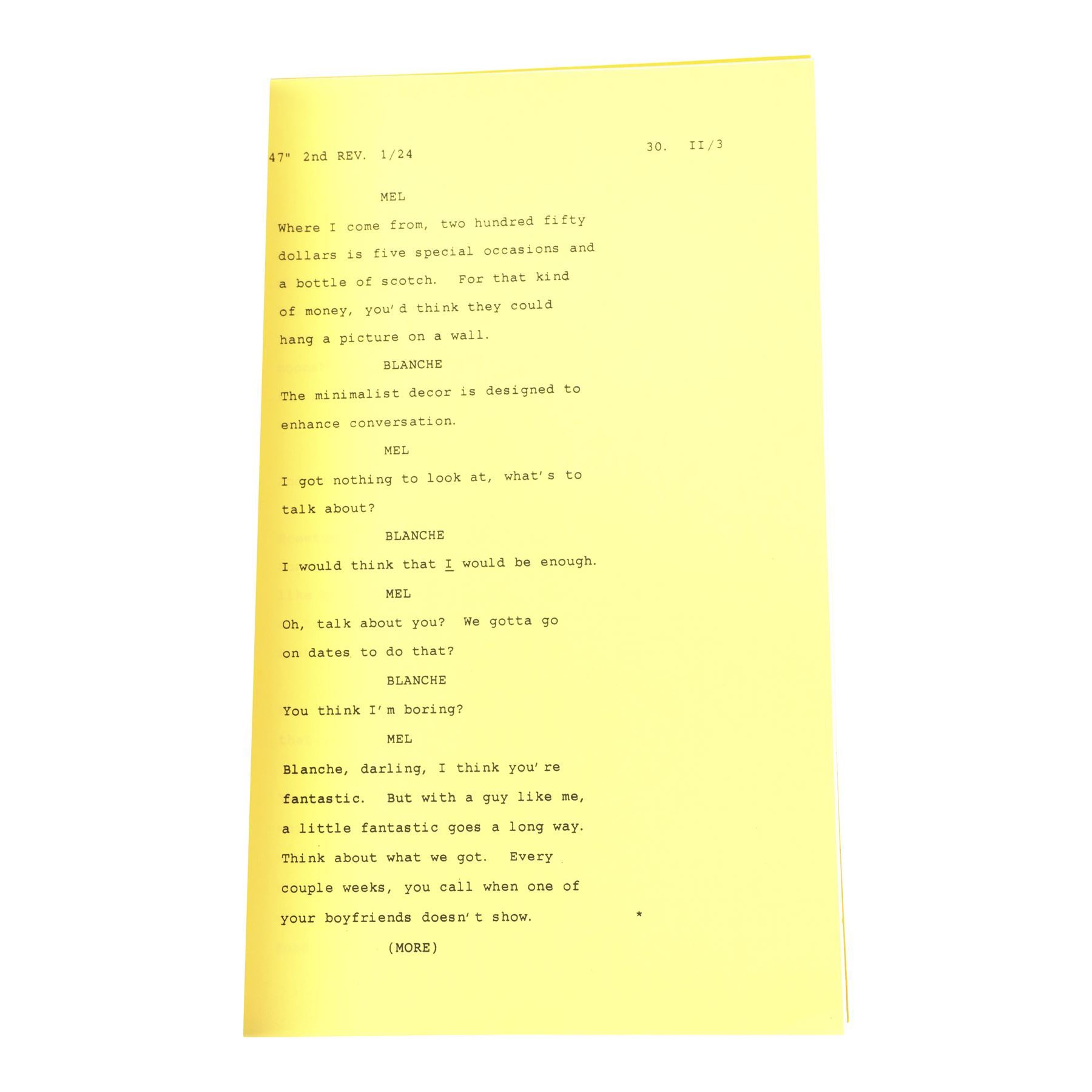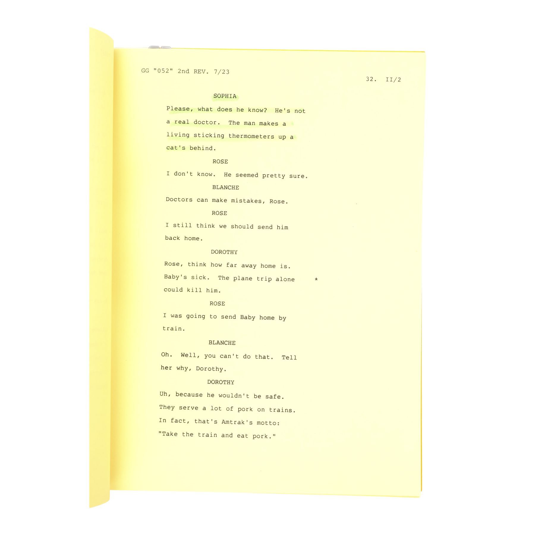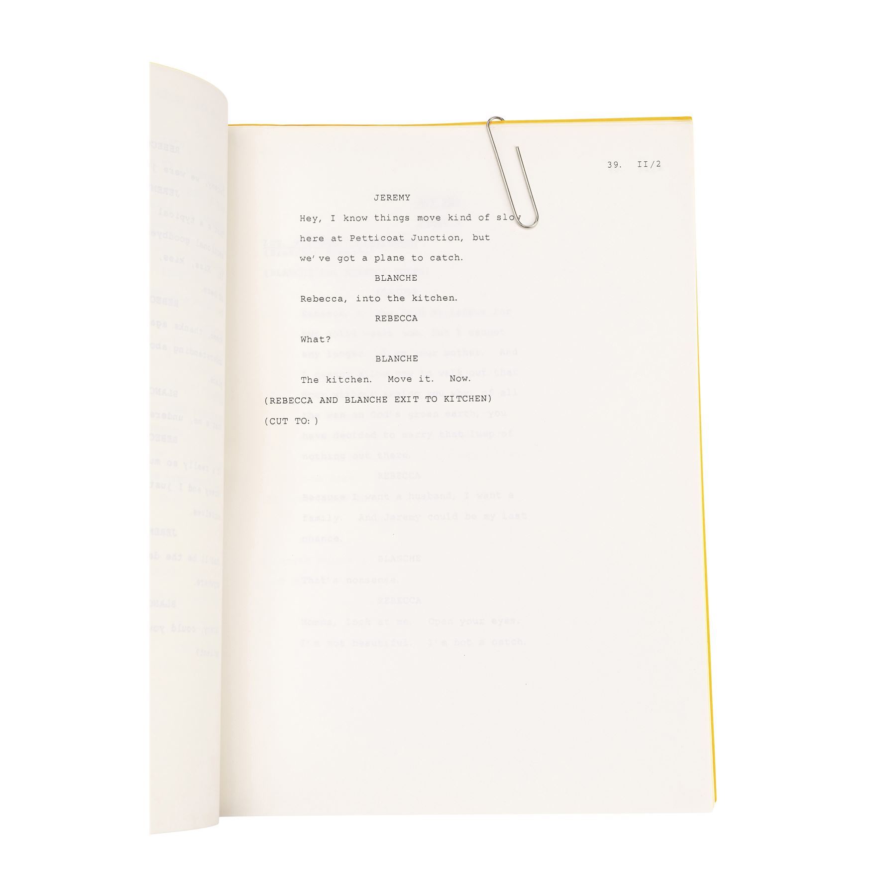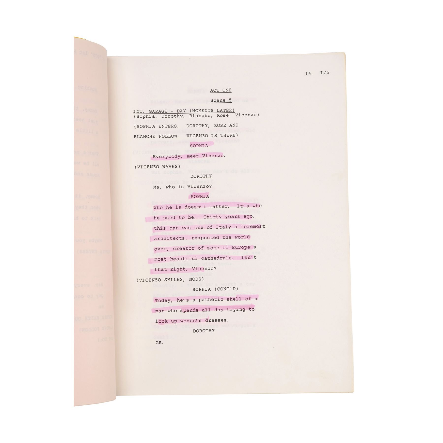 This lot comes from the collection of Estelle Getty's personal assistant and friend, Rich Weaver, and consists of two final draft scripts for the Season 3 episode "Blanche's Little Girl" (featuring highlighter annotations) and the Season 6 episode "Miles To Go," both labeled for Getty and signed "Estelle;" and six final draft scripts for the episodes "Melodrama," "Older and Wiser," "Bringing Up Baby," "Mister Terrific," "Rose's Big Adventure," and "Empty Nest," with five labeled for Getty and three featuring highlighted and handwritten annotations. This lot exhibits minor fold creases from handling and minor stains. Dimensions (each): 8.5" x 11" x 0.25" (21.75 cm x 28 cm x 0.75 cm)