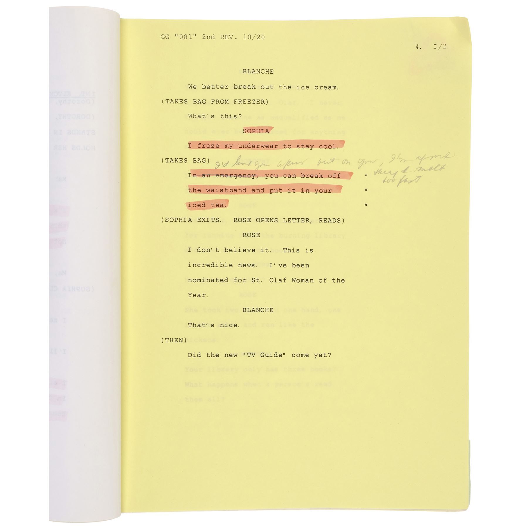 This lot comes from the collection of Getty's assistant and friend, Rich Weaver, and consists of one script from Season 3's "One for the Money"; one from Season 4's "Yokel Hero"; one Season 4 script "Bang the Drum Stanley"; and a letter to Getty from Steven Spielberg, signed in blue ink on personal letterhead. Each script is a final draft labeled "ESTELLE GETTY," features Getty's autograph, and highlighted annotations. This lot exhibits minor discoloration and page creases. Dimensions: 8.5" x 11" x 0.25" (21.75 cm x 28 cm x 0.75 cm)