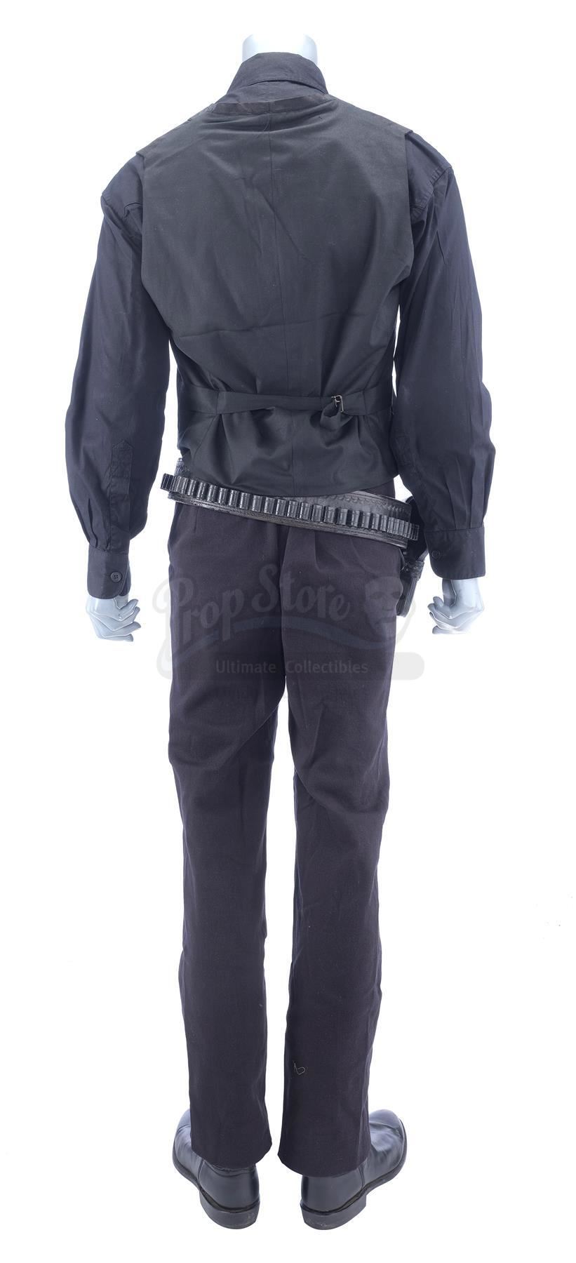 This lot will be auctioned on Wednesday, June 30th. The auction will begin at 9:00am PDT and lots are sold sequentially via live auctioneer; tune in to the live streaming broadcast on auction day to follow the pace. Note other lots in the auction may close on June 29th or July 1st. Sam Chisholm's (Denzel Washington) costume with pistol and rig from Antoine Fuqua's western remake The Magnificent Seven. U.S. Marshal Chisholm wore his costume when he and six gunslingers kept corrupt businessman Bartholomew Bogue (Peter Sarsgaard) and his mercenaries from taking over a peaceful town. This costume consists of a black cotton button-up shirt; a black button-up cotton blend waistcoat; a white cotton T-shirt; a pair of black wool-blend pants, a black leather belt with an ornate carved floral design and a metal buckle; a black leather stunt gun belt with a metal buckle and bullet loops; a pair of black leather boots marked "D" in the interior; and a silver-color rubber revolver with a black handle. It exhibits signs of use and wear, including scuffing on the belts, but remains in excellent overall condition. Estimate: $4,000 - 6,000