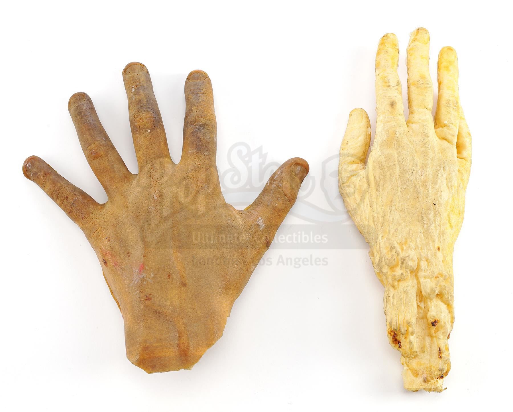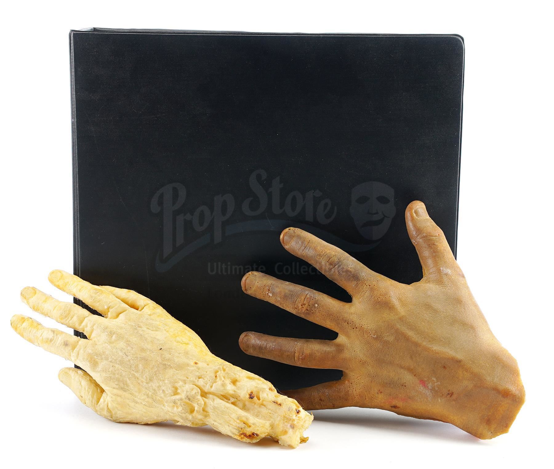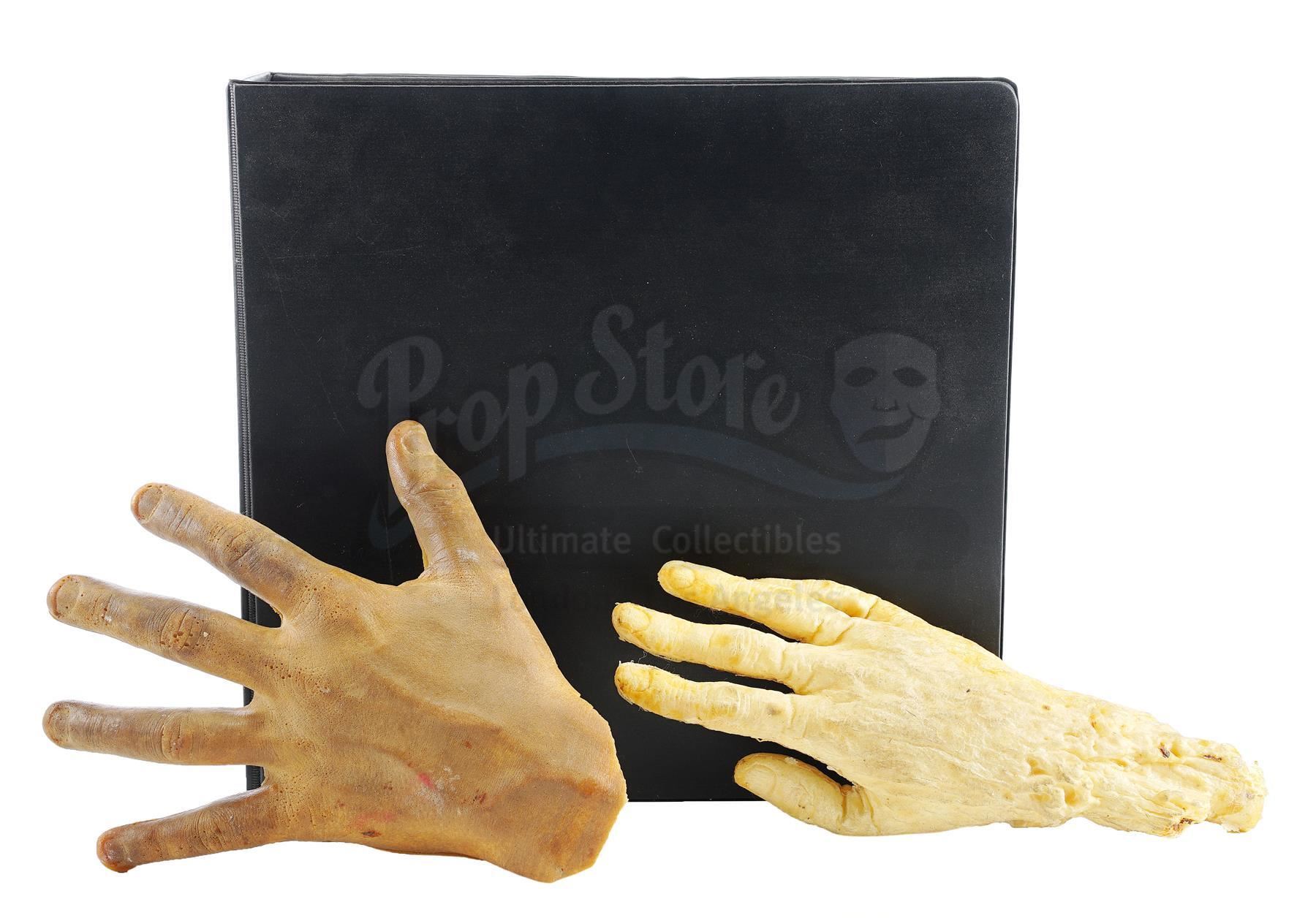This lot will be auctioned on Wednesday, June 30th. The auction will begin at 9:00am PDT and lots are sold sequentially via live auctioneer; tune in to the live streaming broadcast on auction day to follow the pace. Note other lots in the auction may close on June 29th or July 1st. A production binder and dummy hands from Tim Burton's sci-fi comedy Mars Attacks!. The film's animal trainer used dummy hands to train for the scene where a dog carried off a severed hand during Earth's fatal first contact with the Martians. The black binder, labeled "Mars Attacks Storyboards + Script", includes storyboard copies, a script, schedules, call sheets, and a copy of Mad Magazine #353, which parodied the film. The two foam hands are painted white and brown. All are in good overall condition with wear to the hands from use, including scuffs, stains, and tears. Dimensions: 12" x 12" x 4" (30.5 cm x 30.5 cm x 10.25 cm) Estimate: $800 - 1,200