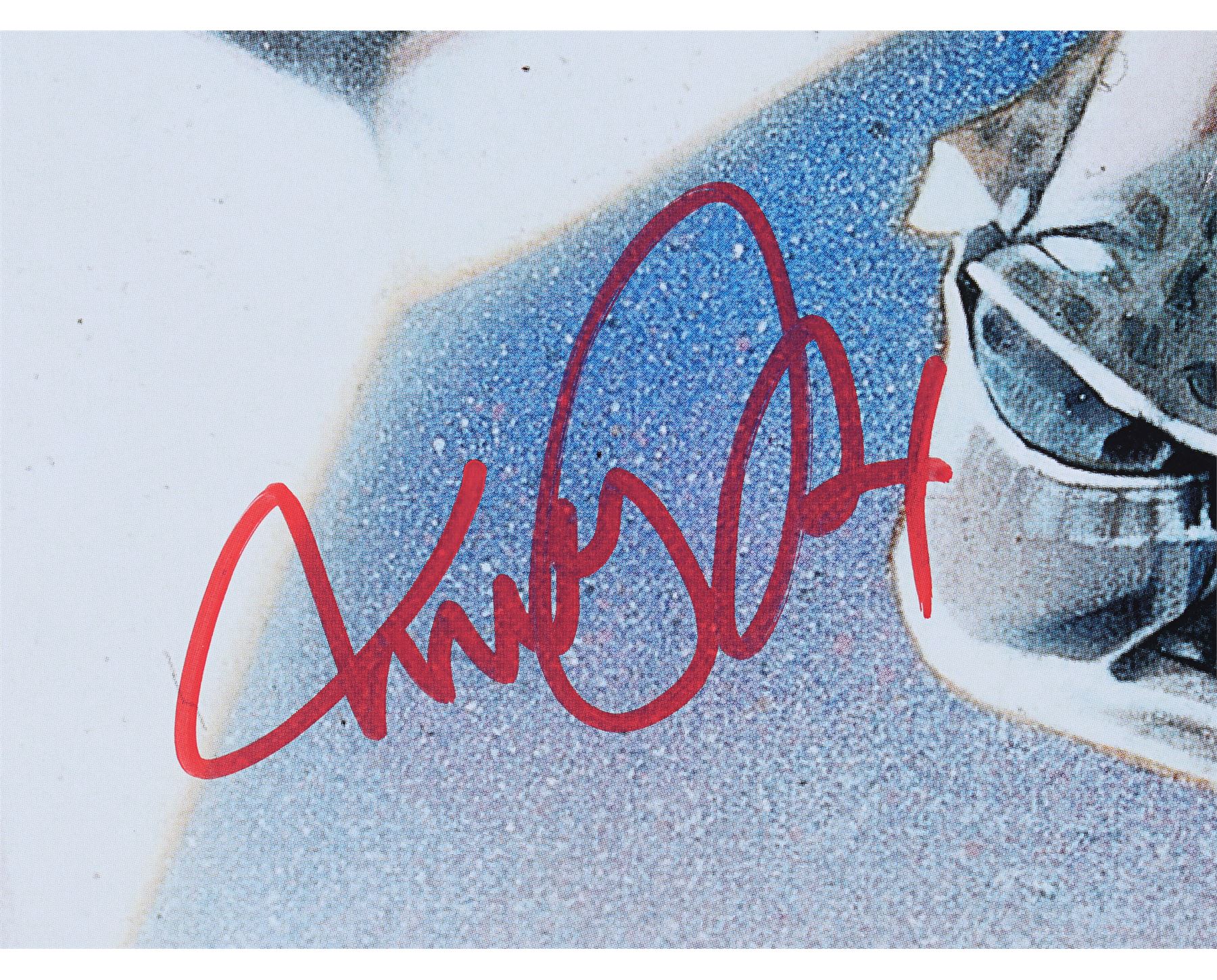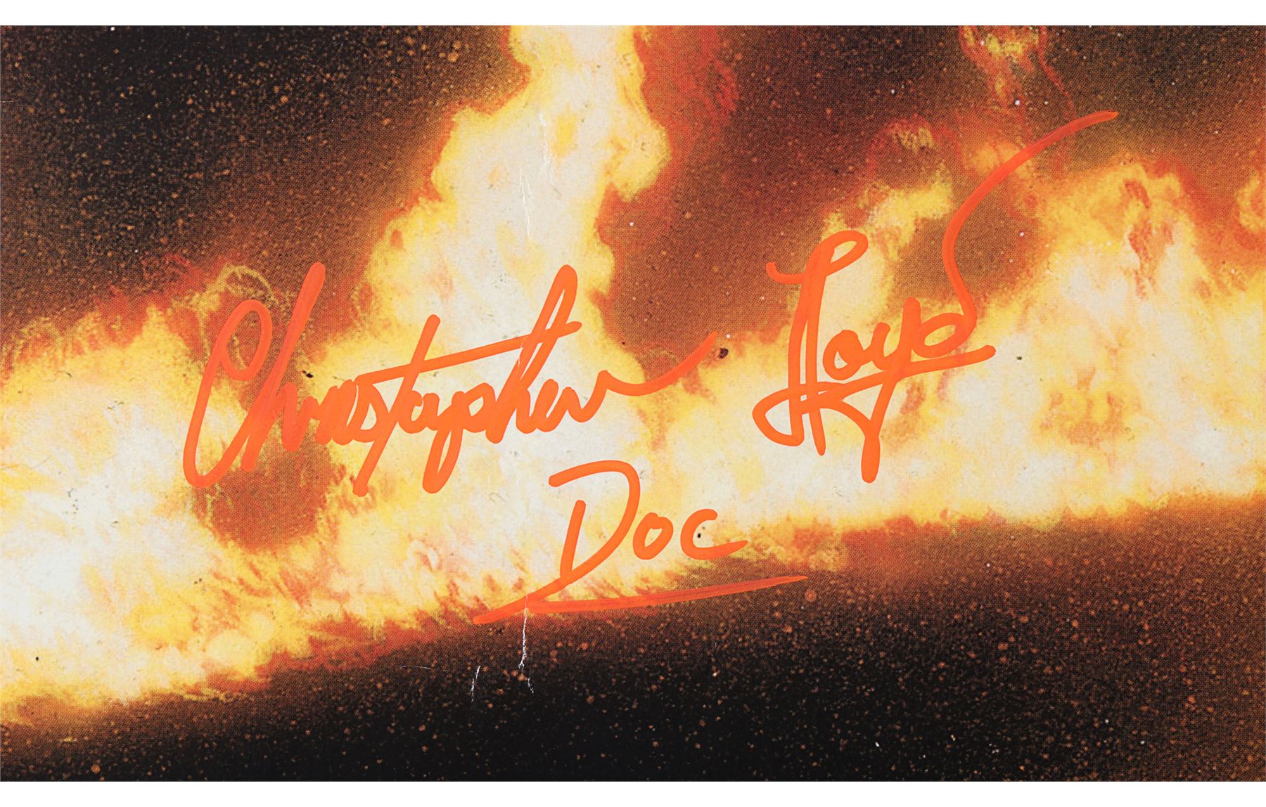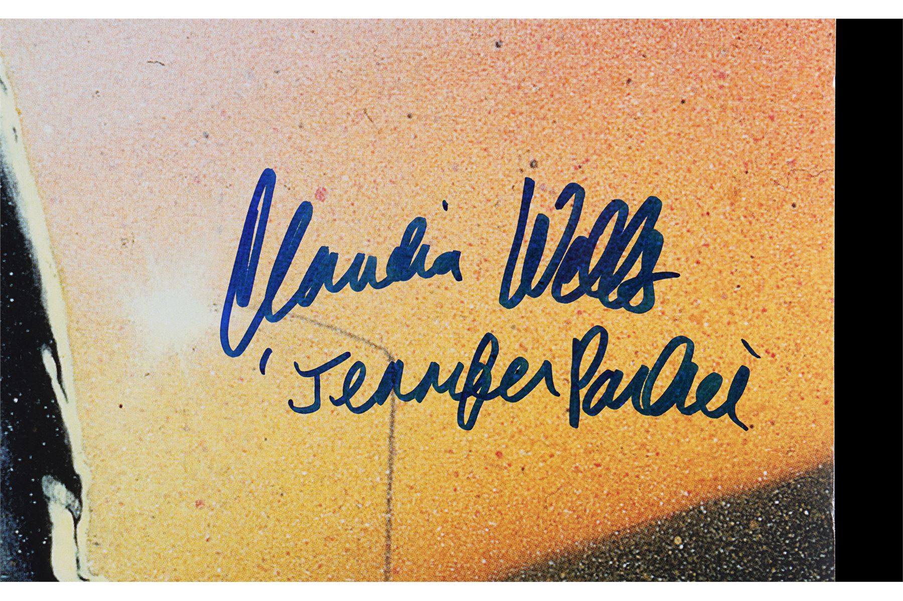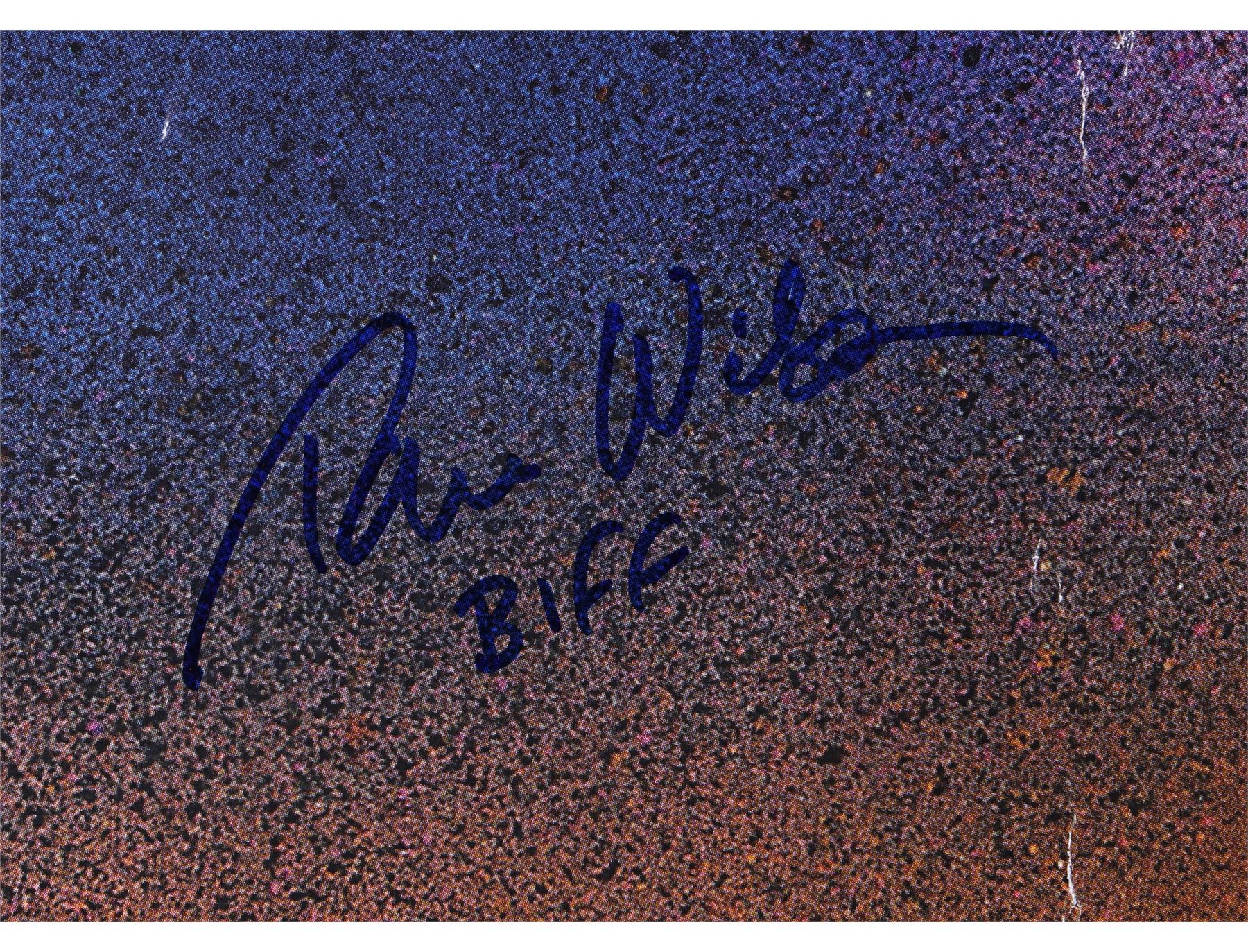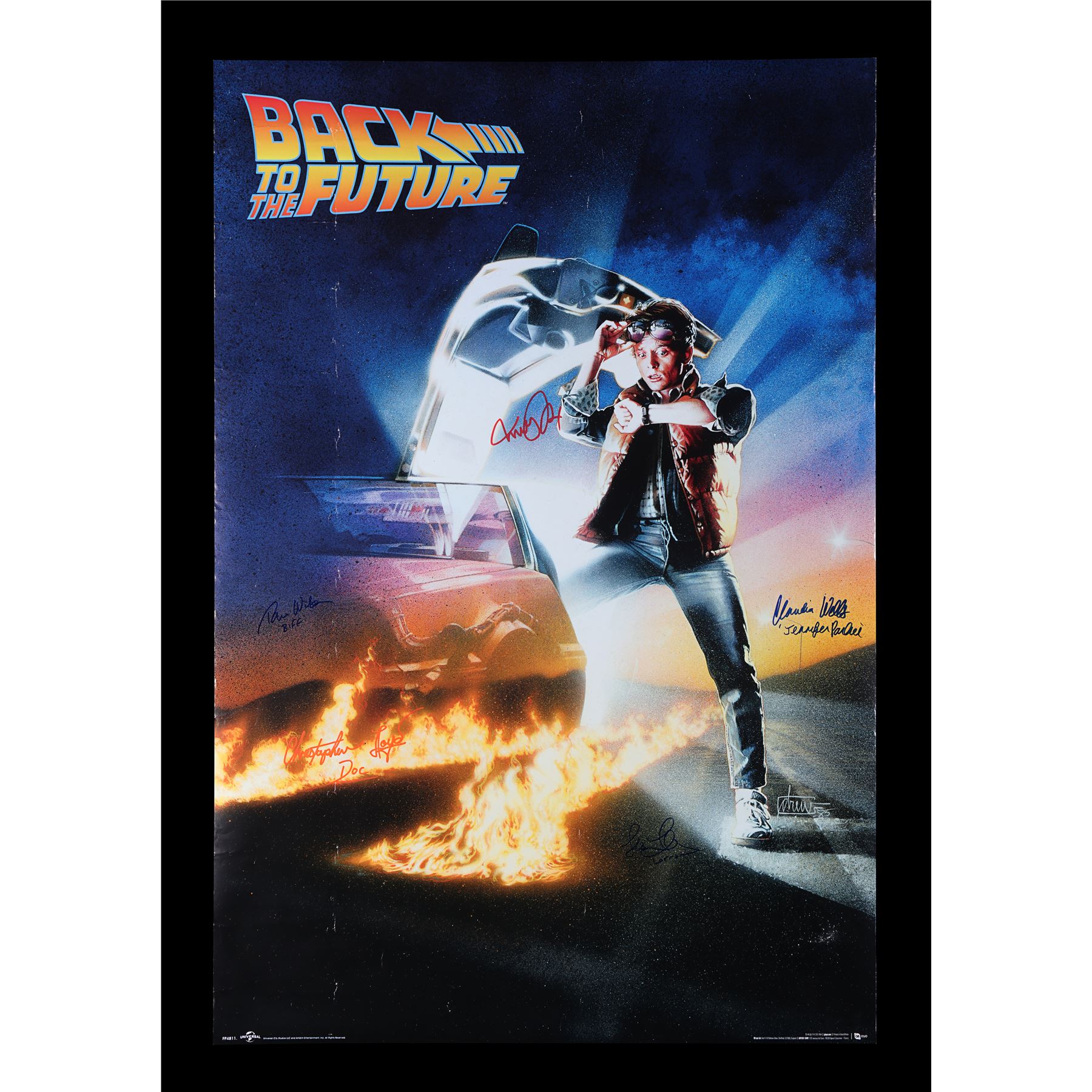 A cast-autographed poster from the promotion of Robert Zemeckis' sci-fi comedy adventure Back to the Future. It depicts artwork by renowned poster artist Drew Struzan, and shows Marty McFly (Michael J. Fox) checking his watch next to the iconic DeLorean time machine, with lines of flames along the ground. It is autographed in blue and red ink by Fox, Christopher Lloyd (Doc Brown), Lea Thompson (Lorraine Baines), Thomas F. Wilson (Biff Tannen) and Claudia Wells (Jennifer Parker). The poster is rolled and displays notable crease lines. Dimensions: 91.5 cm x 61 cm (36" x 24")