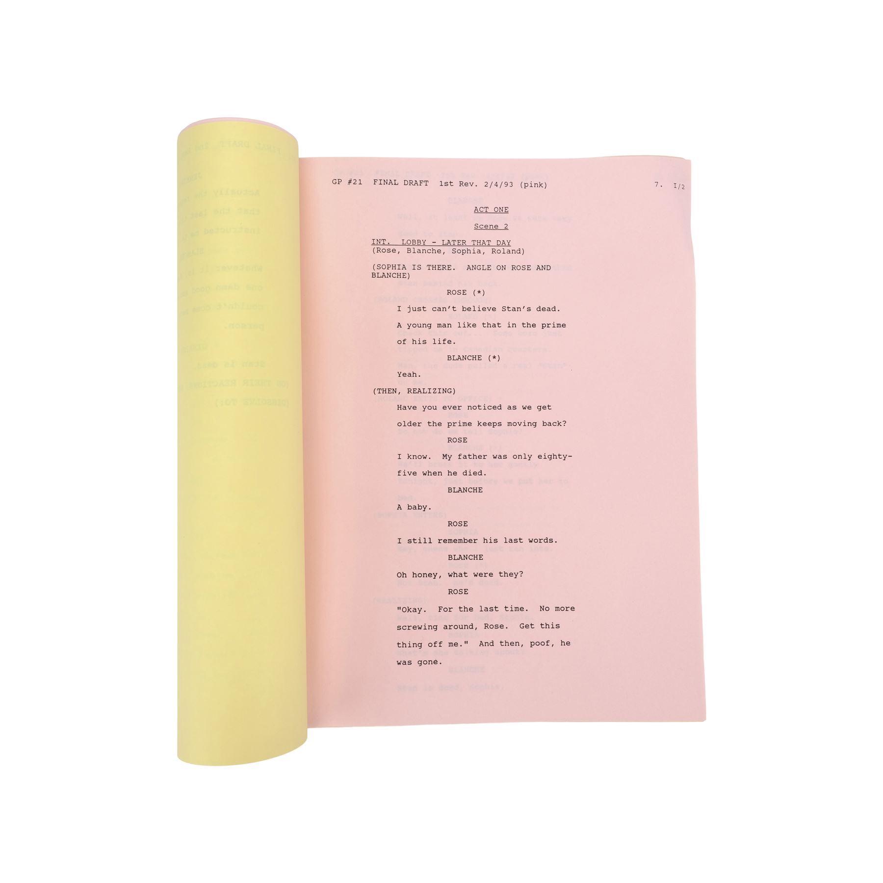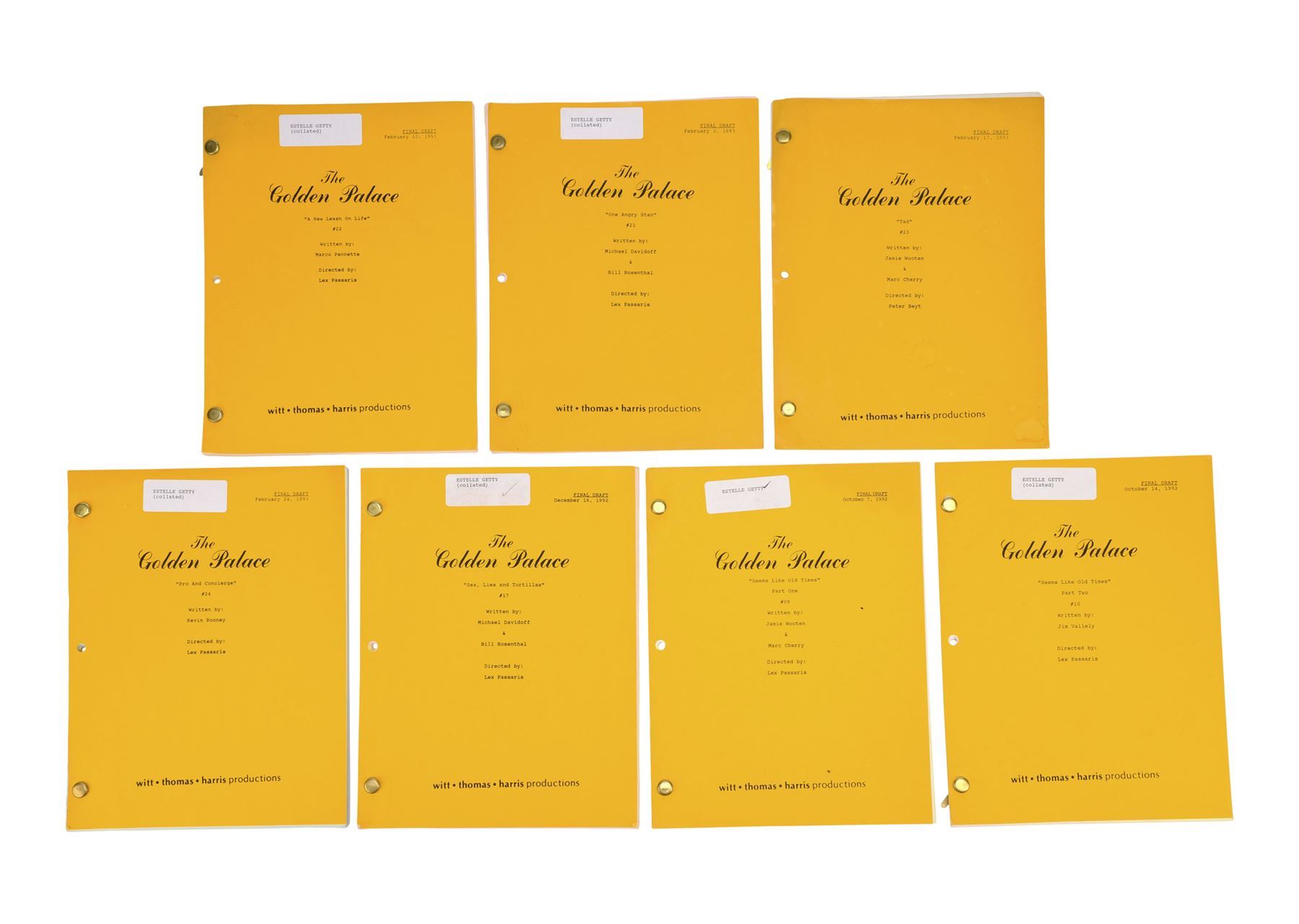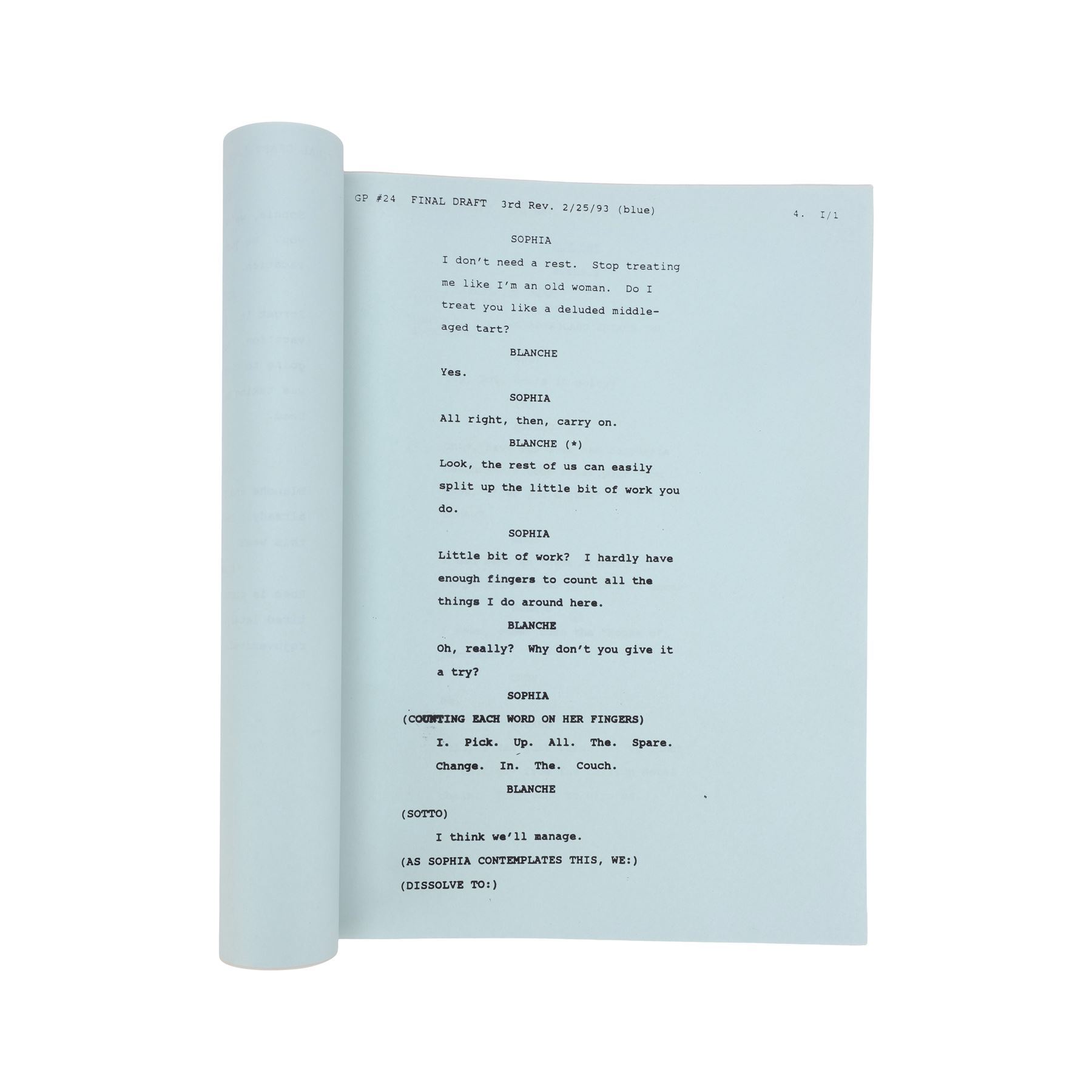 This lot comes from the collection of Estelle Getty's personal assistant and friend, Rich Weaver, and consists of a white terry cloth robe featuring "Sophia" and "The Golden Palace" in gold-color embroidery; white terry cloth heeled slippers with "Sophia" embroidered in gold-color thread; and seven final draft scripts labeled "Estelle Getty (collated)," including scripts for "Seems Like Old Times Part I" and "Seems Like Old Times Part II." This lot exhibits minor discoloration. Dimensions: 8.5" x 11" x 0.5" (21.75 cm x 28 cm x 1.5 cm)