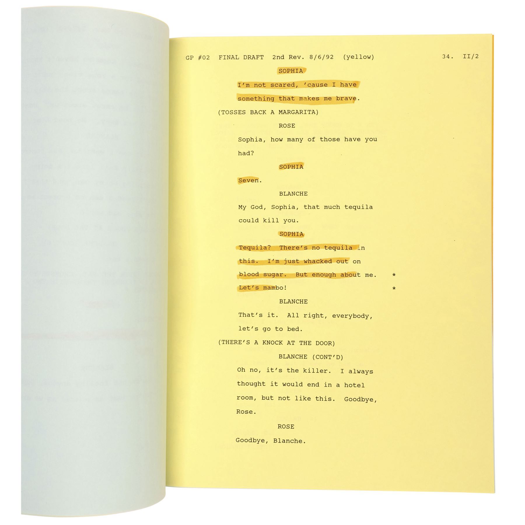 This lot comes from the collection of Estelle Getty's personal assistant and friend, Rich Weaver, and consists of 12 brass-brad bound and hand-annotated scripts for the pilot, and the following episodes: "Promotional Considerations," "Ebbtide for the Defense," "Can't Stand Losing You," "Marriage on the Rocks, with a Twist," "It's Beginning to Look a Lot (Less) Like Christmas," "Rose and Fern," "Heartbreak Hotel," "Senior Stinky Learns Absolutely Nothing About Life," "Say Goodbye, Rose," "Tad," and "The Chicken and The Egg." This lot exhibits minor discoloration and edgewear from age. Dimensions: (each) 8.5" x 11" x 0.25" (21.75 cm x 28 cm x 0.75 cm)