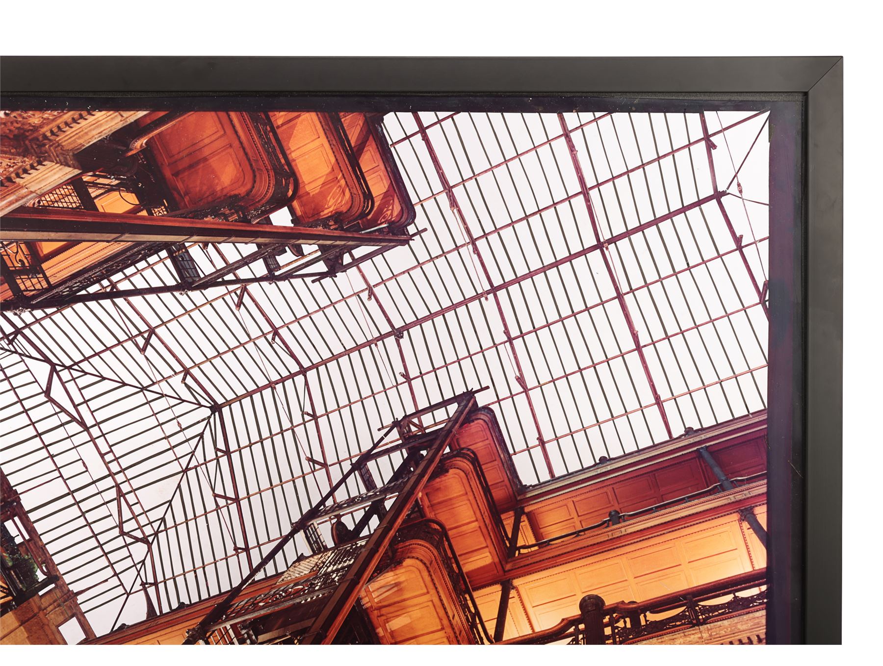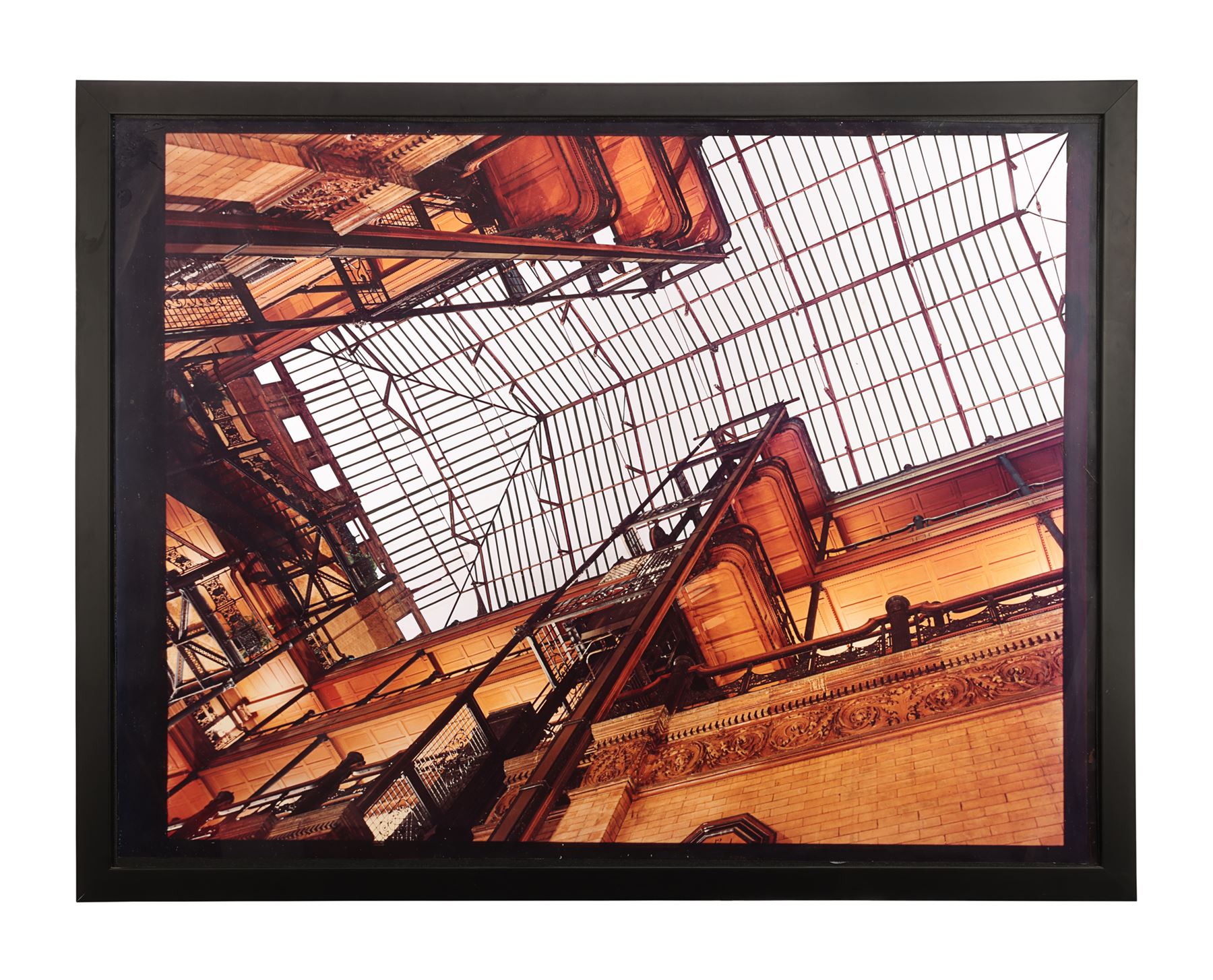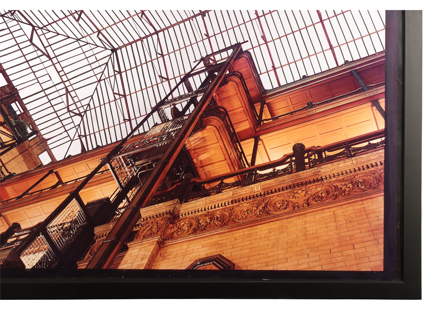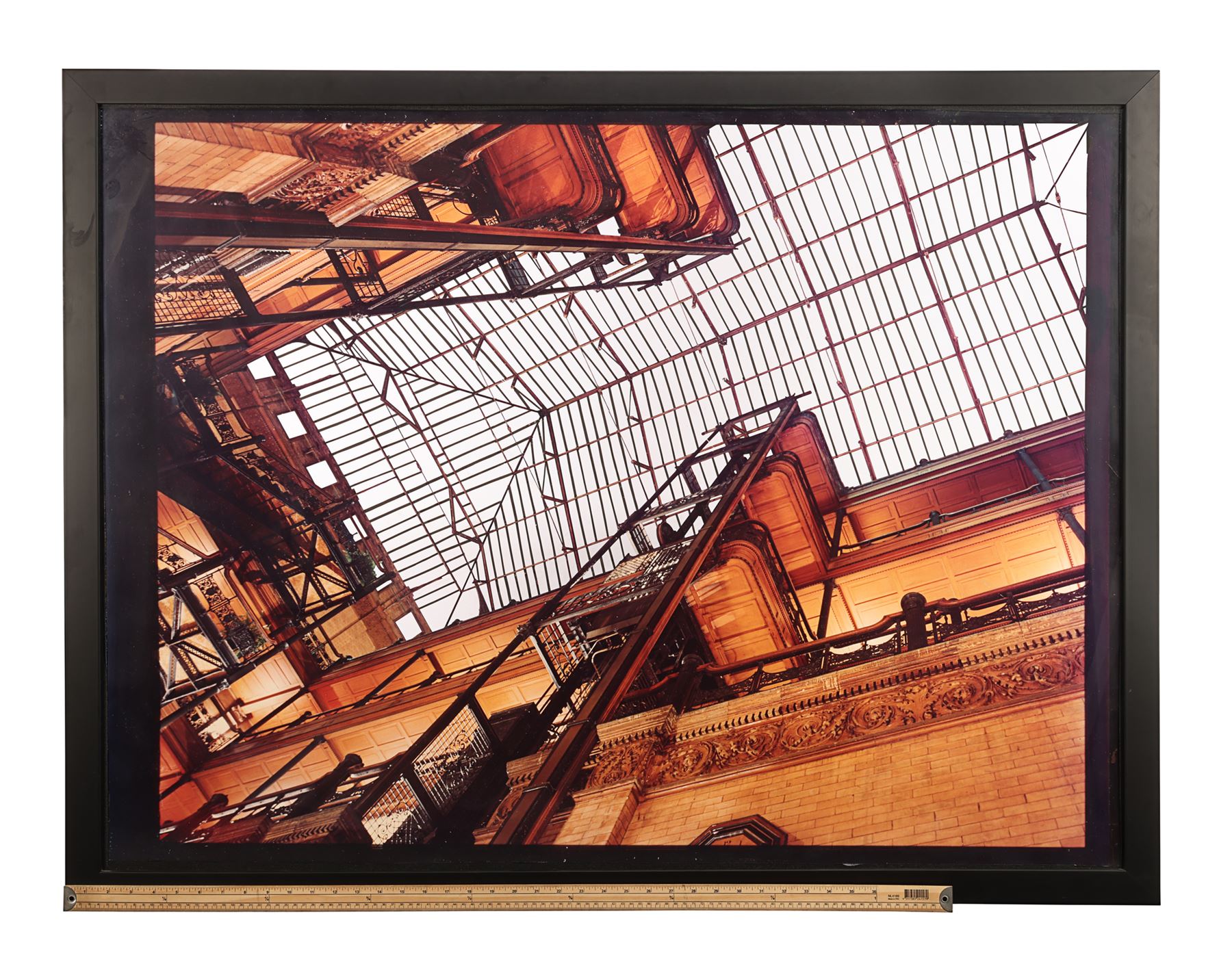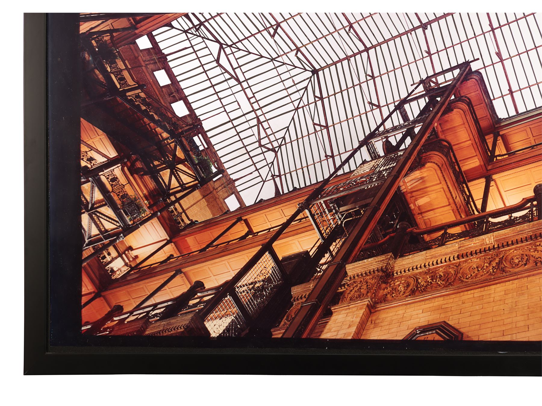 The photograph depicts the atrium's cathedral-like central court; a domed Victorian plate glass roof; decorative terracotta; filigree balustrades; birdcage elevator shafts; and wrought-iron balconies. This matte was used for the scene in which a blimp flew overhead and was visible through the skylight before Deckard (Harrison Ford) entered Sebastian's apartment.