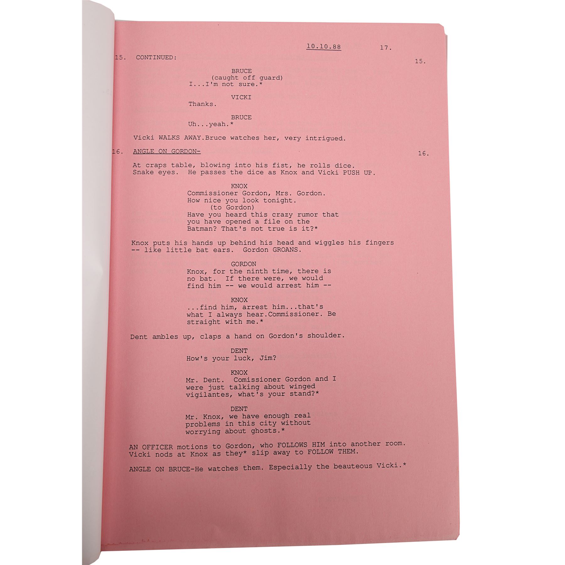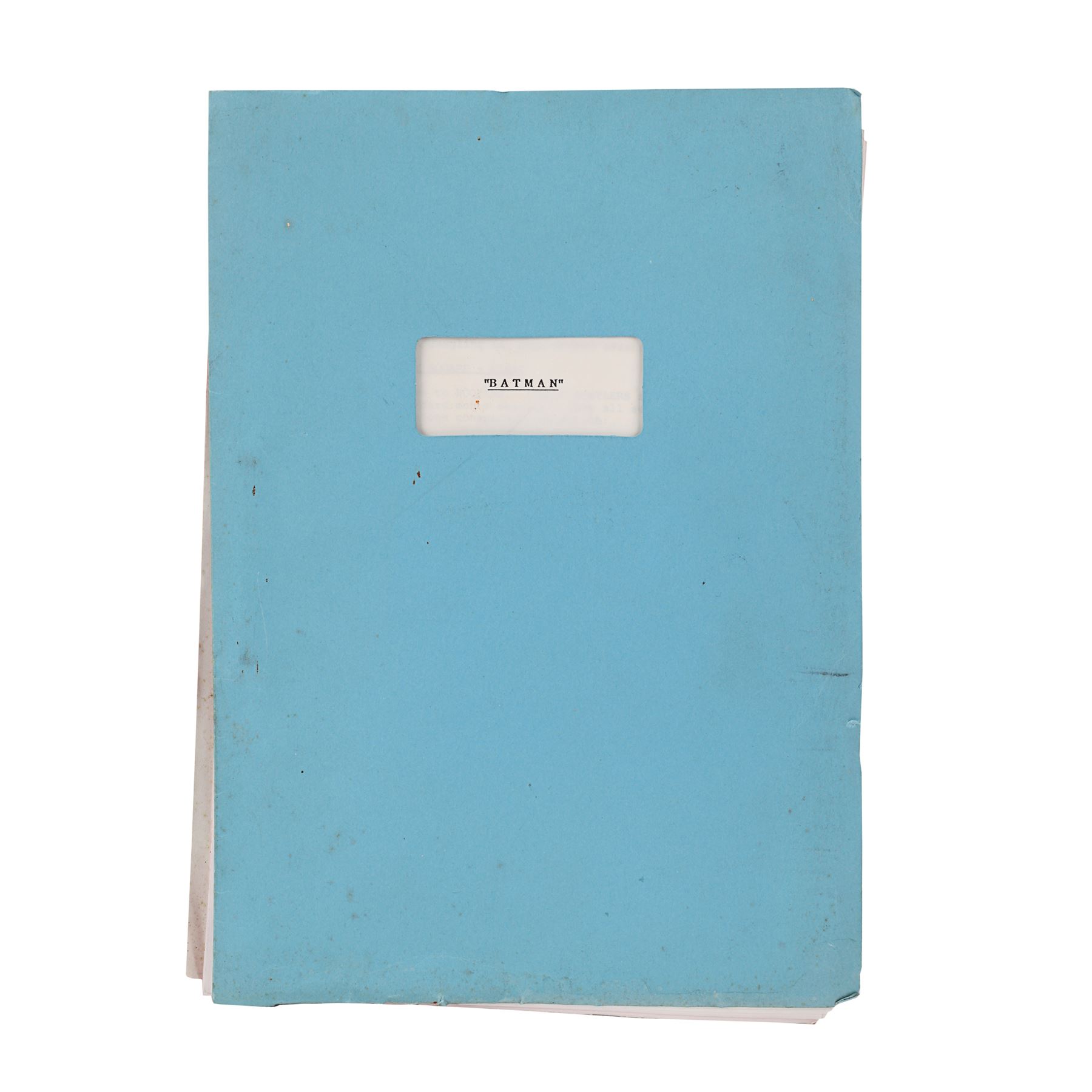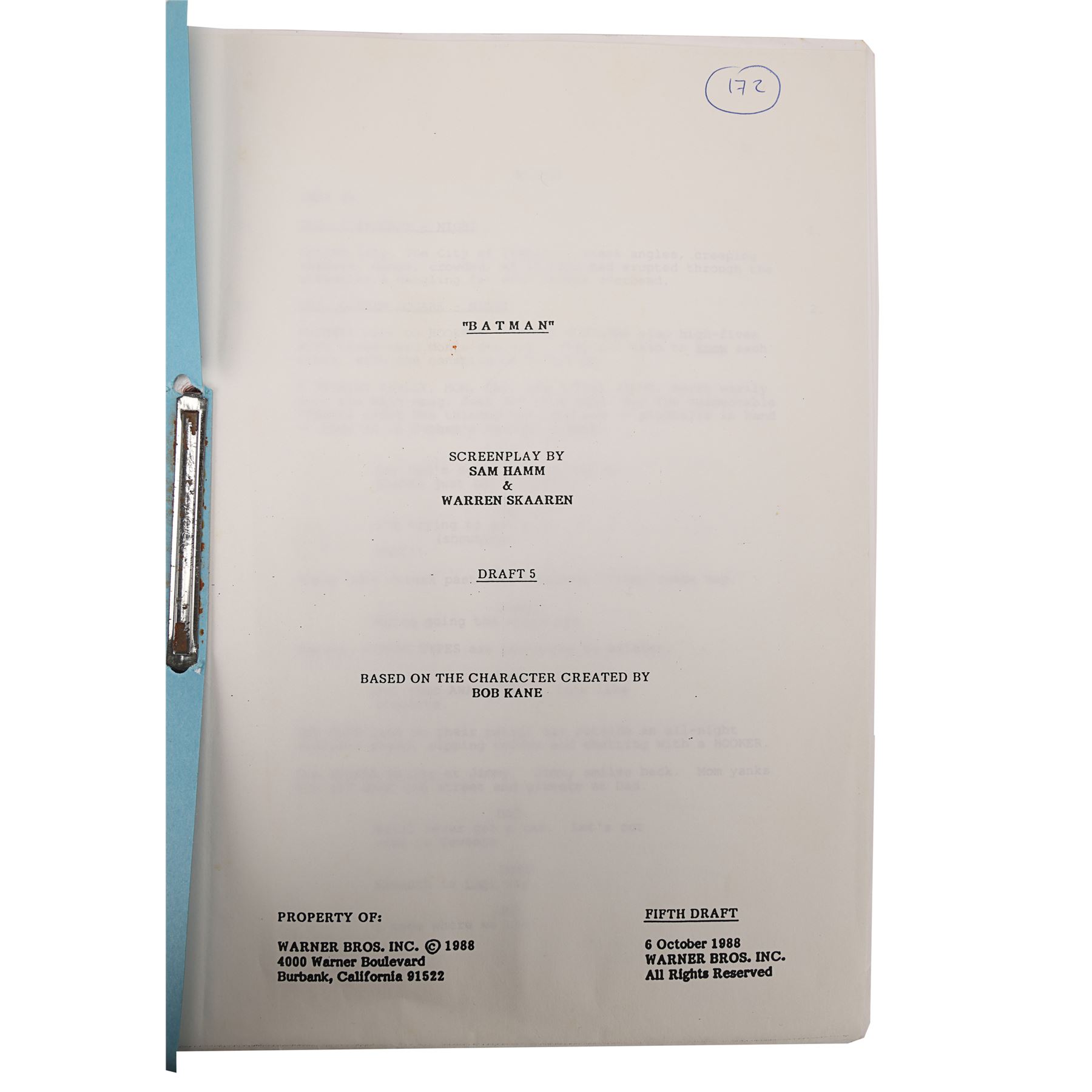 A fifth draft script from the production of Tim Burton's superhero film Batman. Bound in blue card with a metal script clip, the 110-page script is printed onto white A4 paper and is dated "6 October 1988". Several revisions printed on pink and light blue coloured paper are situated throughout the document. The cover features a cut-out window revealing the film's title, and the issue number "172" is handwritten in the top right corner of the title page. Corrosion is present on the metal fastenings, the card cover is loose, and the script displays several marks. Dimensions: 30.5 cm x 22 cm x 1.5 cm (12" x 8 1/2" x 1/2")