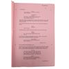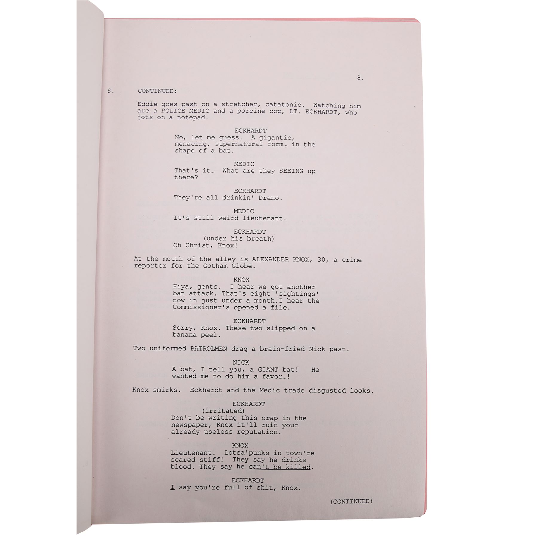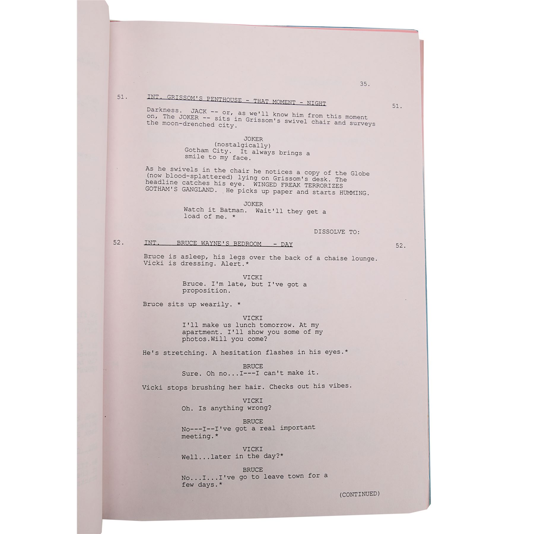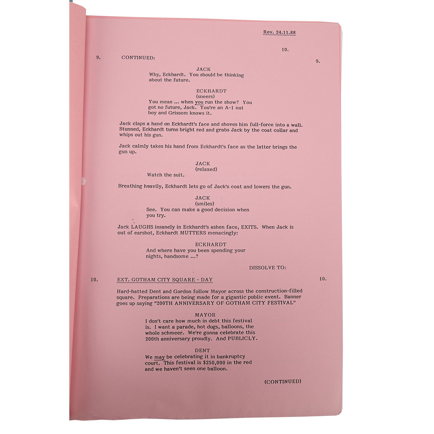 A fifth draft script from the production of Tim Burton's superhero film Batman. Bound in blue card with a metal script clip, the 110-page script is printed onto white A4 paper and is dated "6 October 1988". Several revisions printed on pink and light blue coloured paper are situated throughout the document. The cover features a cut-out window revealing the film's title, and the issue number "172" is handwritten in the top right corner of the title page. Corrosion is present on the metal fastenings, the card cover is loose, and the script displays several marks. Dimensions: 30.5 cm x 22 cm x 1.5 cm (12" x 8 1/2" x 1/2")