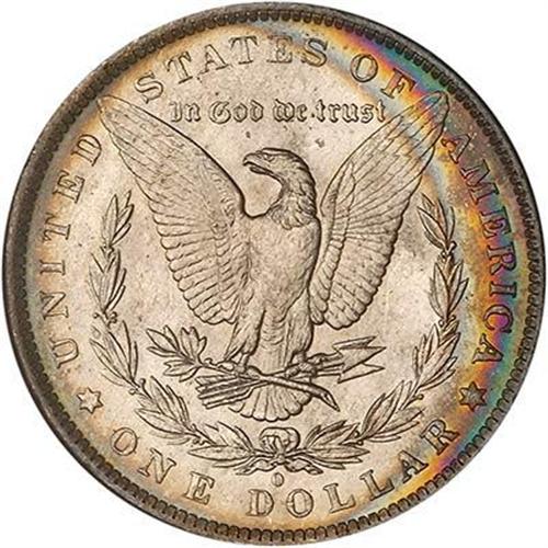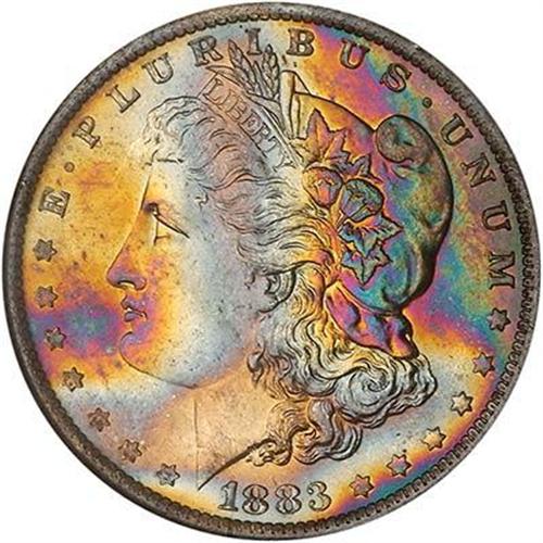 1883-O Morgan Dollar. Splashes of gold, eruptions of purple, intrusions of blue, with silvery sparkle in-between. (#7146)