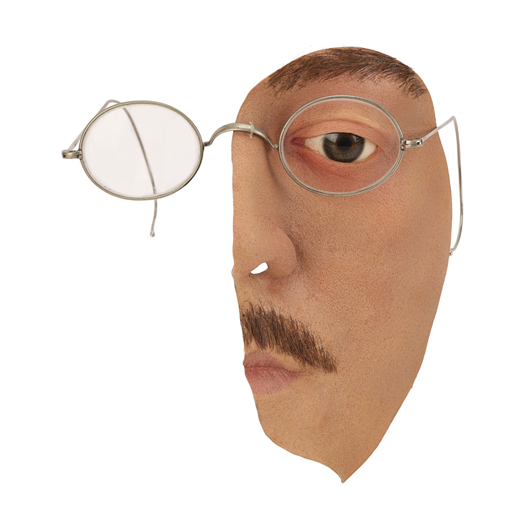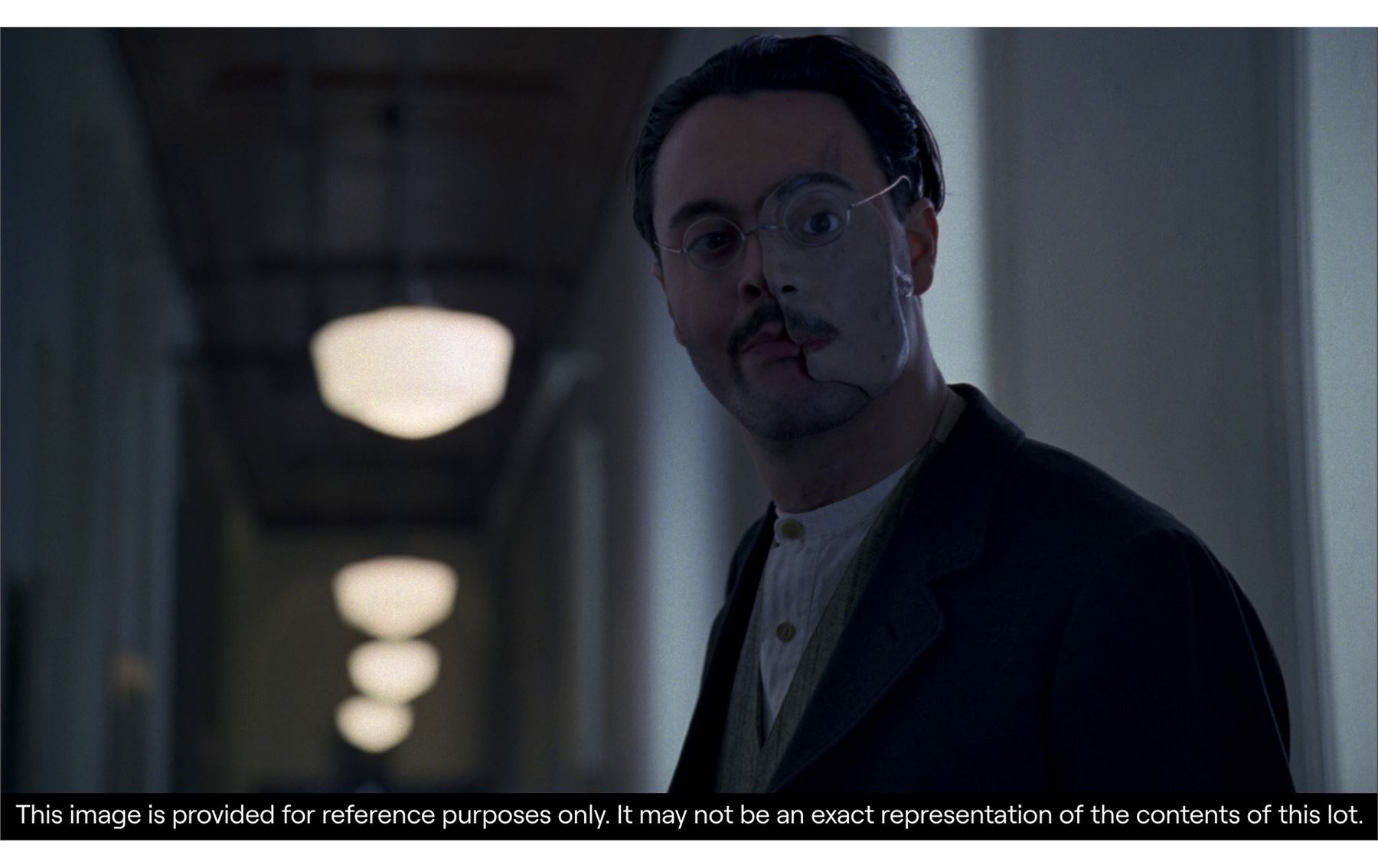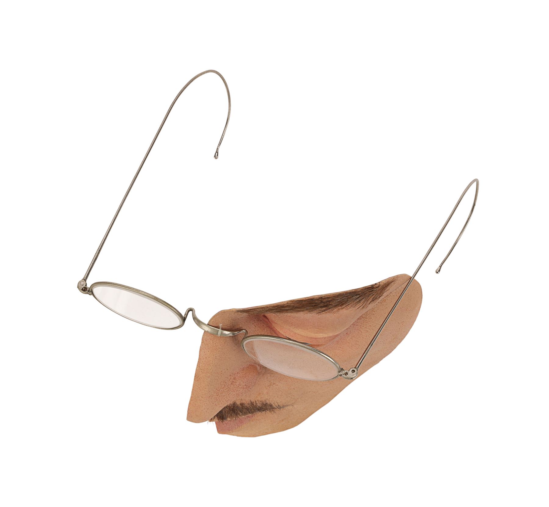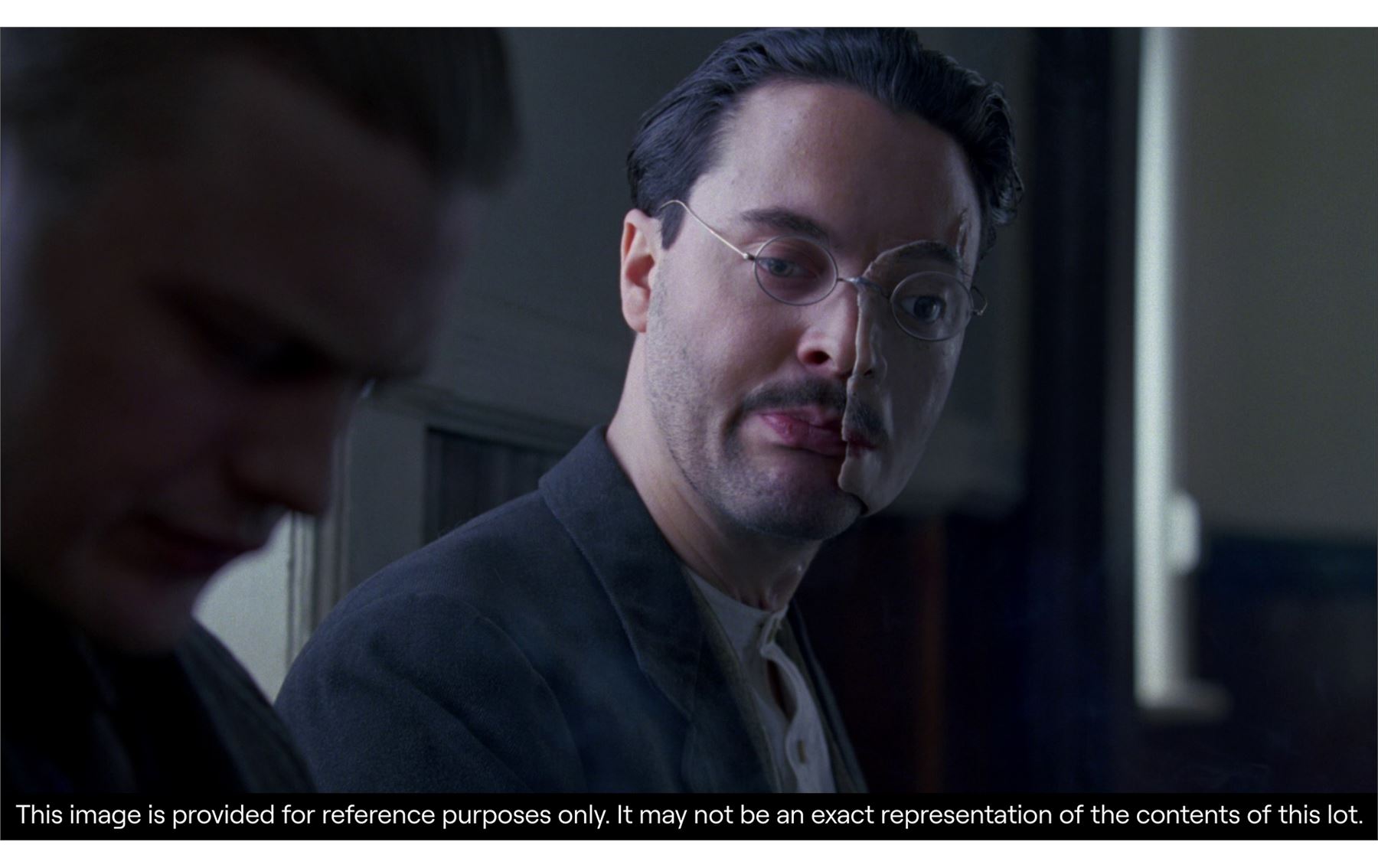 The plastic mask is painted to create the realistic appearance of human facial skin, with the added features of red lips, a glass eye, an eyebrow and a moustache, both made from faux hair. Circular metal spectacles with glass lenses are attached to the face by a thin piece of plastic wiring that feeds through a small hole above the nose. An additional line of plastic wiring comes with the lot, enabling the mask to be worn securely. The mask is accompanied by a certificate of authenticity from HBO as well as a display stand. Dimensions: 15 cm x 11 cm x 14.5 cm (6" x 4 1/4" x 5 3/4")