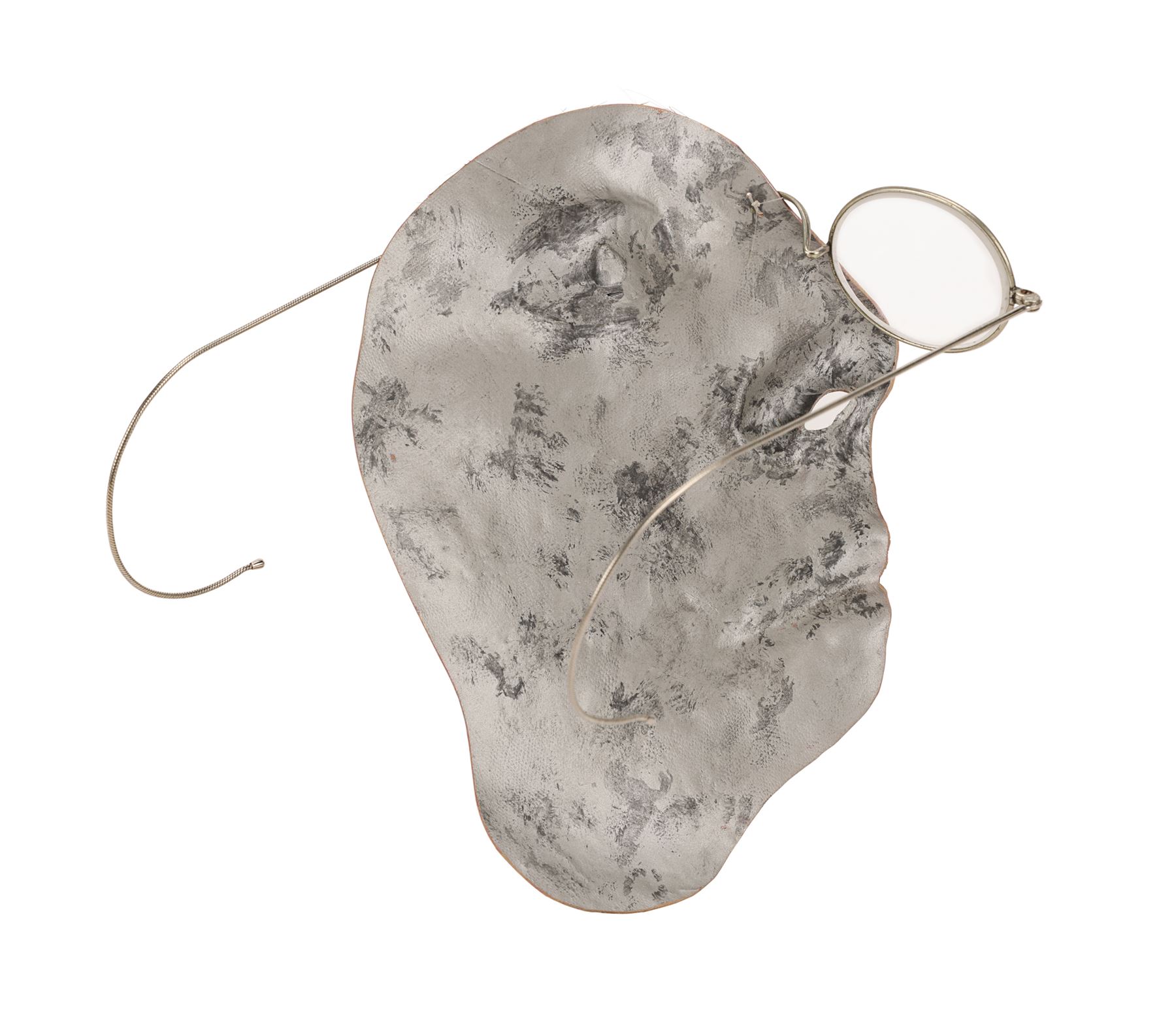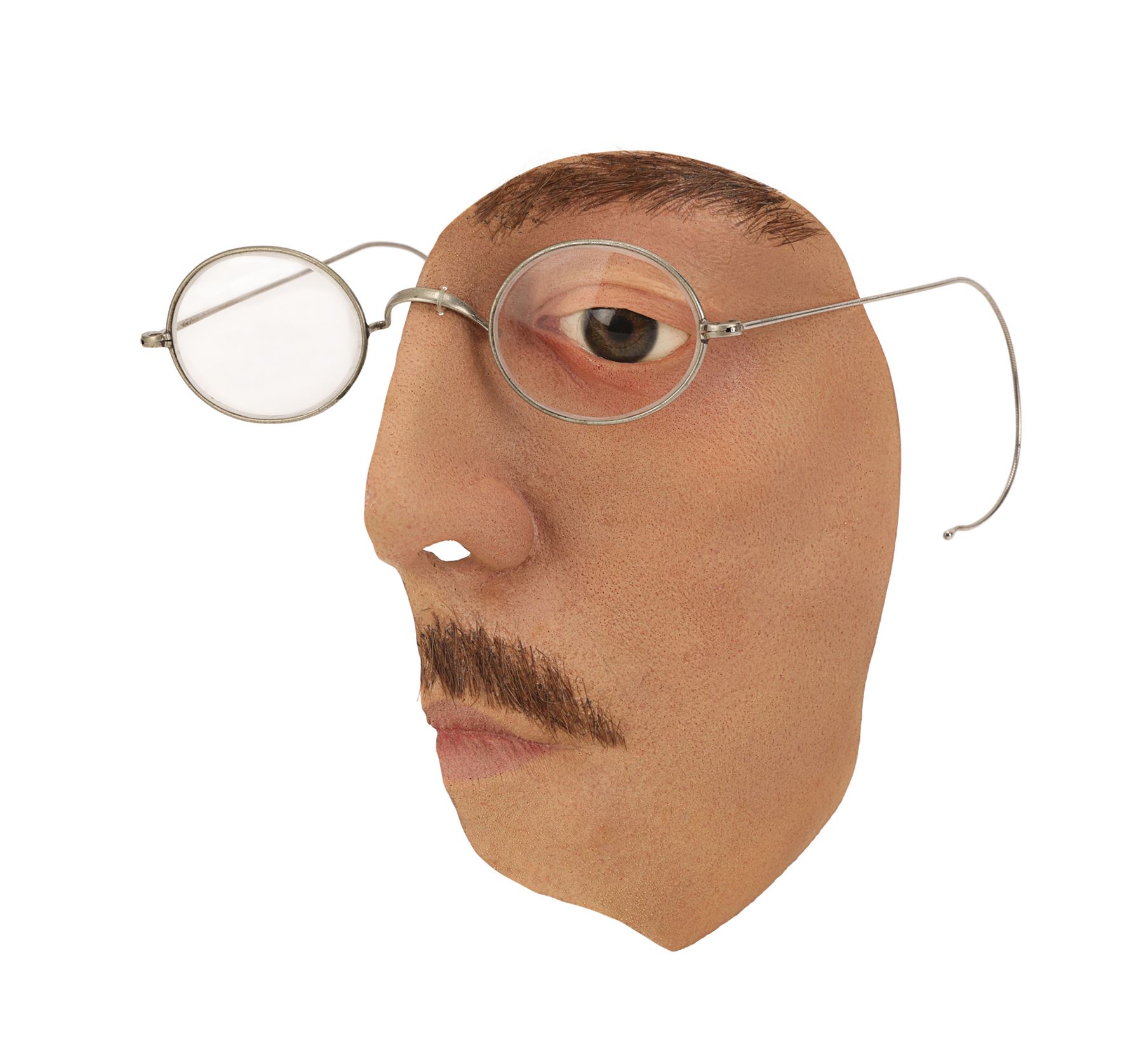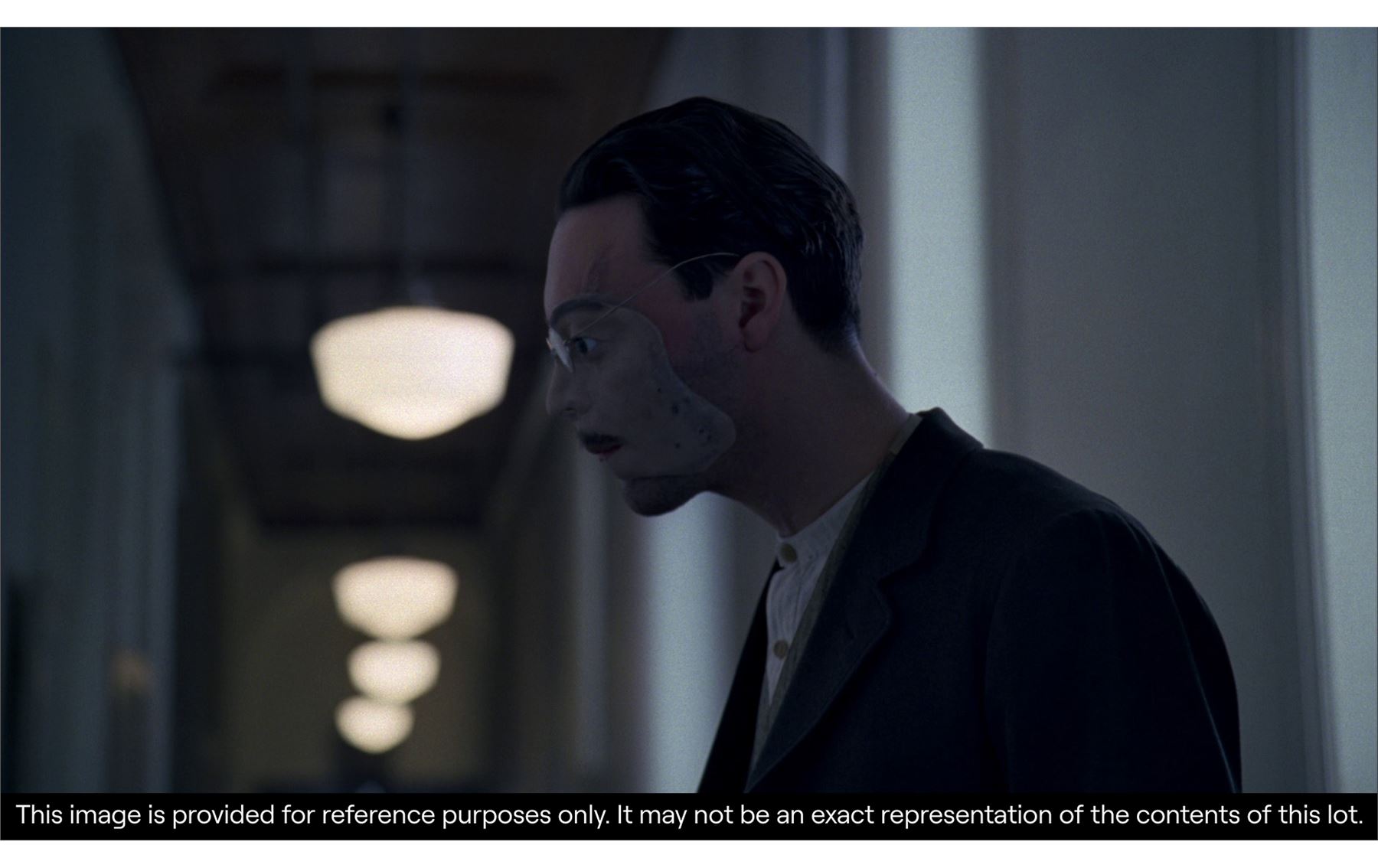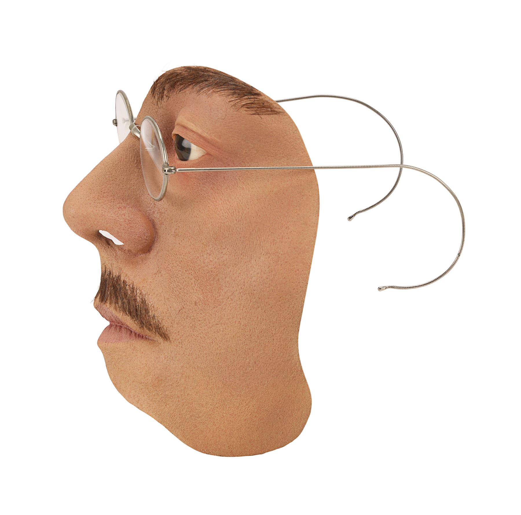 The plastic mask is painted to create the realistic appearance of human facial skin, with the added features of red lips, a glass eye, an eyebrow and a moustache, both made from faux hair. Circular metal spectacles with glass lenses are attached to the face by a thin piece of plastic wiring that feeds through a small hole above the nose. An additional line of plastic wiring comes with the lot, enabling the mask to be worn securely. The mask is accompanied by a certificate of authenticity from HBO as well as a display stand. Dimensions: 15 cm x 11 cm x 14.5 cm (6" x 4 1/4" x 5 3/4")