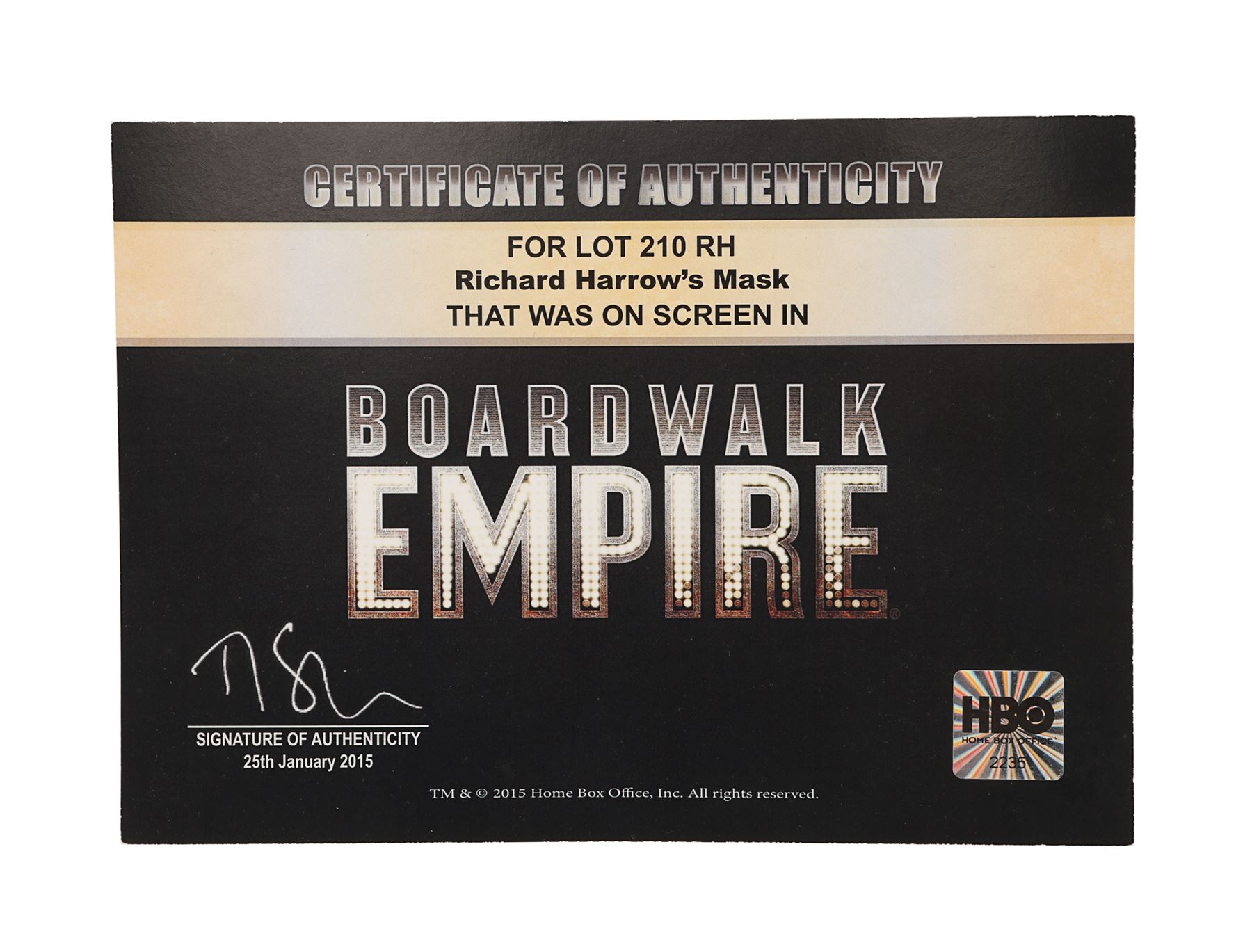 Richard Harrow's (Jack Huston) prosthetic face from the Emmy-award-winning TV series Boardwalk Empire. Richard's face was disfigured in combat while fighting in WWI. On returning to his family in America, he wore the mask throughout the series to conceal his gruesome wounds.