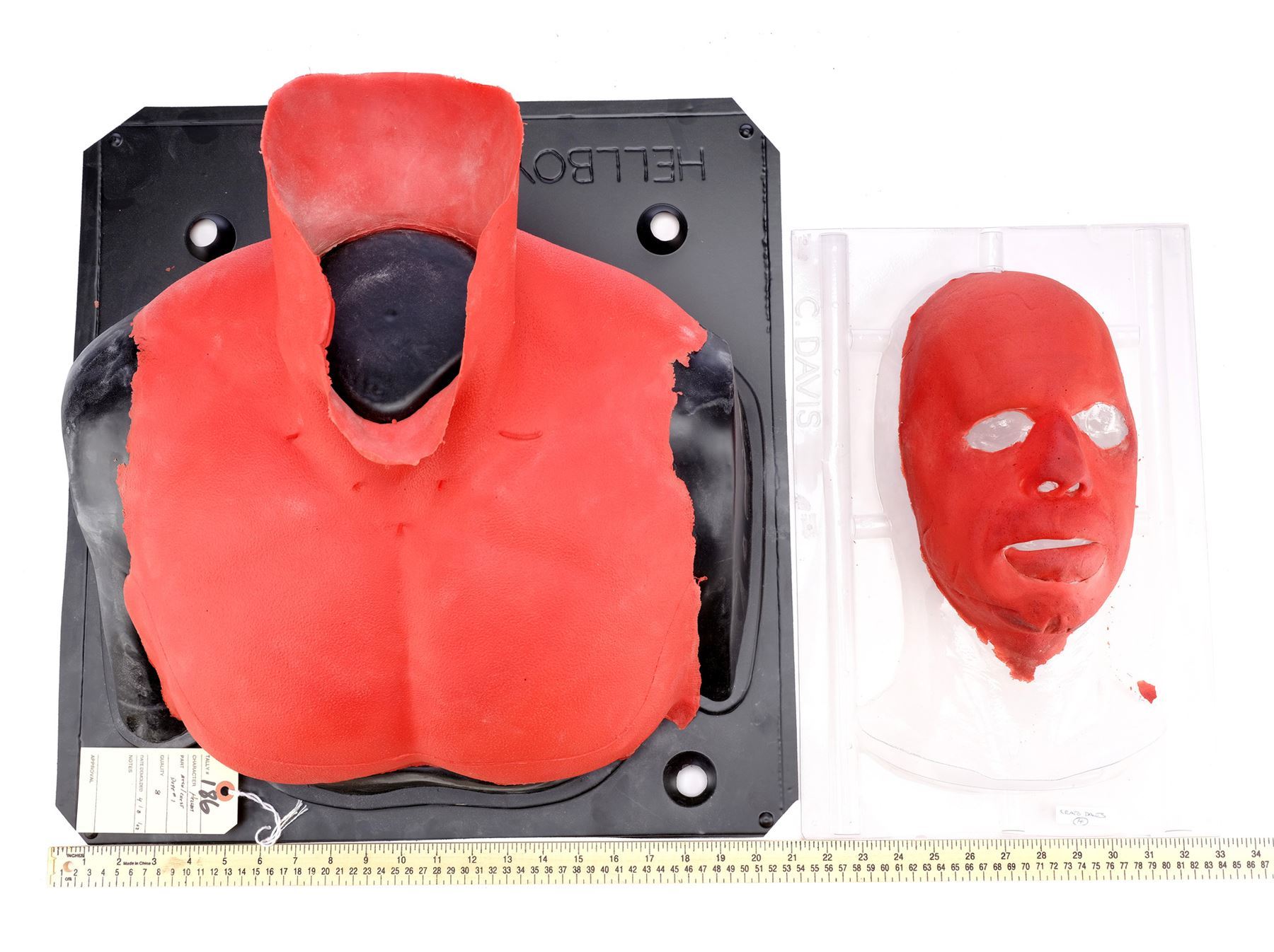 Created by special effects director Rick Baker's Cinovation Studios, this sculpted foam latex makeup appliance is painted dark red to match Hellboy's devilish appearance and carved with lines. Also included is a black plastic bust for stability. The appliance exhibits some tearing around its edges and stiffening from production wear and age, and the base exhibits scuffing throughout.