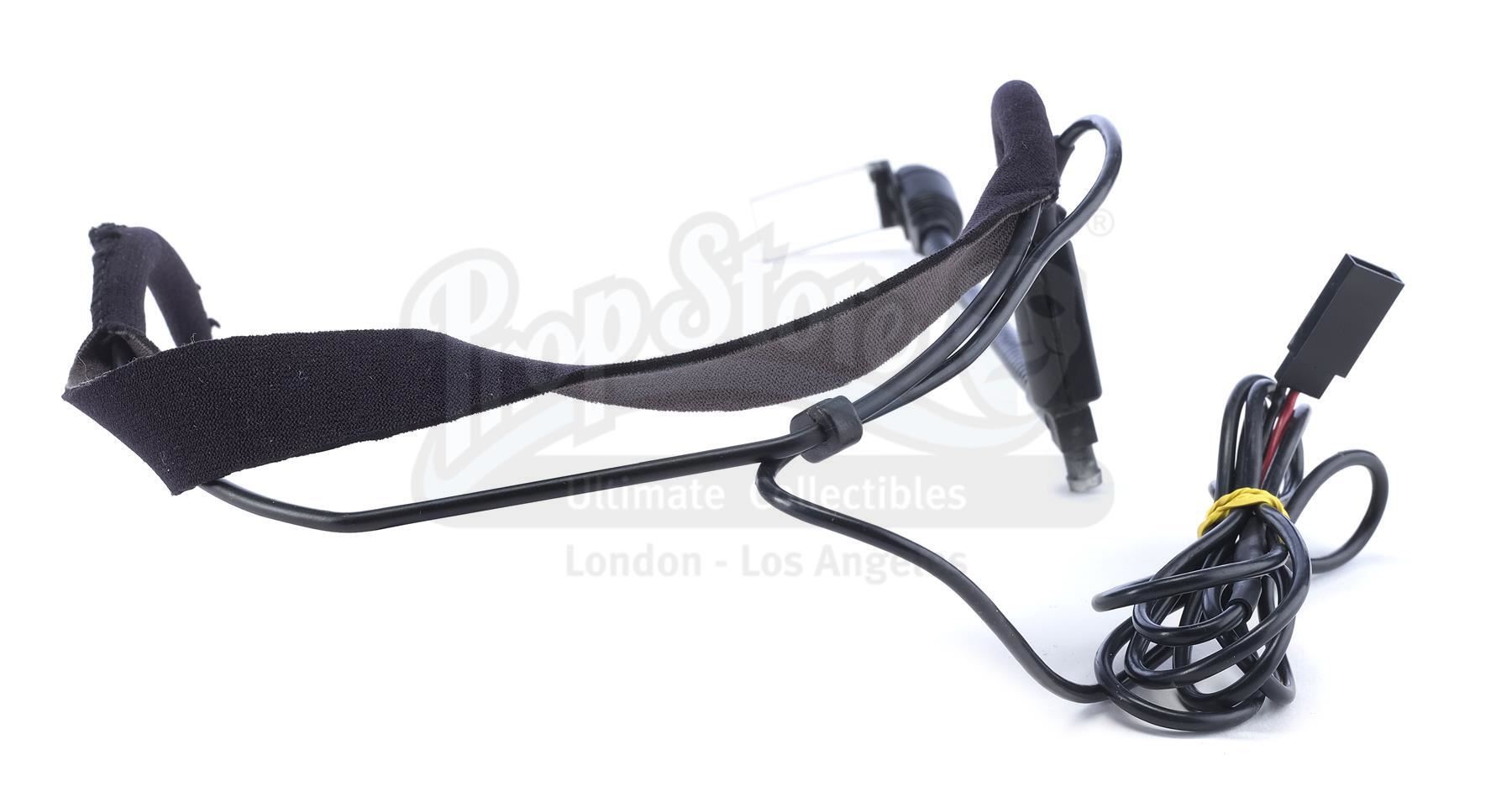 This lot will be auctioned on Wednesday, June 30th. The auction will begin at 9:00am PDT and lots are sold sequentially via live auctioneer; tune in to the live streaming broadcast on auction day to follow the pace. Note other lots in the auction may close on June 29th or July 1st. A Precrime headset from Steven Spielberg's sci-fi action film Minority Report. Officers working as liaisons between Precrime headquarters and field officers wore headsets to communicate while reviewing previsualized crimes. This black plastic and metal headset consists of a clear eyepiece on an arm attached to an elastane-wrapped headband with an attached cable running to a black plastic plug numbered "007550-0139" by production. It is in good overall condition with some wear from production and age, including the elastane wrap loosening from the headband. Dimensions: 5.5" x 6.5" x 2.5" (14 cm x 16.75 cm x 6.5 cm) Contains electronic components; see notice in the Buyer's Guide Estimate: $500 - 700