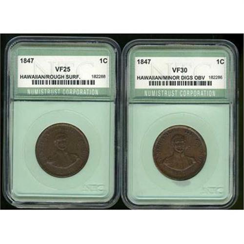 Lot 898 - Lot of Two 1847 Hawaiian Cents NTC Various VF