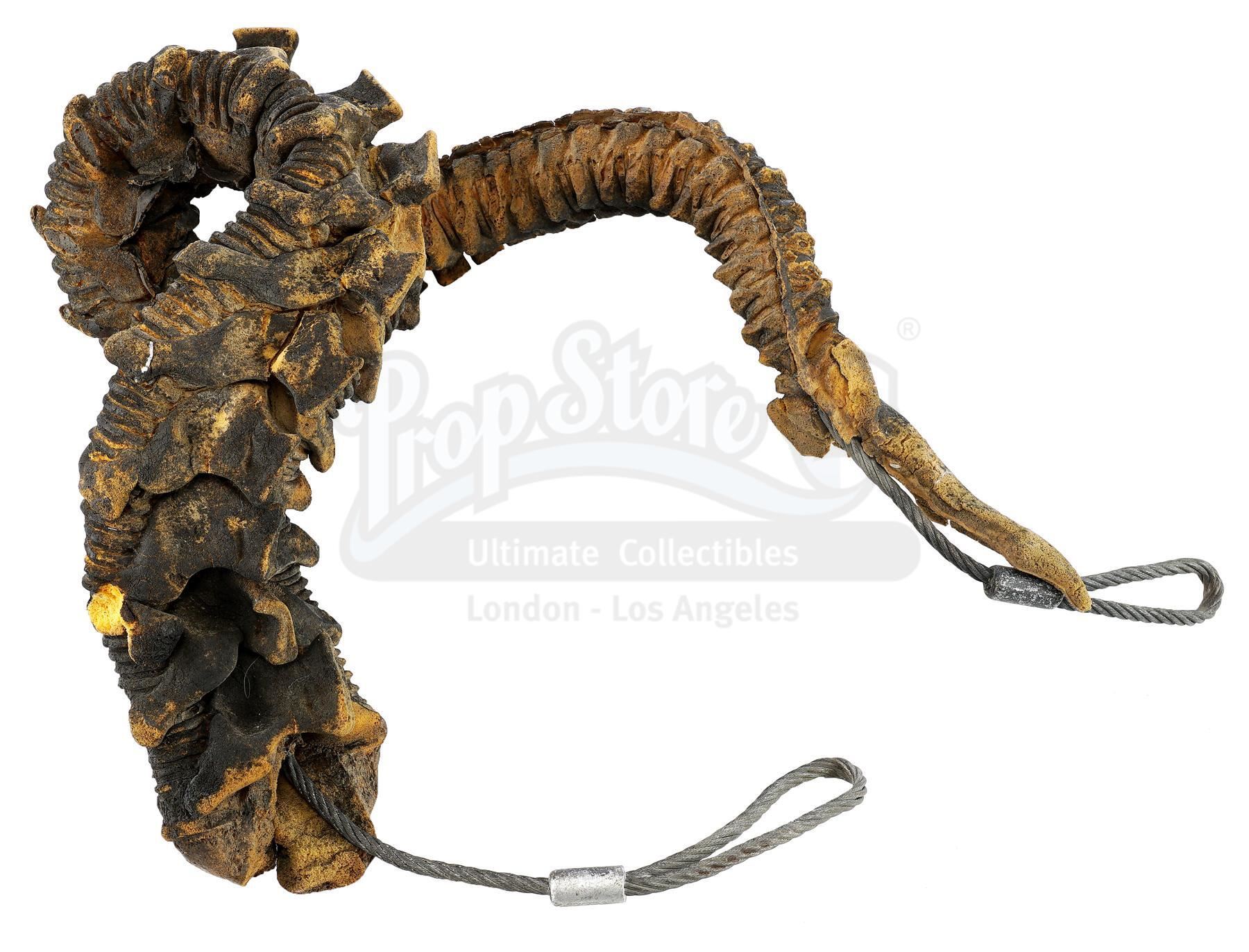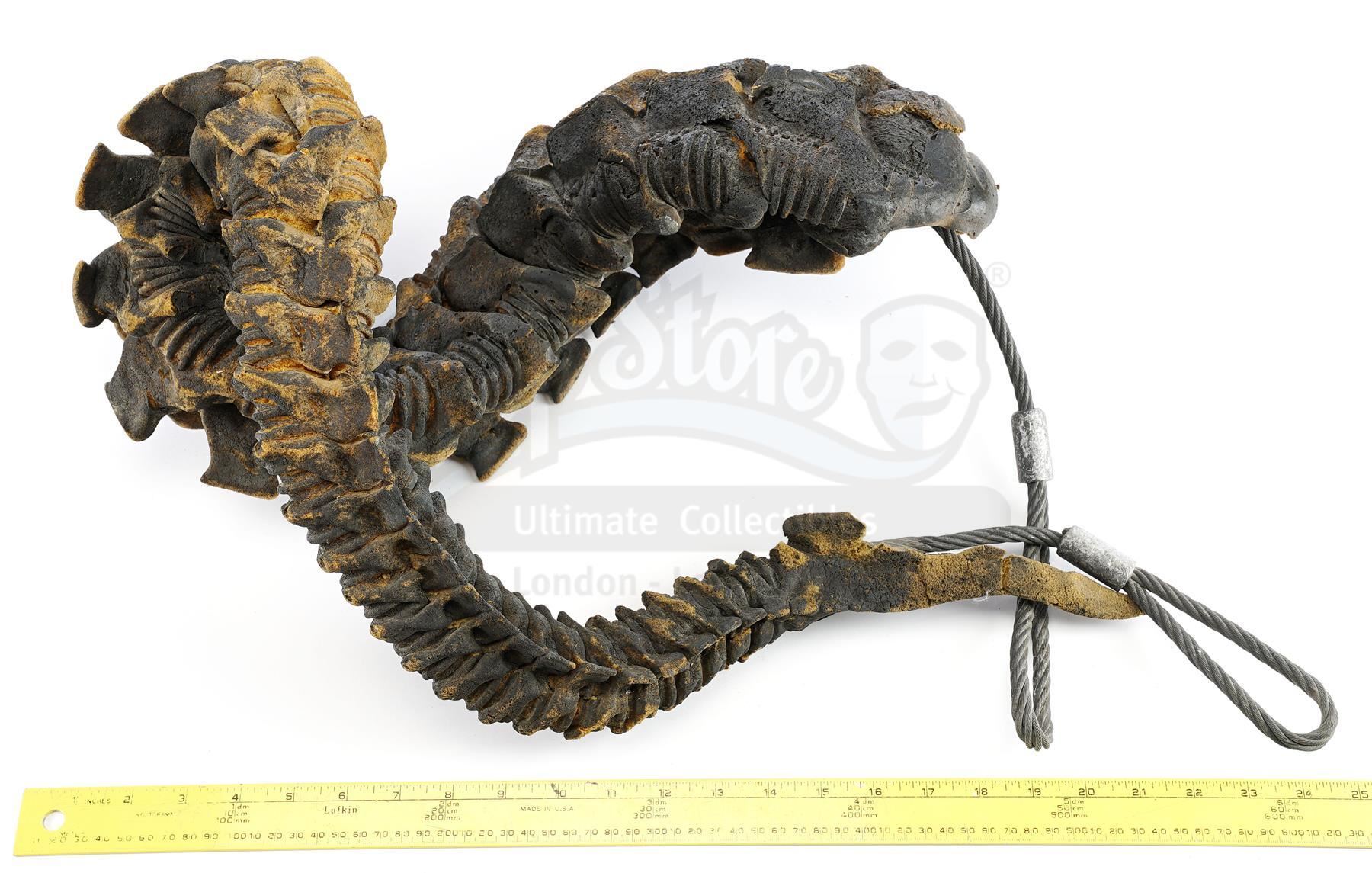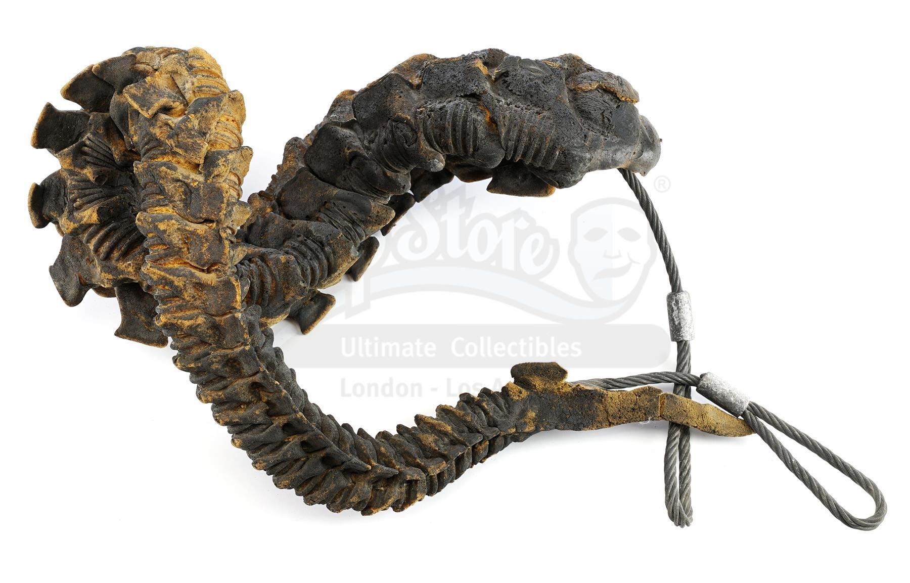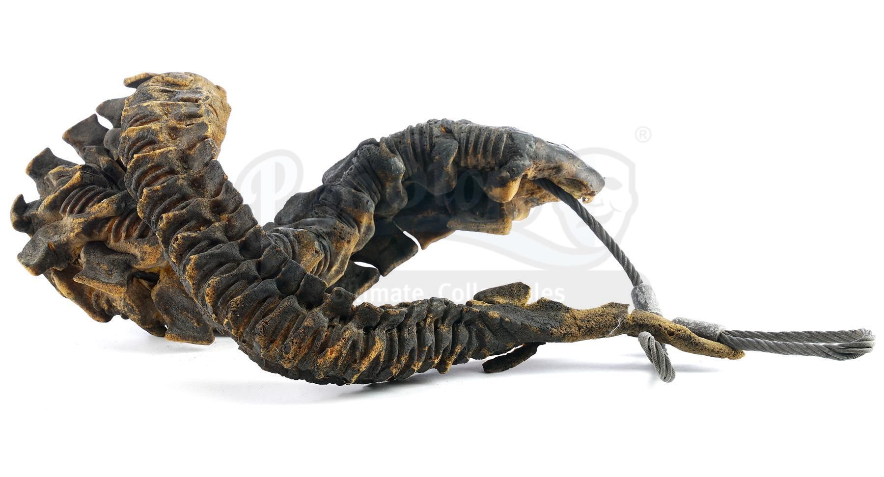 This lot will be auctioned on Tuesday, June 29th. The auction will begin at 9:00am PDT and lots are sold sequentially via live auctioneer; tune in to the live streaming broadcast on auction day to follow the pace. Note other lots in the auction may close on June 30th or July 1st. A xenomorph Warrior tail from James Cameron's sci-fi action sequel Aliens. Xenomorph Warriors stalked Ellen Ripley (Sigourney Weaver) and the colonial marines throughout the Hadley's Hope colony. Stan Winston Studio created multiple versions of the Warriors based on new designs by Cameron and creature creator Stan Winston, including maneuverable puppets with articulating appendages and posable individual alien parts designed for blowing up or destroying. This ridged polyfoam tail is painted black and molded around looped steel operating cables. It is in fair overall condition with much of the foam exposed and cracking from age and production use. Dimensions: 20" x 20" x 13" (51 cm x 51 cm x 33 cm) Estimate: $3,000 - 5,000