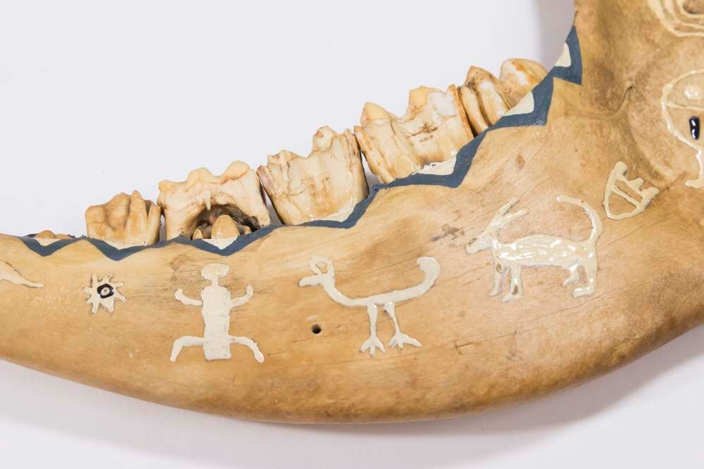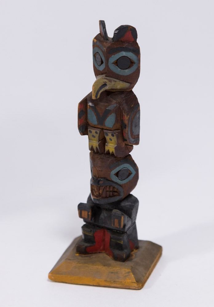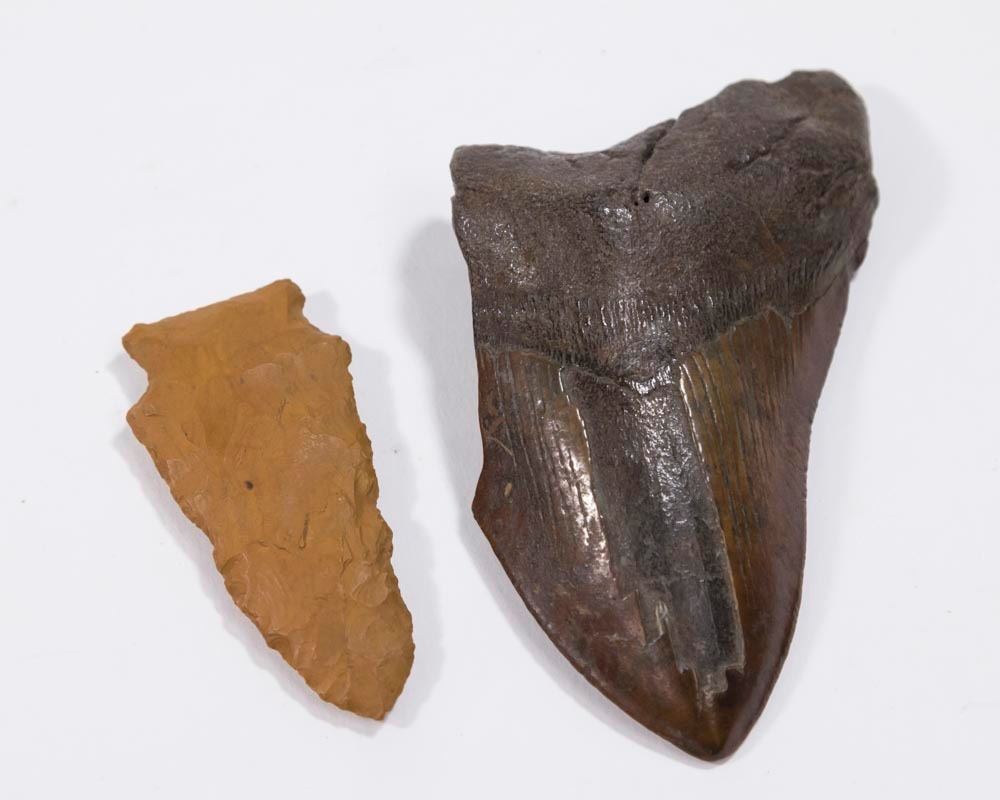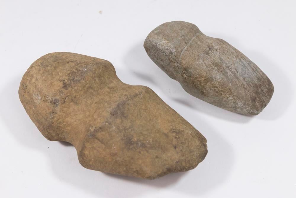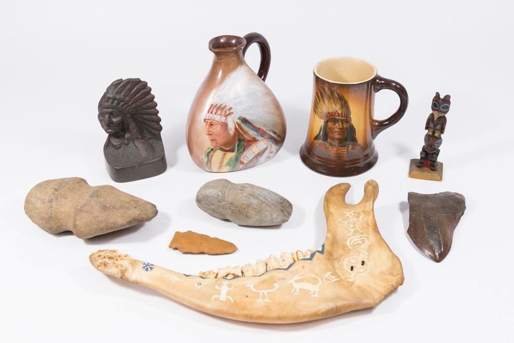 Ax heads, jaw bone, single bookend, mug, jug, two totems, arrowhead, and shark tooth. Tallest approx. 6 1/4" H, arrowhead 3" L.