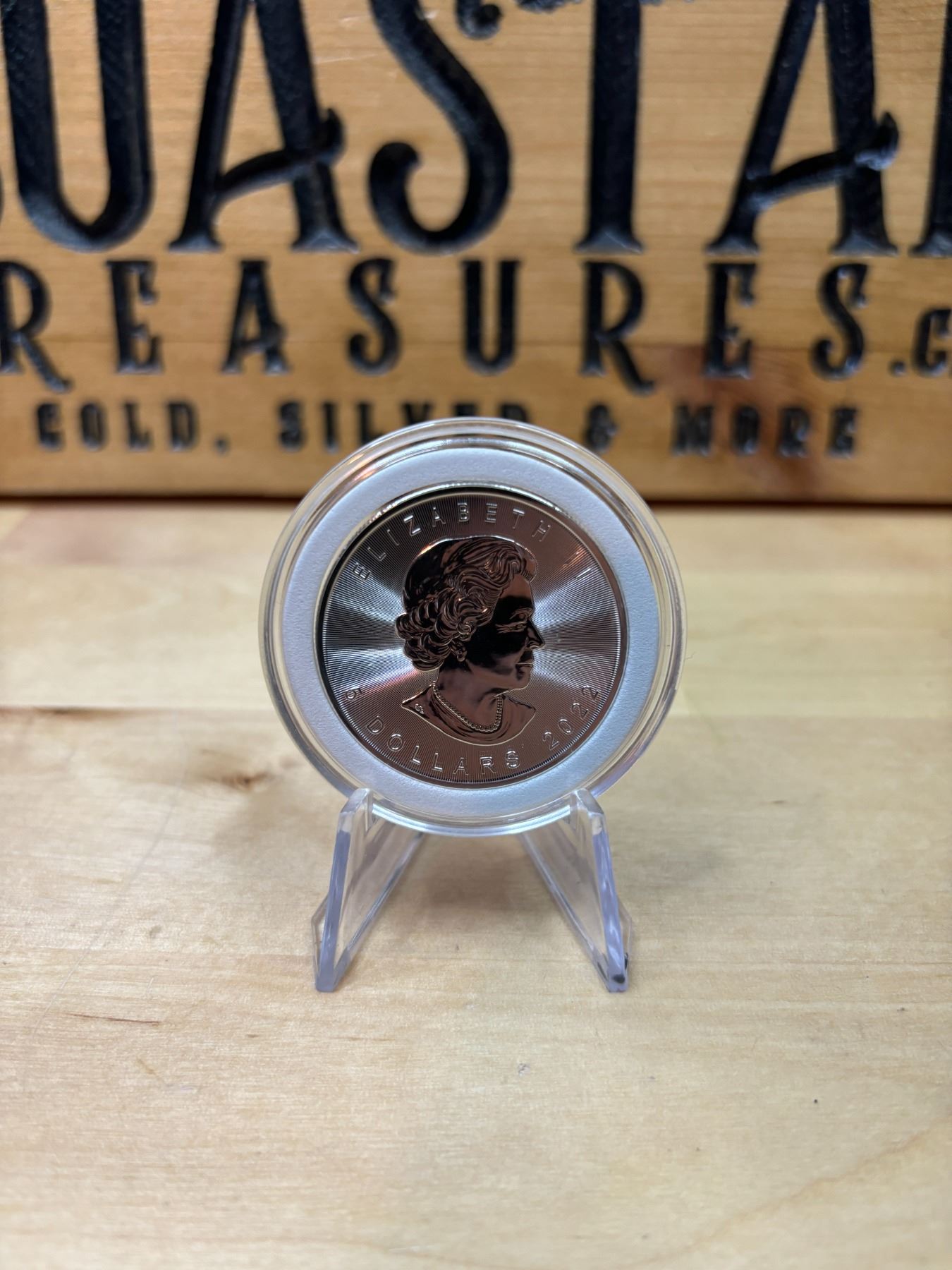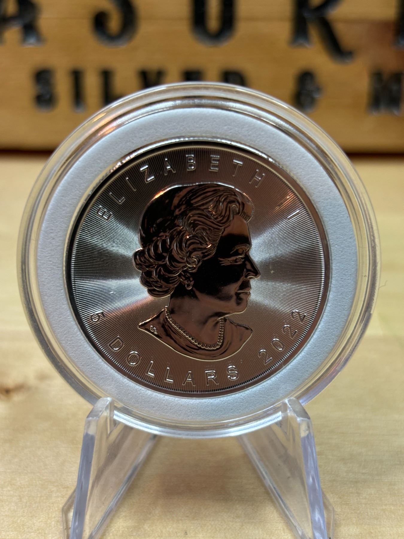 The 2022 1 oz Canadian Silver Maple Leaf is a .9999 fine silver coin minted by the Royal Canadian Mint. It features the iconic maple leaf on the reverse, with enhanced security features such as micro-engraved radial lines. The obverse showcases the new effigy of King Charles III, following the passing of Queen Elizabeth II, along with a face value of 5 Canadian dollars. Known for its high purity and craftsmanship, this coin is a favorite among collectors and investors.