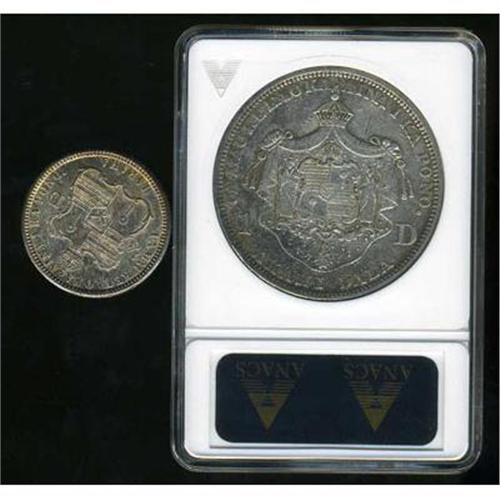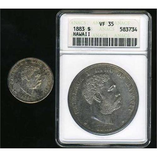 Lot of Two1883 Hawaiian Coins. Includes 1883 Quarter MS60 toned and 1883 Dollar ANACS VF35 (a minor planchet flaw at the King's chin). (#10987)