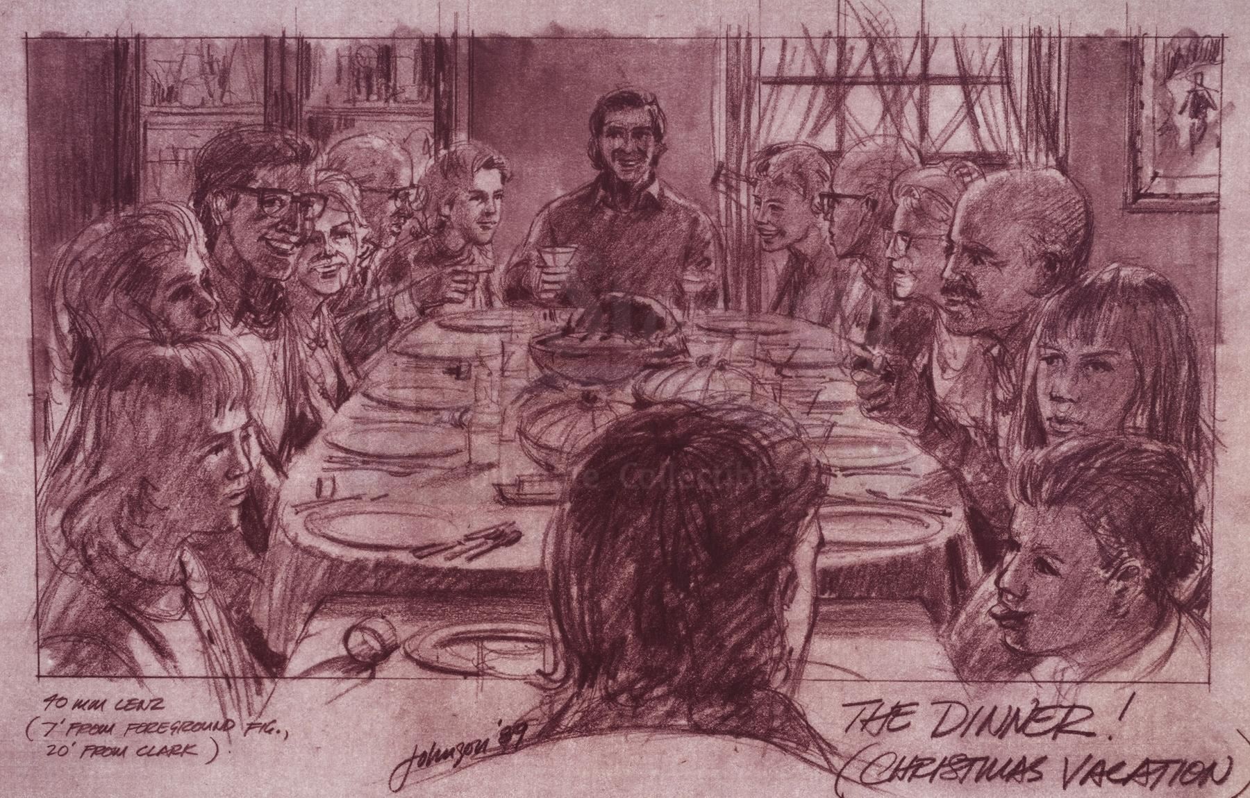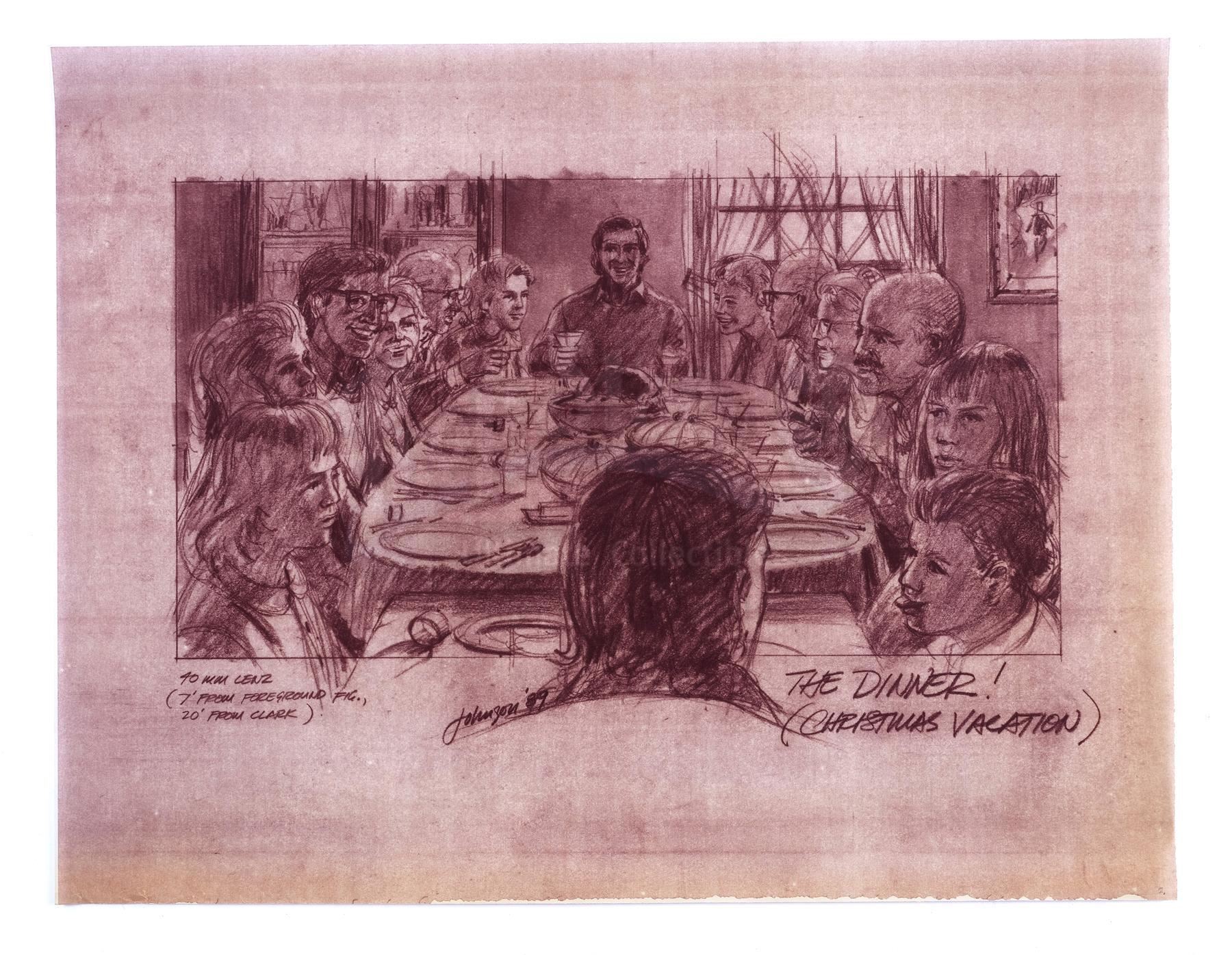 This lot will be auctioned on Thursday, July 1st. The auction will begin at 9:00am PDT and lots are sold sequentially via live auctioneer; tune in to the live streaming broadcast on auction day to follow the pace. Note other lots in the auction may close on June 29th or June 30th. A print of a Jack Johnson concept illustration of the Griswold Christmas dinner from the production of Jeremiah Chechik's comedy sequel National Lampoon's Christmas Vacation. The Griswolds assembled for a disastrous Christmas dinner at home. This is a production-made sepia print of a visualization concept illustration originally rendered, signed, and dated "89" in mixed media by illustrator Jack Johnson. It is labeled "The Dinner! Christmas Vacation" and "40mm Lenz (7' from Foreground Fig., 20' from Clark." The print is in excellent overall condition with minor edge wear from storage. Dimensions: 13" x 20" (33 cm x 51 cm) Sold without copyright; see notice in Buyer's Guide. Estimate: $1,200 - 1,800