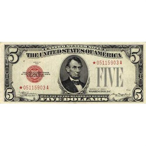 1928, $5 Legal Tender Note. Fr-1525*. KL-1639*. (#*05115903A). A tiny corner dent, otherwise choice. Small size star notes like this handsome 1928 Red Seal have become popular collector items in recent years, with advancing prices propelled by the increased interest.