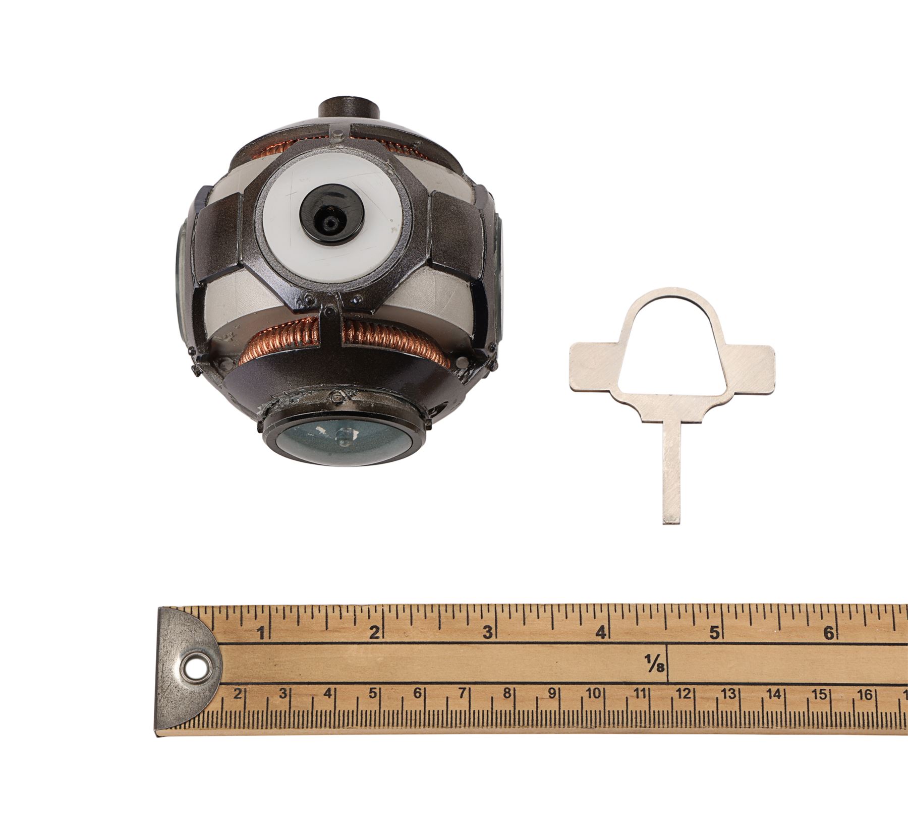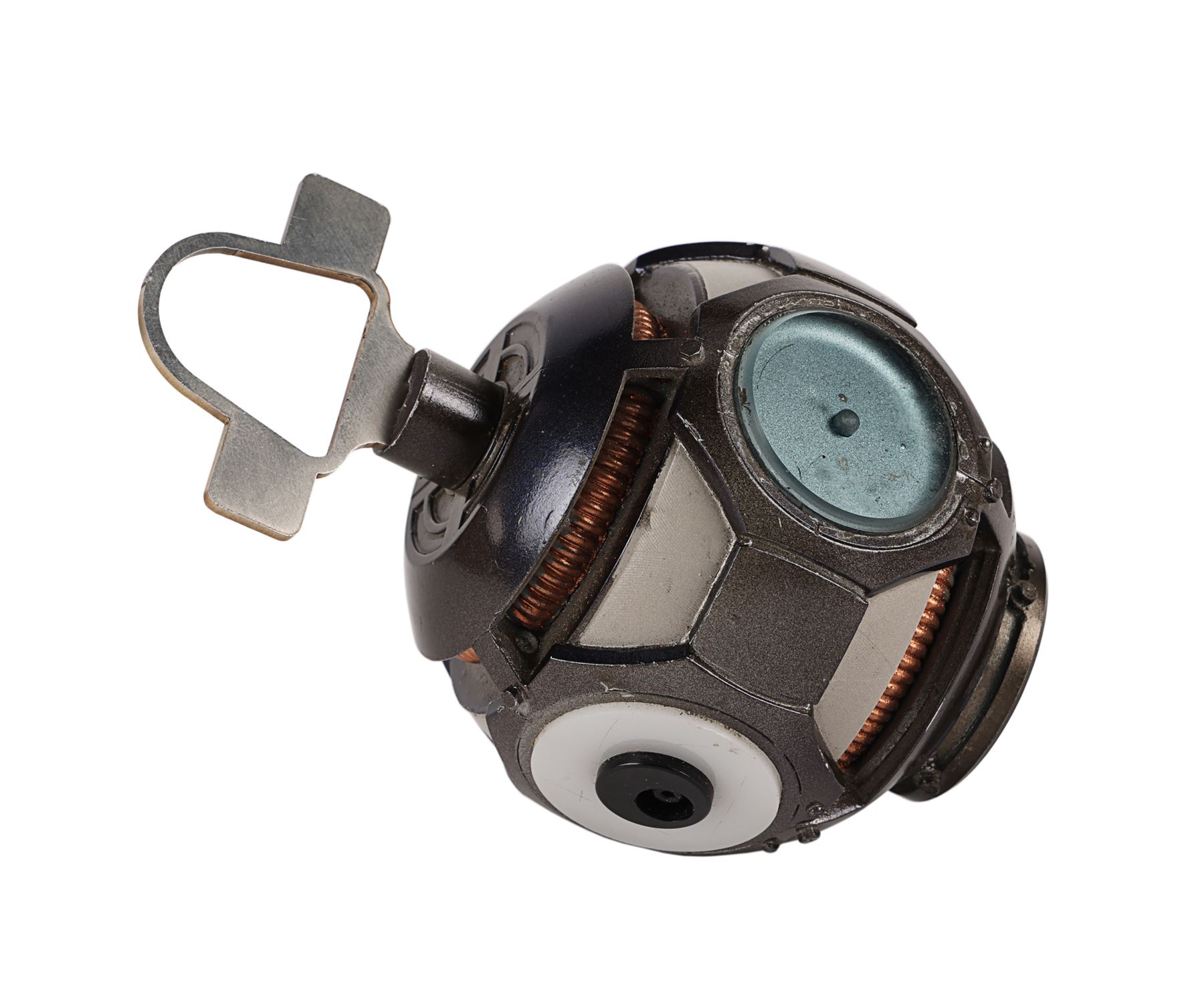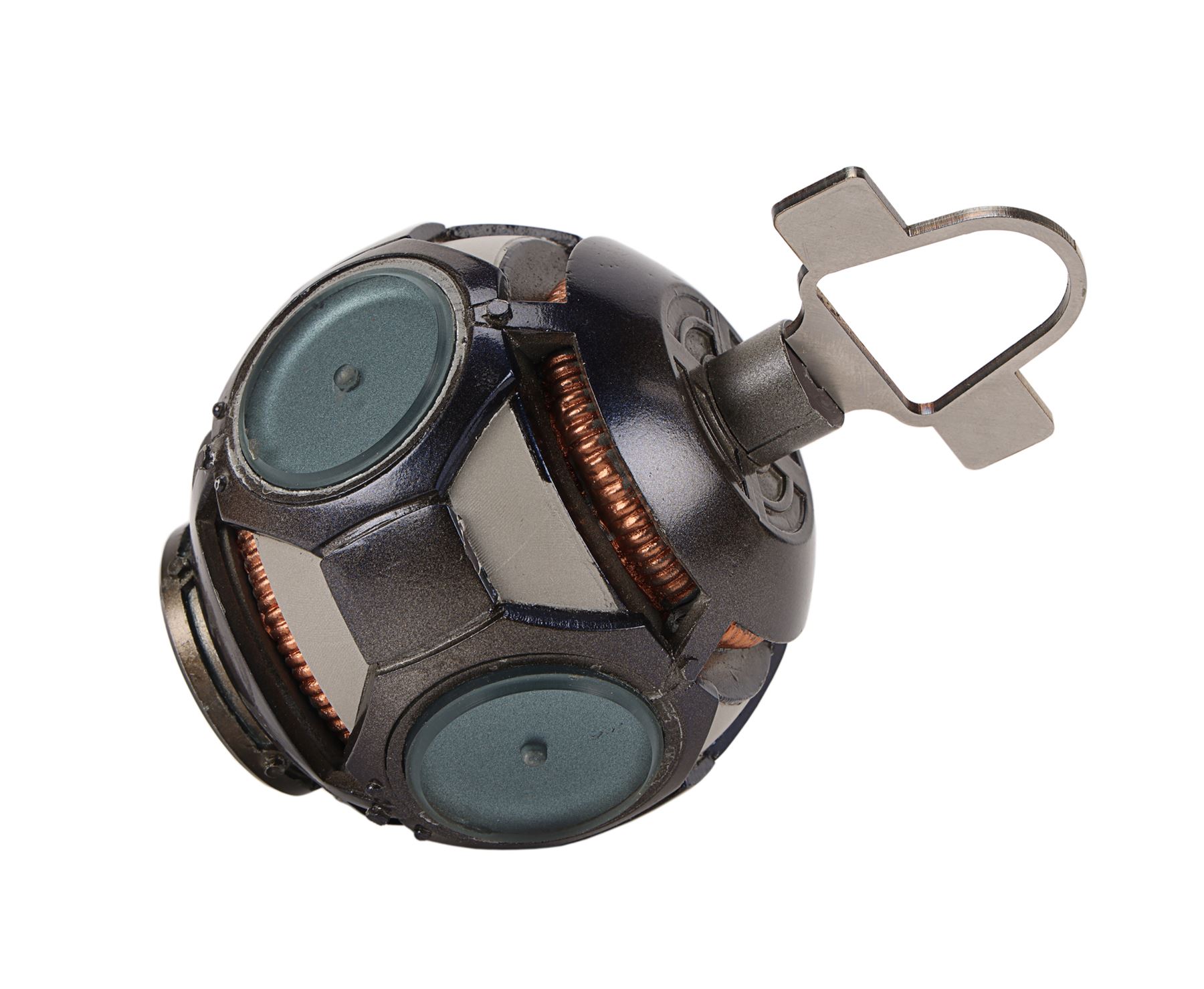 The dark grey and silver-coloured resin bomb displays a geometric design, with coil-like detailing in copper-coloured paint and four circular blue acrylic pieces. It comes with a removable metal pin which inserts into the top. The lot displays marks on the acrylic panels, scuffing and paint wear. Dimensions: 7.5 cm x 7.5 cm x 12 cm (3" x 3" x 4 3/4")