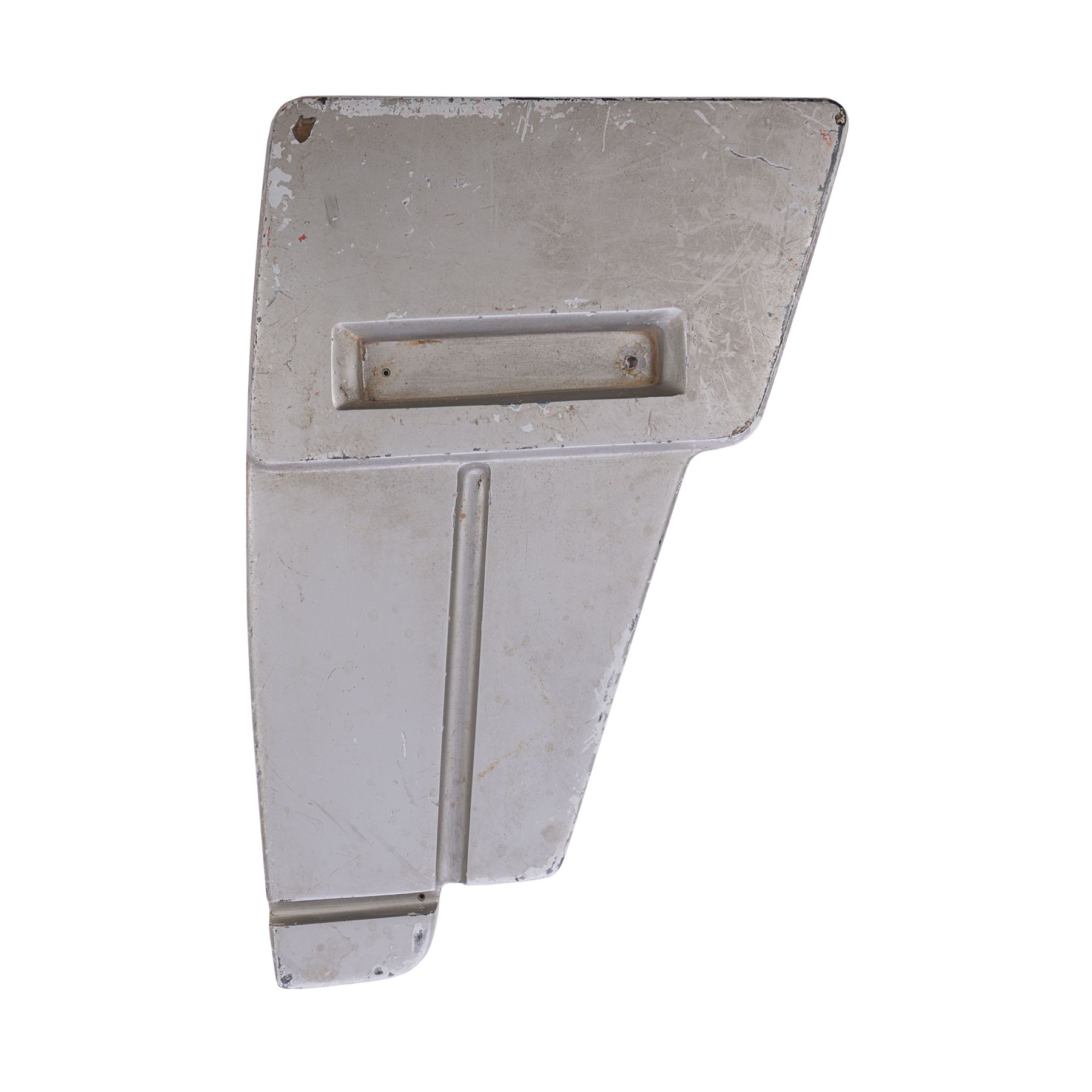 This panel is one of several external panels that adorned the vehicle, giving it a sleek, futuristic appearance. Made of resin and painted silver, the trapezium-shaped piece features three perpendicular grooves, one of which has dual screw holes at each end. The item exhibits signs of wear from production use and age, including scratches and loss of paint. Dimensions: 60.5 cm x 38 cm x 3 cm (23 3/4" x 15" x 1 1/2")