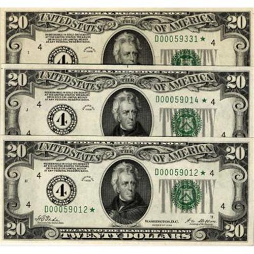 Lot of 3 1928 $20.00 Federal Reserve Notes.. Serial numbers include #D00059012*, #D00059014* and #D00059331*. Two of these are Choice Crisp Uncircuated, the other a crisp About Uncirculated. Lot of 3 notes.