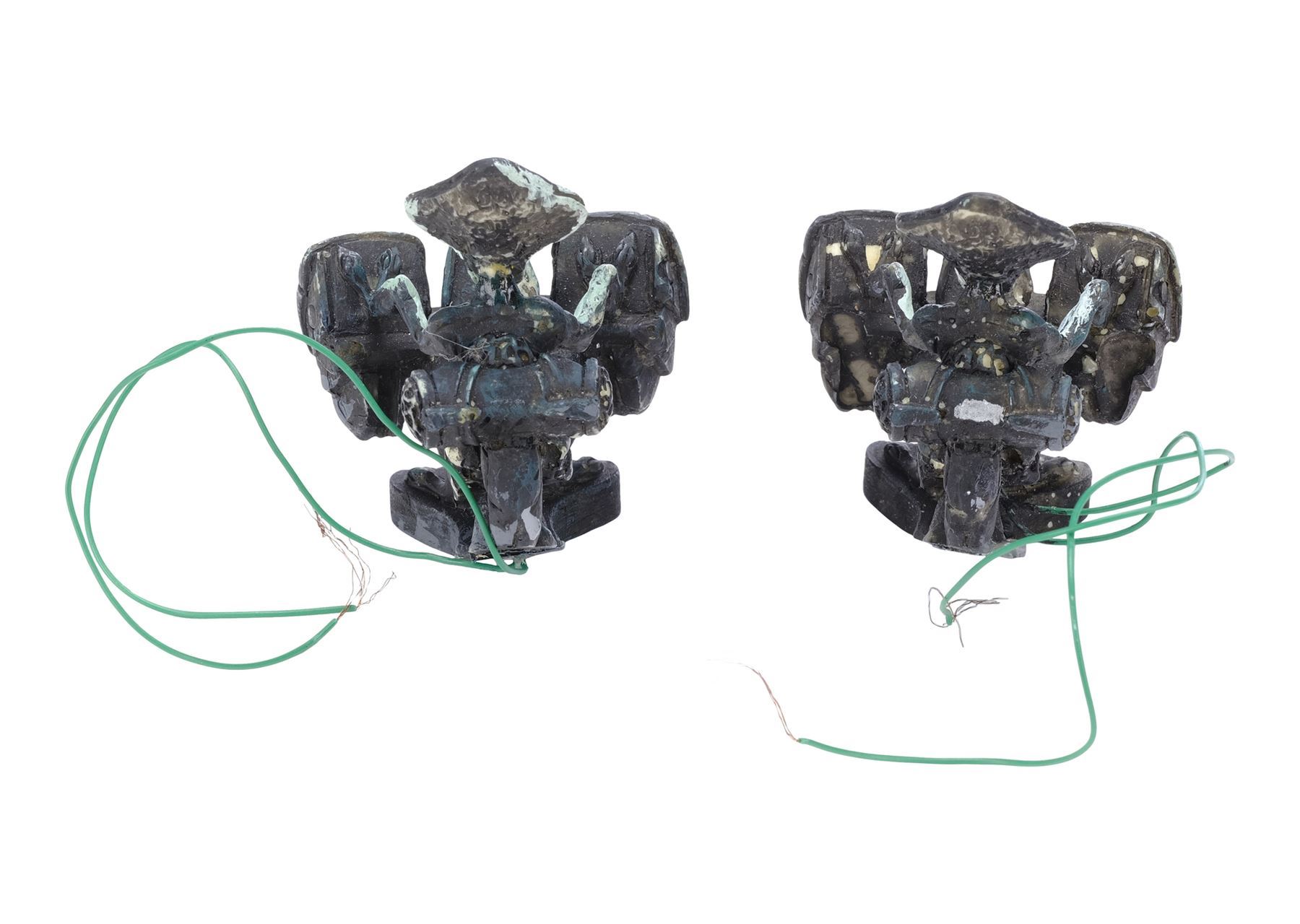 Constructed by effects company Cinema Production Services, these two ornately detailed cast resin models are hand-painted blue and green and come mounted to command stations inset with electronic wiring for powering lights. They exhibit chipped paint, exposing the resin, and have had their wires cut following production, rendering them non-functional. Dimensions: (each) 3" x 3" x 3" (7.75 cm x 7.75 cm x 7.75 cm)