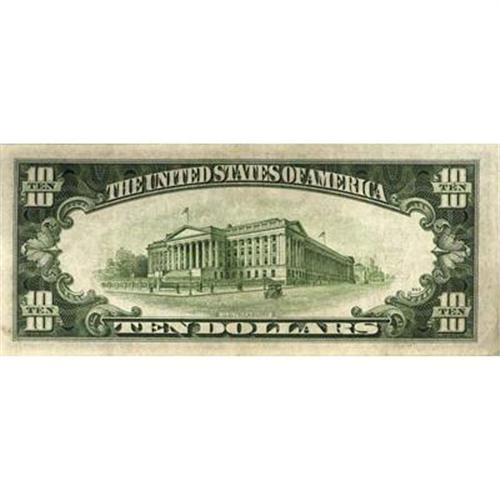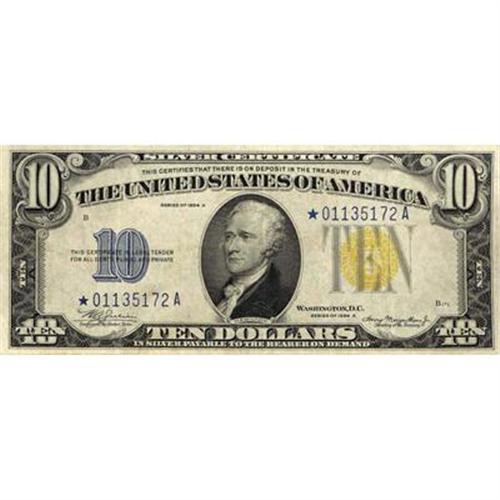 1934, $10 World War II Emergency Note. (#*01135172A). Very desirable star note of this distinctive Type with the blue serial numbers but yellow seal. These circulated in the North Africa theater of World War II. Faint folds; possibly pressed.