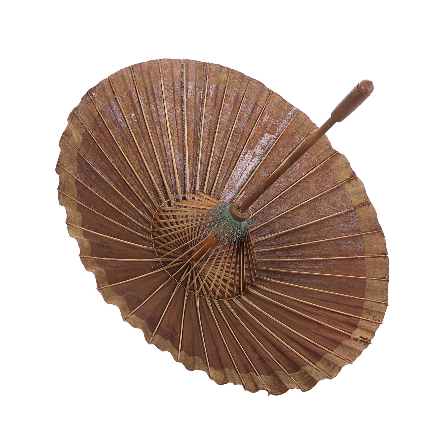 This umbrella features a carved wooden handle, a red-and-blue linen canopy, and a swatch of red burlap beneath the ferrule. The lot comes with a letter of authenticity from Gene Winfield, the production's vehicle fabricator. The umbrella exhibits some stiffness, discoloration and grime from production use, and some of its stretchers are damaged. Dimensions: 75 cm x 18 cm x 18 cm (29 1/2" x 7" x 7")