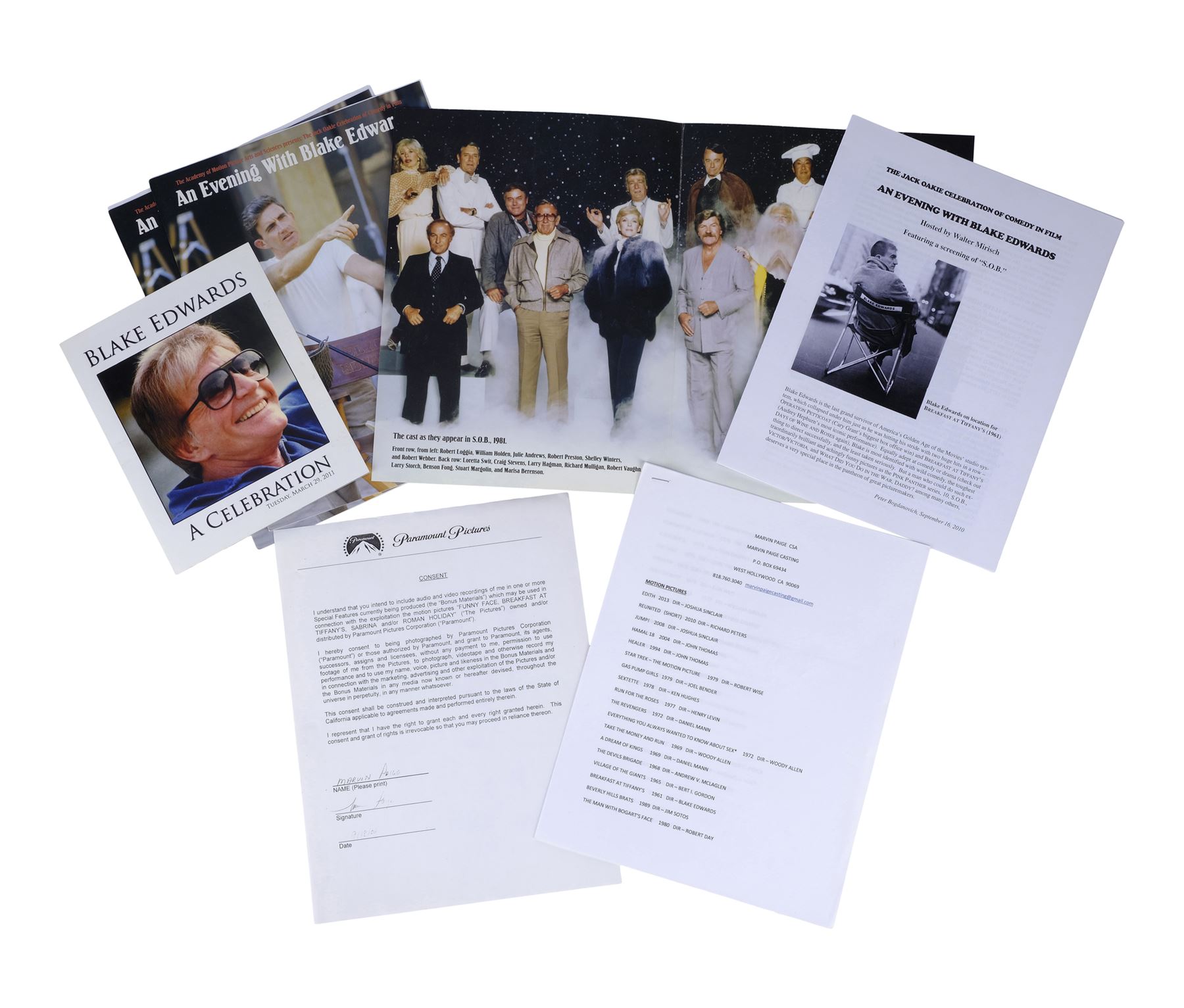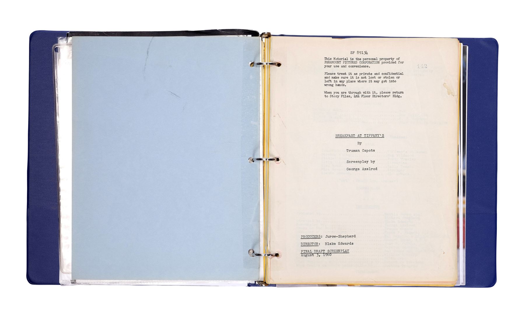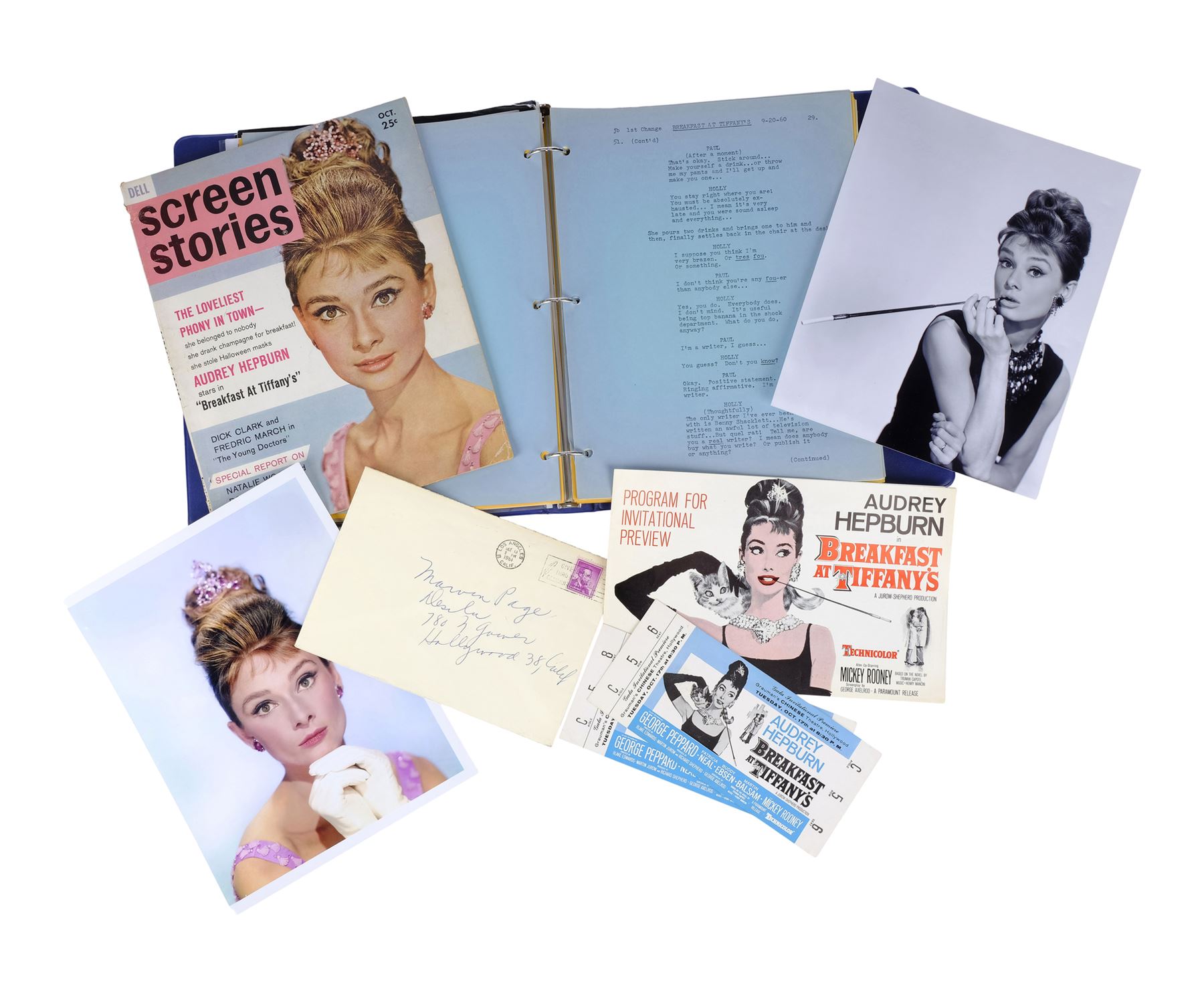 Casting director Marvin Paige's personal script and ephemera from the production Blake Edwards' Breakfast at Tiffany's. This lot consists of a 149-page script; 18 pages of copied articles, notes, and correspondences under a tab labelled "TIFFANY"; two profile photos of Audrey Hepburn; two tickets to the film's release at Grauman's Chinese Theatre; one international film program; one envelope addressed from "Miss Holly Golightly" to Paige; a Dell Scene Stories magazine featuring Hepburn on the cover, three programs for "An Evening with Blake Edwards"; and one program for "Blake Edwards A Celebration." This lot comes in a blue vinyl binder and exhibits grime throughout from age. Dimensions: (largest) 25.5 cm x 29.25 cm x 4 cm (10" x 11.5" x 1.5")