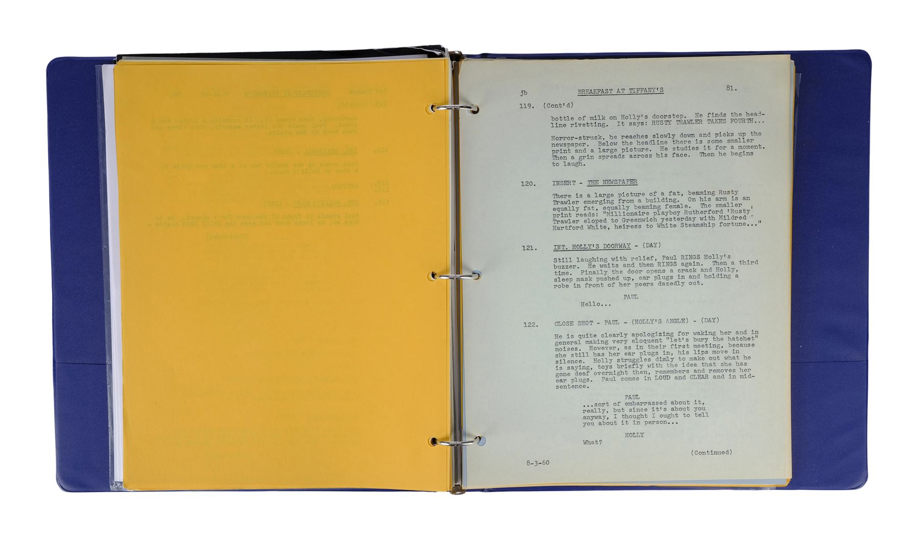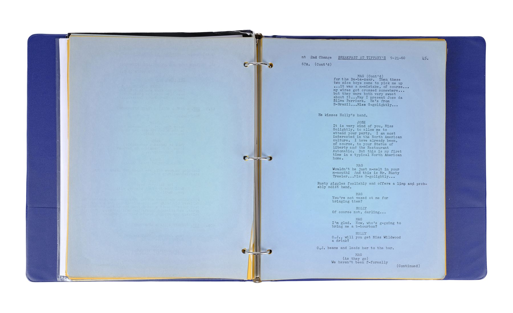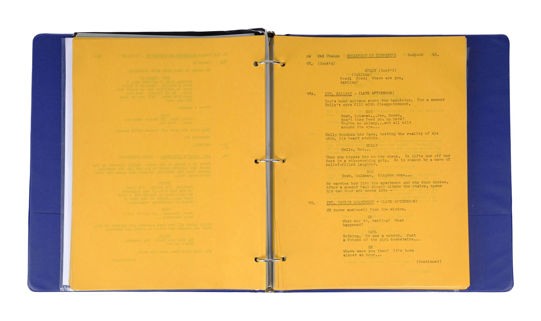 Casting director Marvin Paige's personal script and ephemera from the production Blake Edwards' Breakfast at Tiffany's. This lot consists of a 149-page script; 18 pages of copied articles, notes, and correspondences under a tab labelled "TIFFANY"; two profile photos of Audrey Hepburn; two tickets to the film's release at Grauman's Chinese Theatre; one international film program; one envelope addressed from "Miss Holly Golightly" to Paige; a Dell Scene Stories magazine featuring Hepburn on the cover, three programs for "An Evening with Blake Edwards"; and one program for "Blake Edwards A Celebration." This lot comes in a blue vinyl binder and exhibits grime throughout from age. Dimensions: (largest) 25.5 cm x 29.25 cm x 4 cm (10" x 11.5" x 1.5")