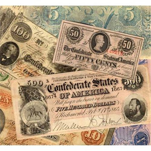 Confederate Currency Lot (25pcs).. A nice rounded selection including high denominations: 50c 1863 1st Series; $1 1862 (3 different), $1 1864; $2 1862 (2 different) and 1864; $5 1861 (2 different), 1863; $10 1861, 1864 (2 pieces); $20 1863, 1864; $50 1861, 1864 (2 pieces); $100 1862 (4 pieces), 1864; and finally a nice $500 1864 series. Grades range from Very Good to Crisp Uncirculated, with one of the $100 notes slit cancelled and then repaired with paper tape.