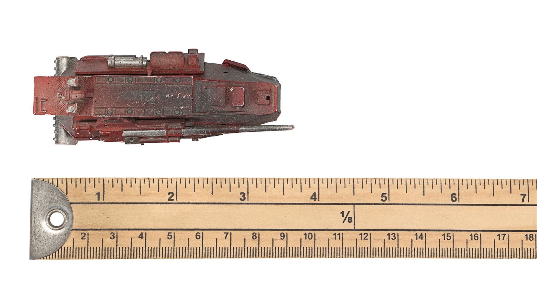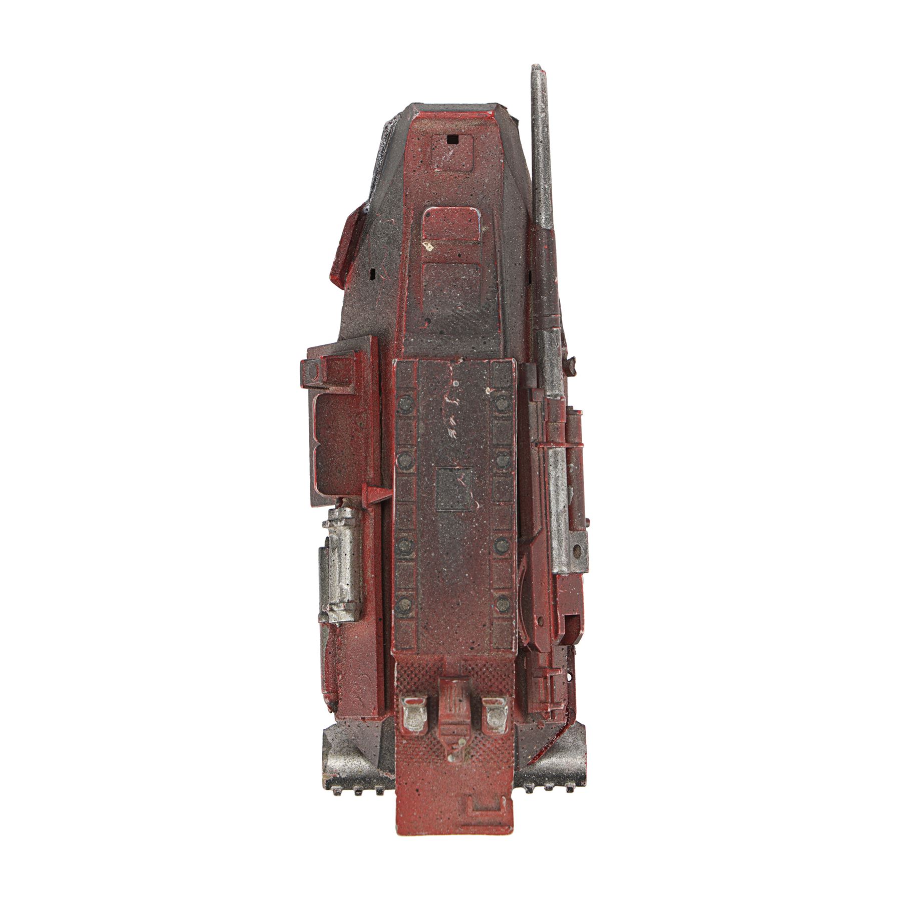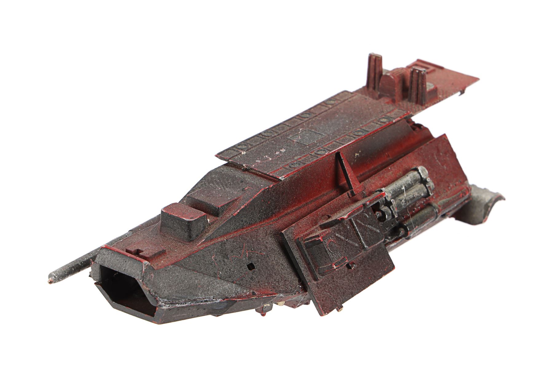 A red street vehicle miniature from the production of Ridley Scott's sci-fi classic Blade Runner. The film featured two types of flying vehicle - police spinners and private vehicles - and this is a model miniature of the latter. This lot comes from the family of Blade Runner archivist Geoff Hutchins.