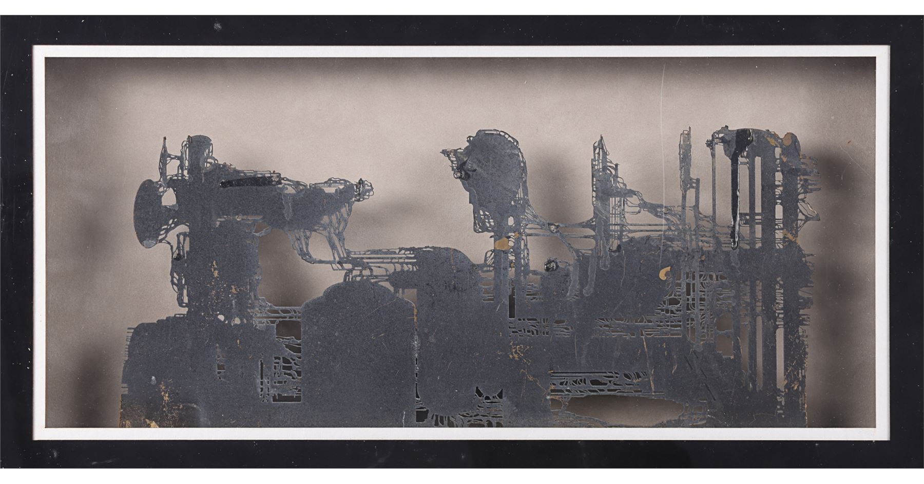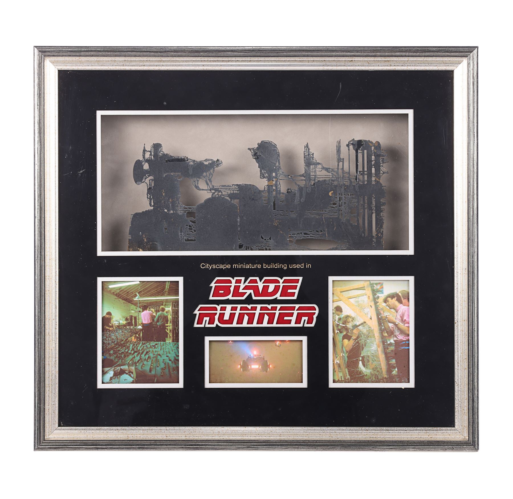 A framed skyline miniature from the production of Ridley Scott's sci-fi classic Blade Runner. Miniatures were layered as silhouettes to create the futuristic Los Angeles skyline that featured in the film's memorable opening sequence. This miniature is made of etched brass with one side painted black, and is presented in a custom-built display. This lot comes from the family of Blade Runner archivist Geoff Hutchins.
