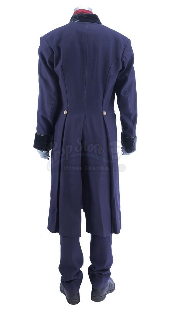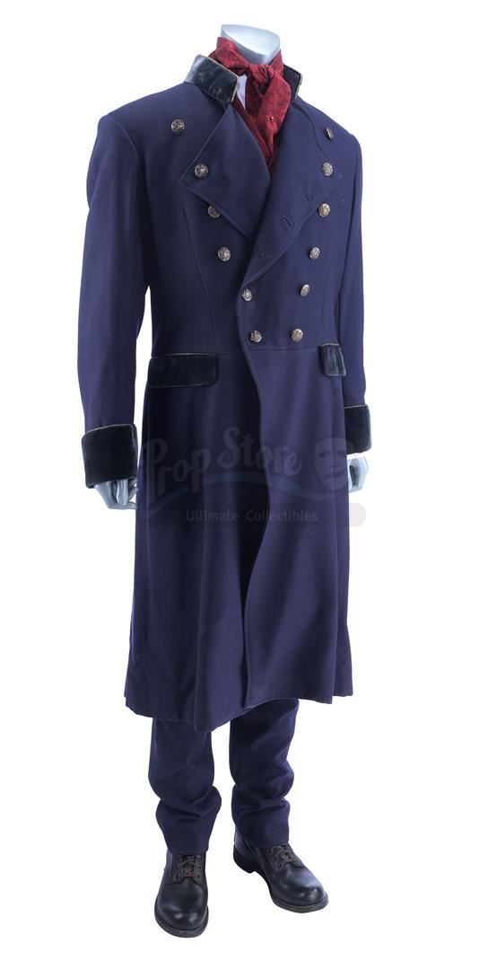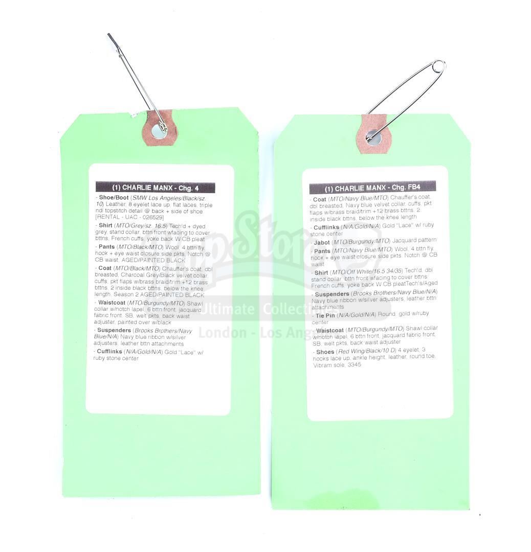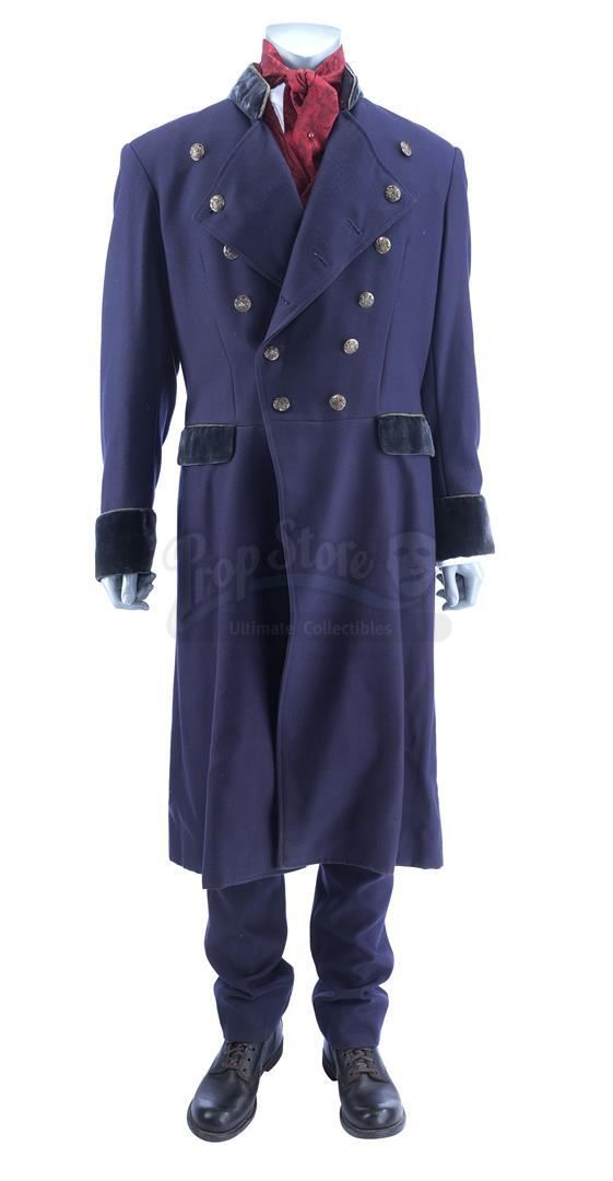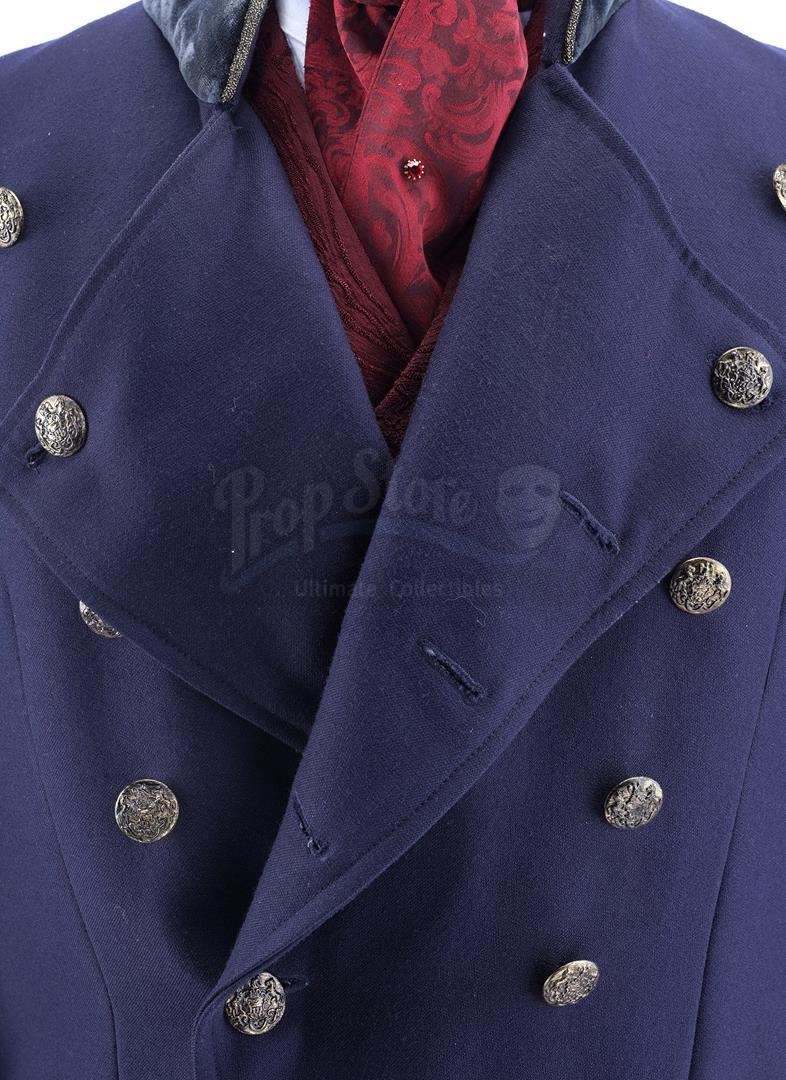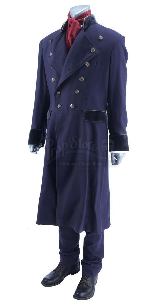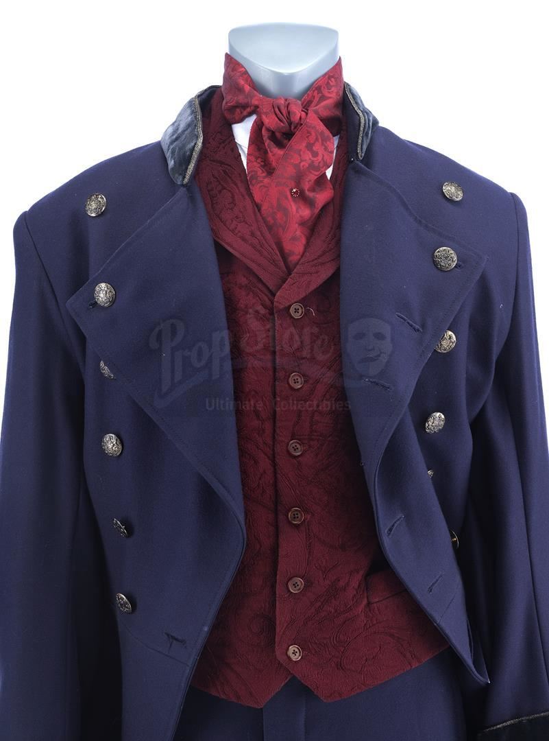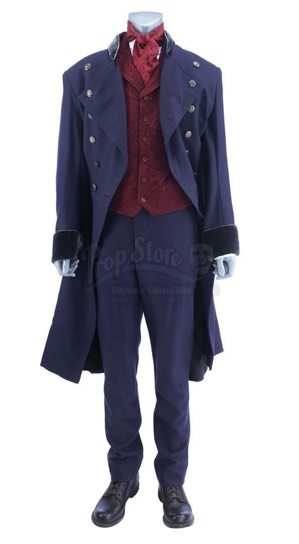 This lot will be auctioned on Thursday, July 1st. The auction will begin at 9:00am PDT and lots are sold sequentially via live auctioneer; tune in to the live streaming broadcast on auction day to follow the pace. Note other lots in the auction may close on June 29th or June 30th. Charlie Manx's (Zachary Quinto) chauffeur costume from Jami O'Brien's horror television series NOS4A2. In the Season 2 episode "Good Father," Manx wore his costume when he drove his wife Cassie (Celeste Arias) and daughter Millie (Mattea Conforti) to Christmasland in the Wraith. This costume comes directly from AMC. It consists of a blue wool waistcoat with metal buttons, matching pants, a gray cotton dress shirt, a red paisley silk ascot, a matching wool vest, black leather boots, gold and faux ruby cufflinks, and a matching gold ascot pin. The costume is in good overall condition with minor stains and frayed fabric from production wear. Estimate: $1,000 - 1,500
