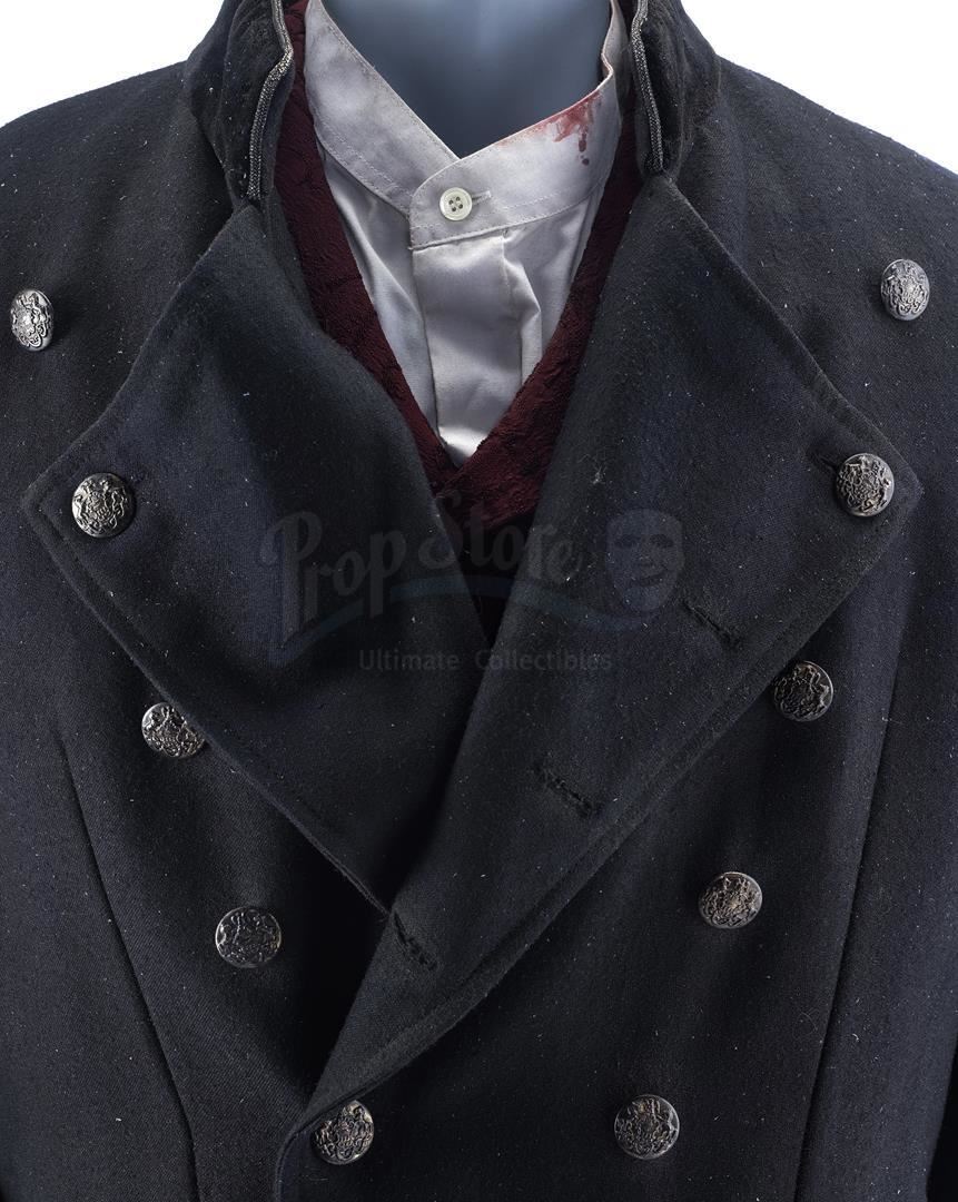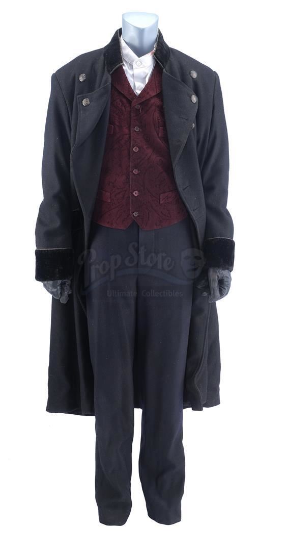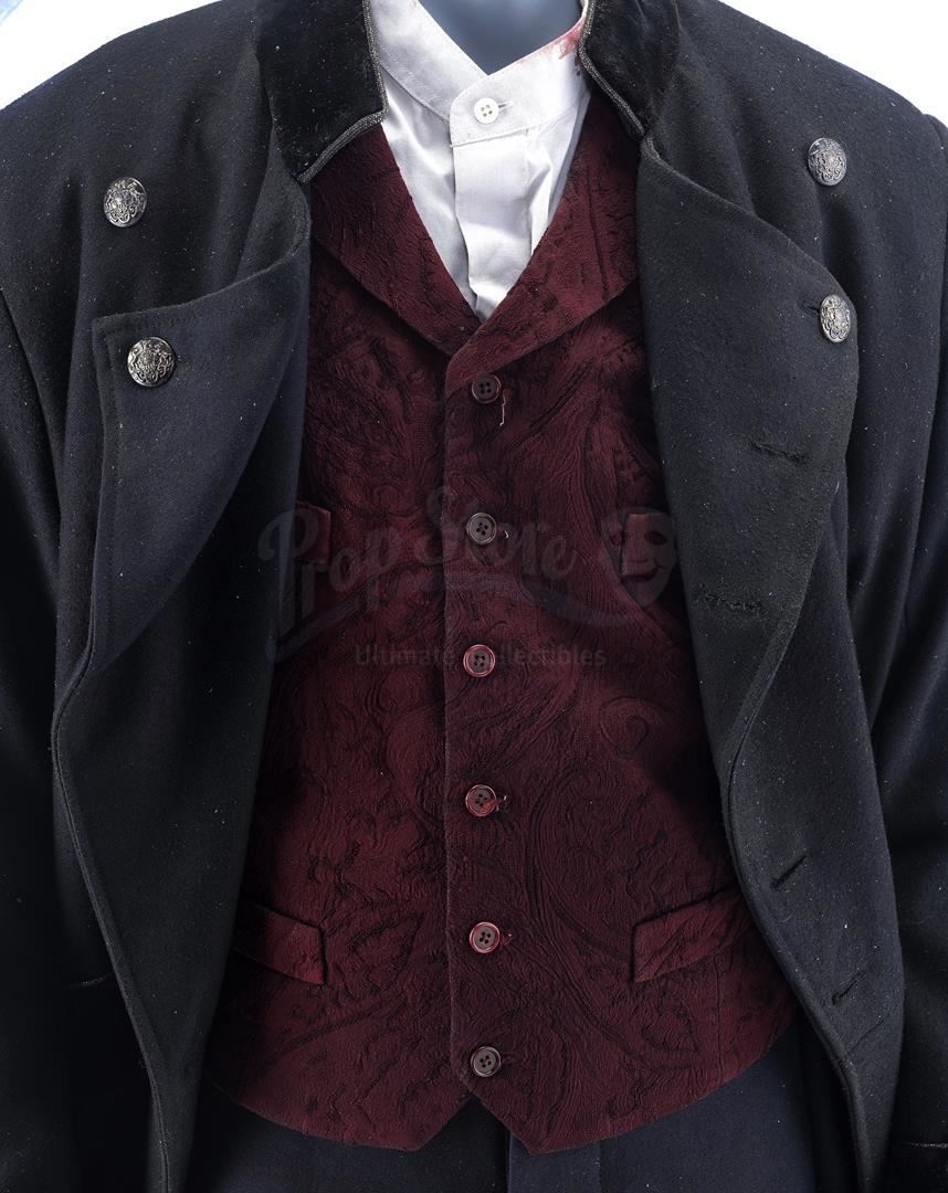 This lot will be auctioned on Thursday, July 1st. The auction will begin at 9:00am PDT and lots are sold sequentially via live auctioneer; tune in to the live streaming broadcast on auction day to follow the pace. Note other lots in the auction may close on June 29th or June 30th. Charlie Manx's (Zachary Quinto) return to Christmasland costume from Jami O'Brien's horror television series NOS4A2. In the Season 2 episodes "Welcome to Christmasland" and "Bats," the injured Manx wore his costume when he returned to Christmasland for his final showdown with Vic McQueen (Ashleigh Cummings). This costume comes directly from AMC. It consists of a navy wool waistcoat with metal buttons labeled "Hero 3&4 Dupe," matching pants, a burgundy paisley wool vest, a blood-stained gray cotton blend dress shirt, and a pair of black calfskin driving gloves. The costume is in good overall condition with frayed wool and minor stains from production wear. Estimate: $1,000 - 1,500