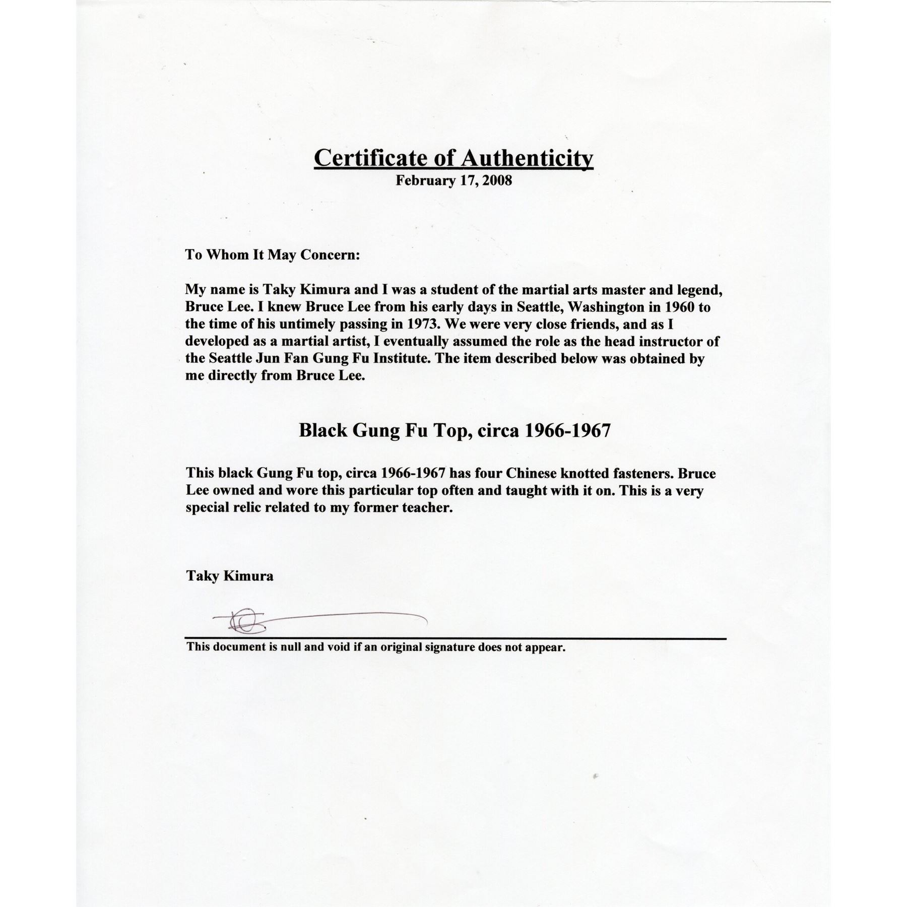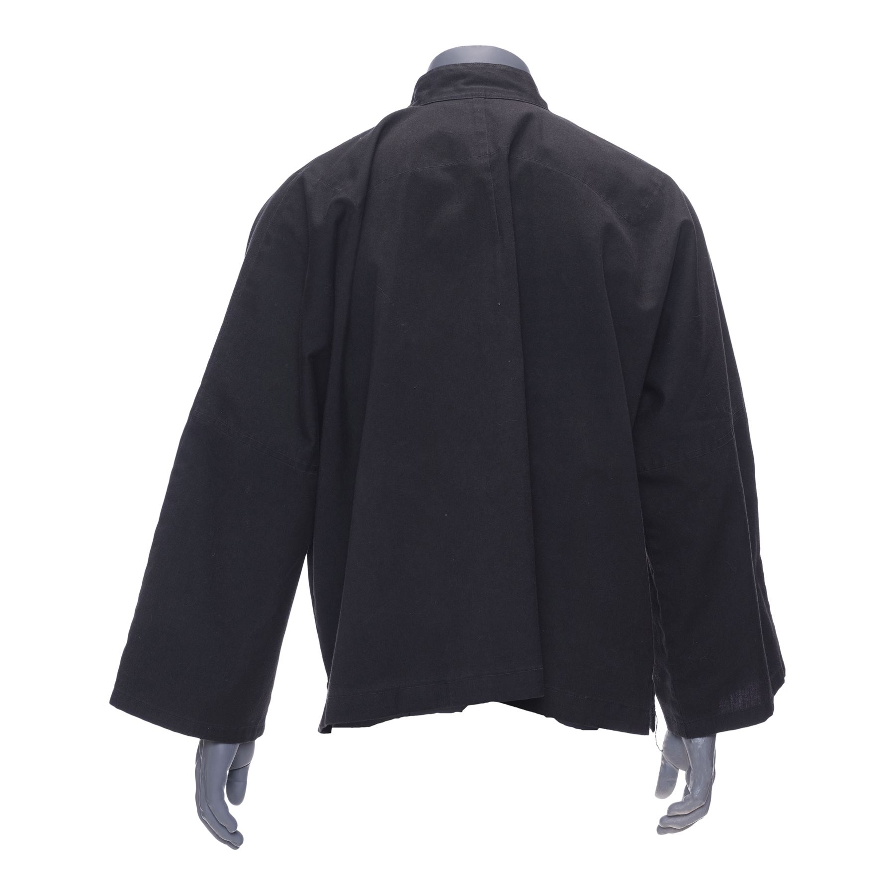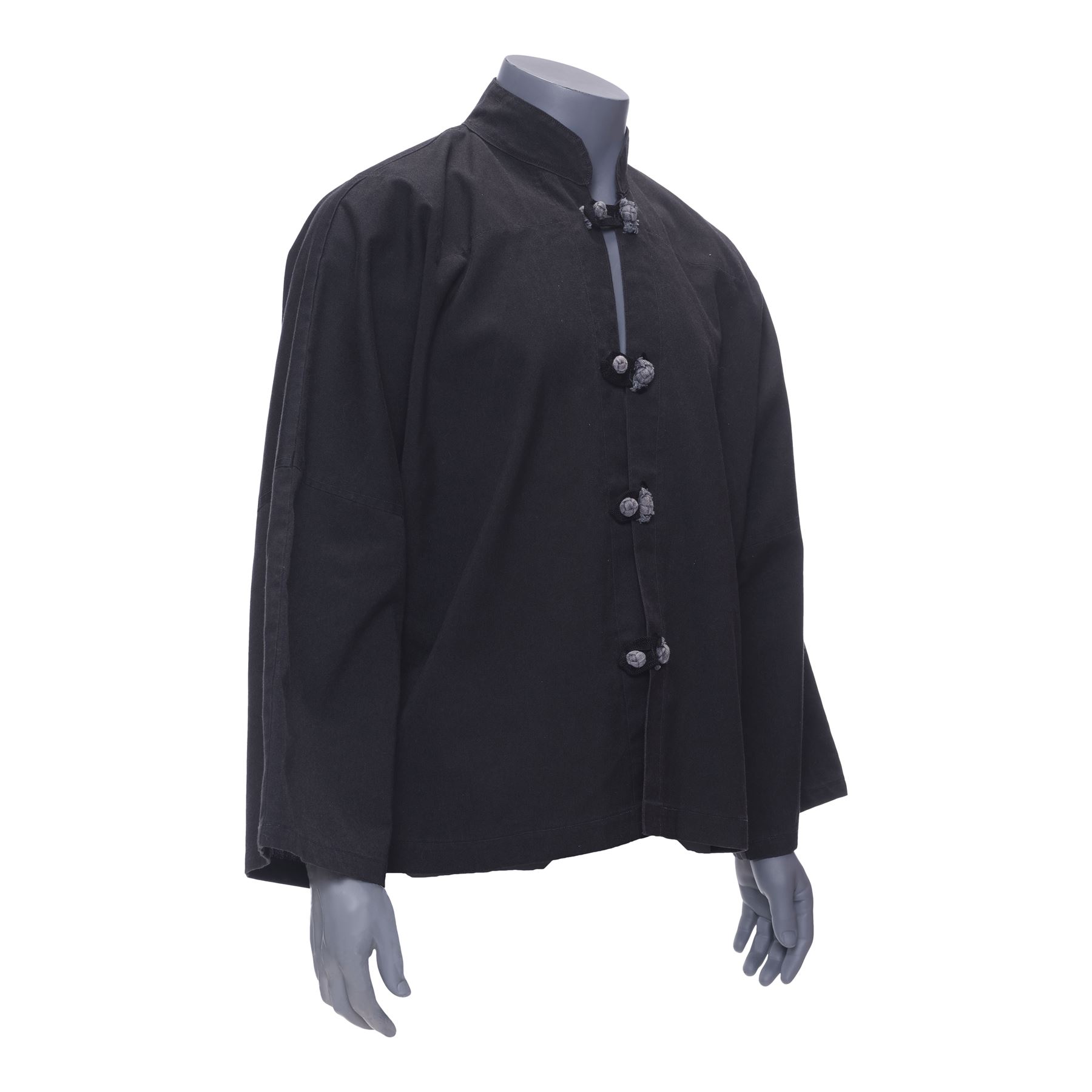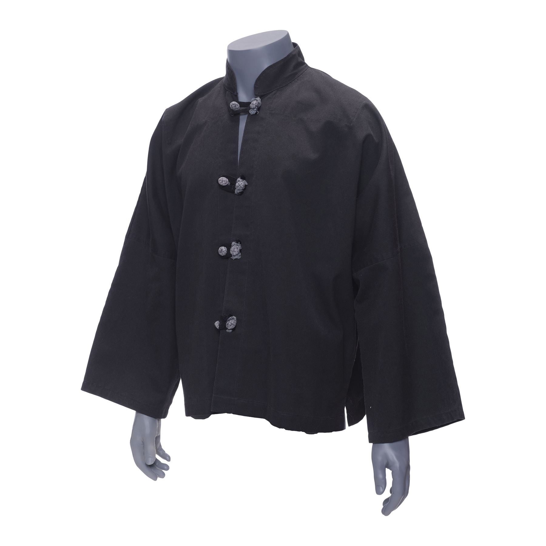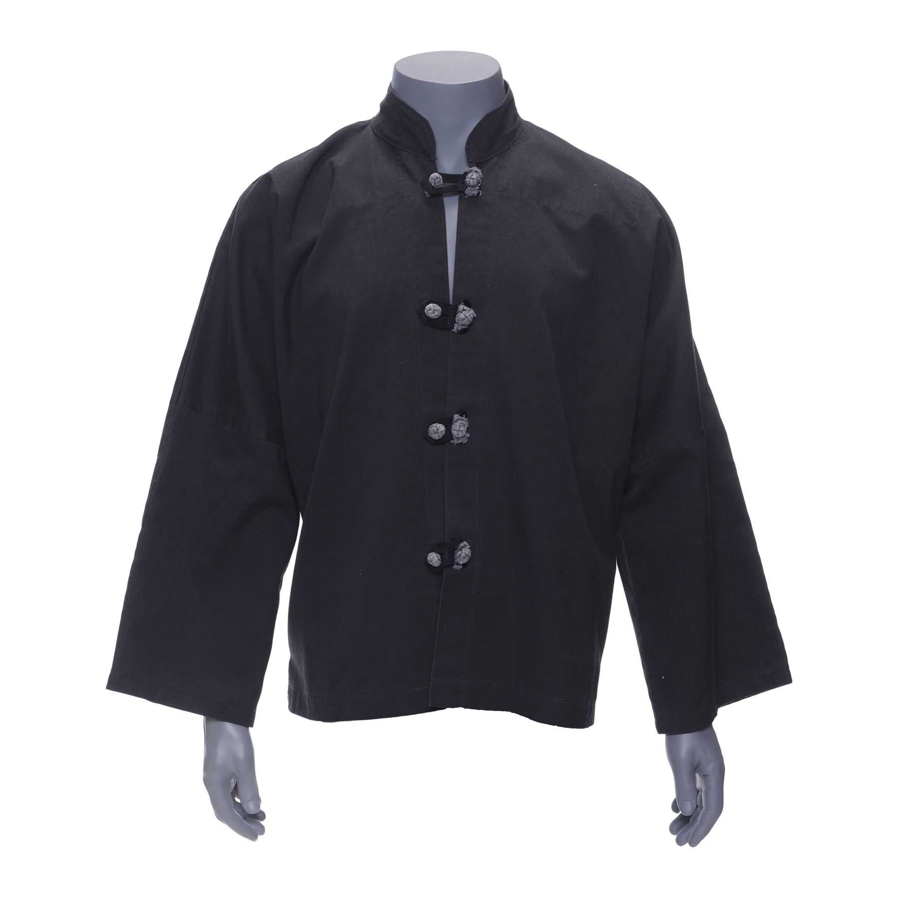 This customised black canvas jacket features a mandarin collar and four grey nylon buttons with corresponding loops. Also included is a Letter of Authenticity from Lee's student Taky Kimura stating that the martial arts master personally owned and wore this jacket. The jacket exhibits minor fraying fabrics on the buttons and loops, as well as discolouration from age.